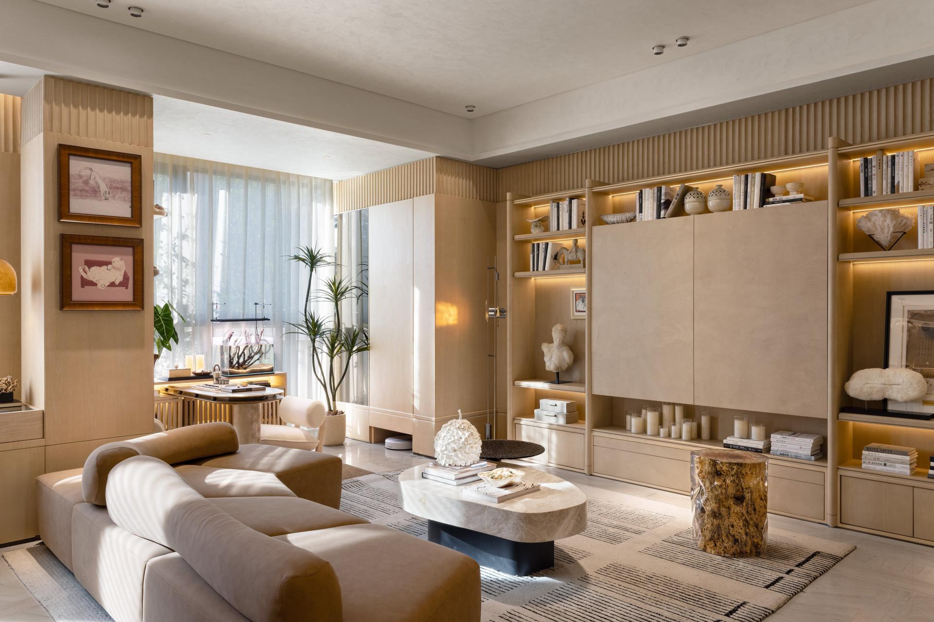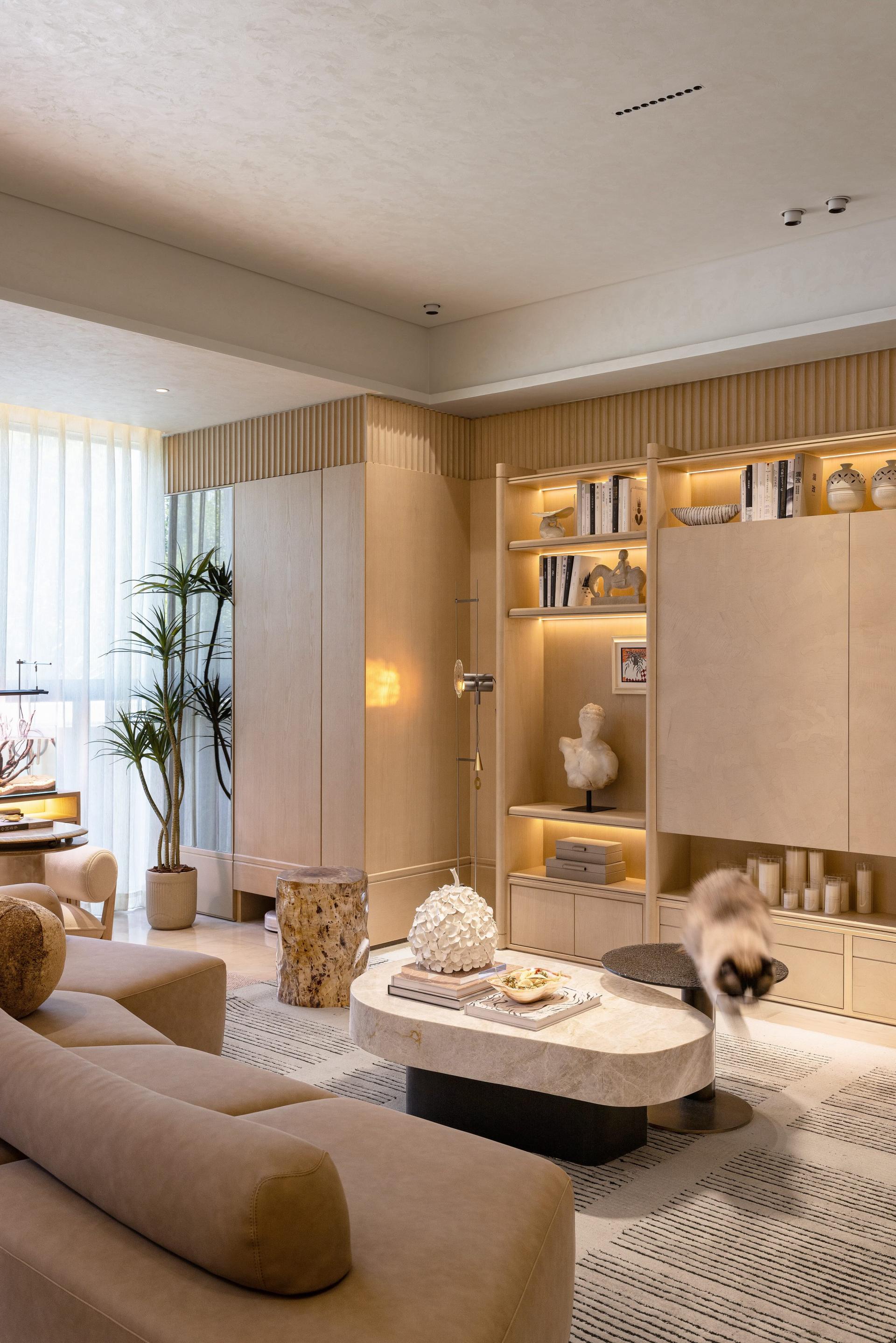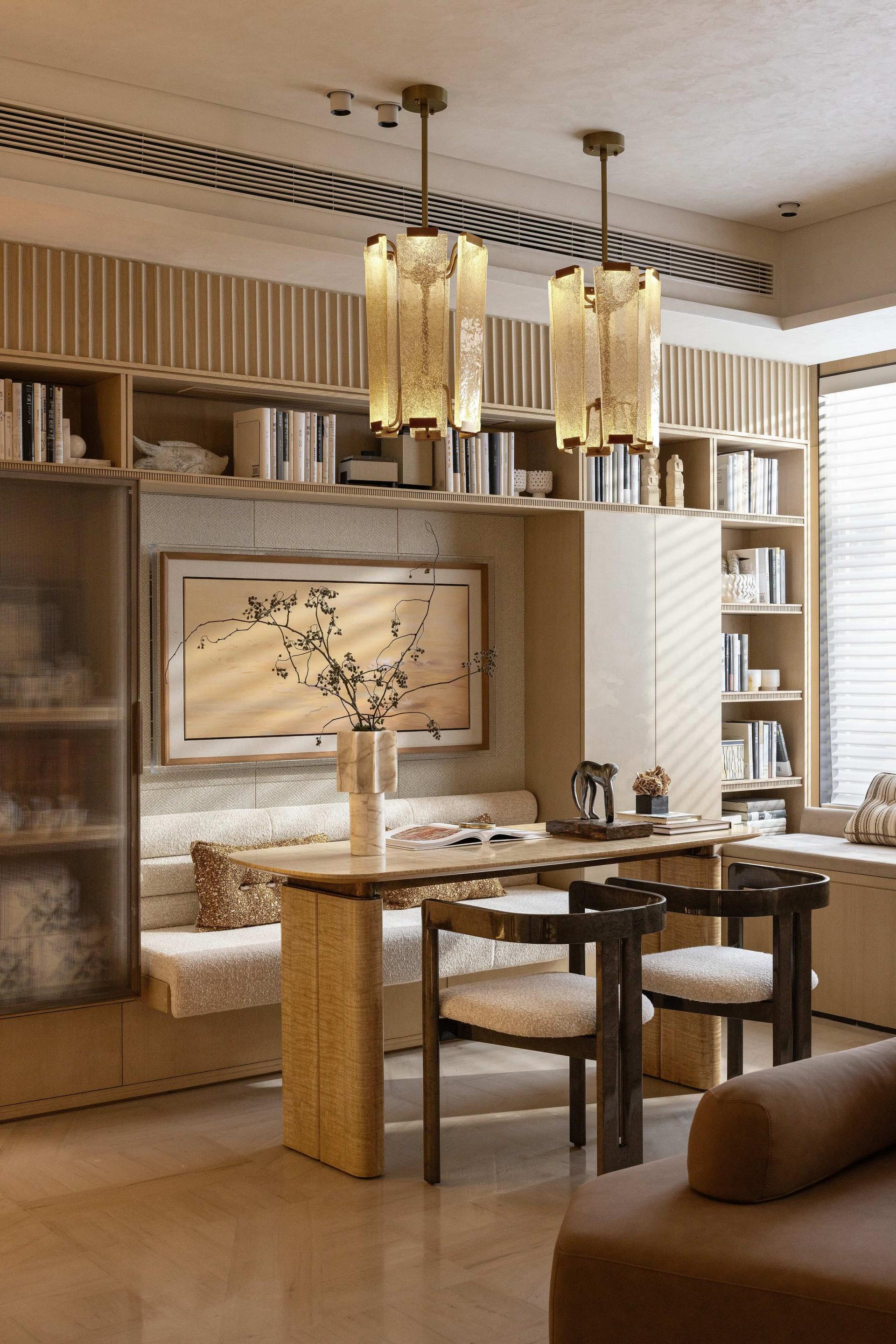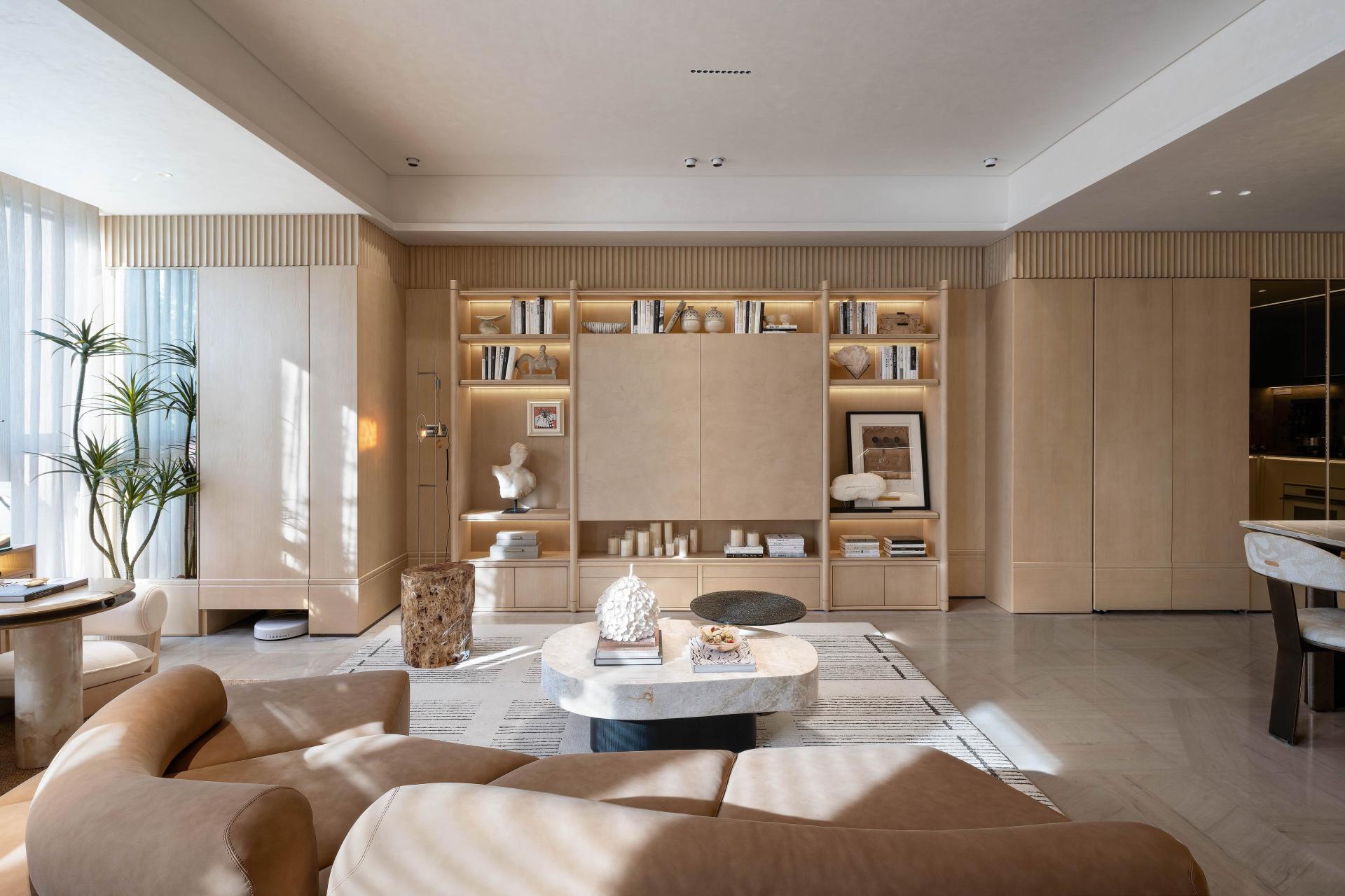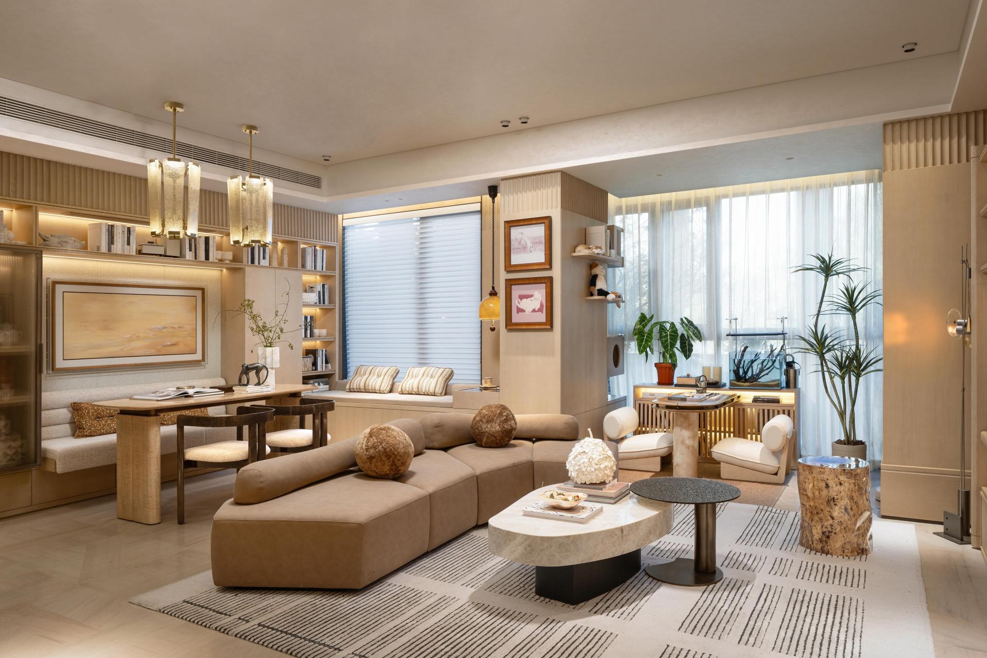 This model home blends light-toned oak, curved furnishings, and natural marble to craft a soothing yet sophisticated urban sanctuary. Gentle arcs in the furniture soften the space, while the interplay of wood grain and stone veins adds organic elegance. The palette—warm whites, soft beiges, and muted greys—creates a serene backdrop, enhanced by diffused lighting and minimalist detailing. Designed for discerning city dwellers, it balances refined aesthetics with effortless relaxation, offering a timeless escape from urban bustle.