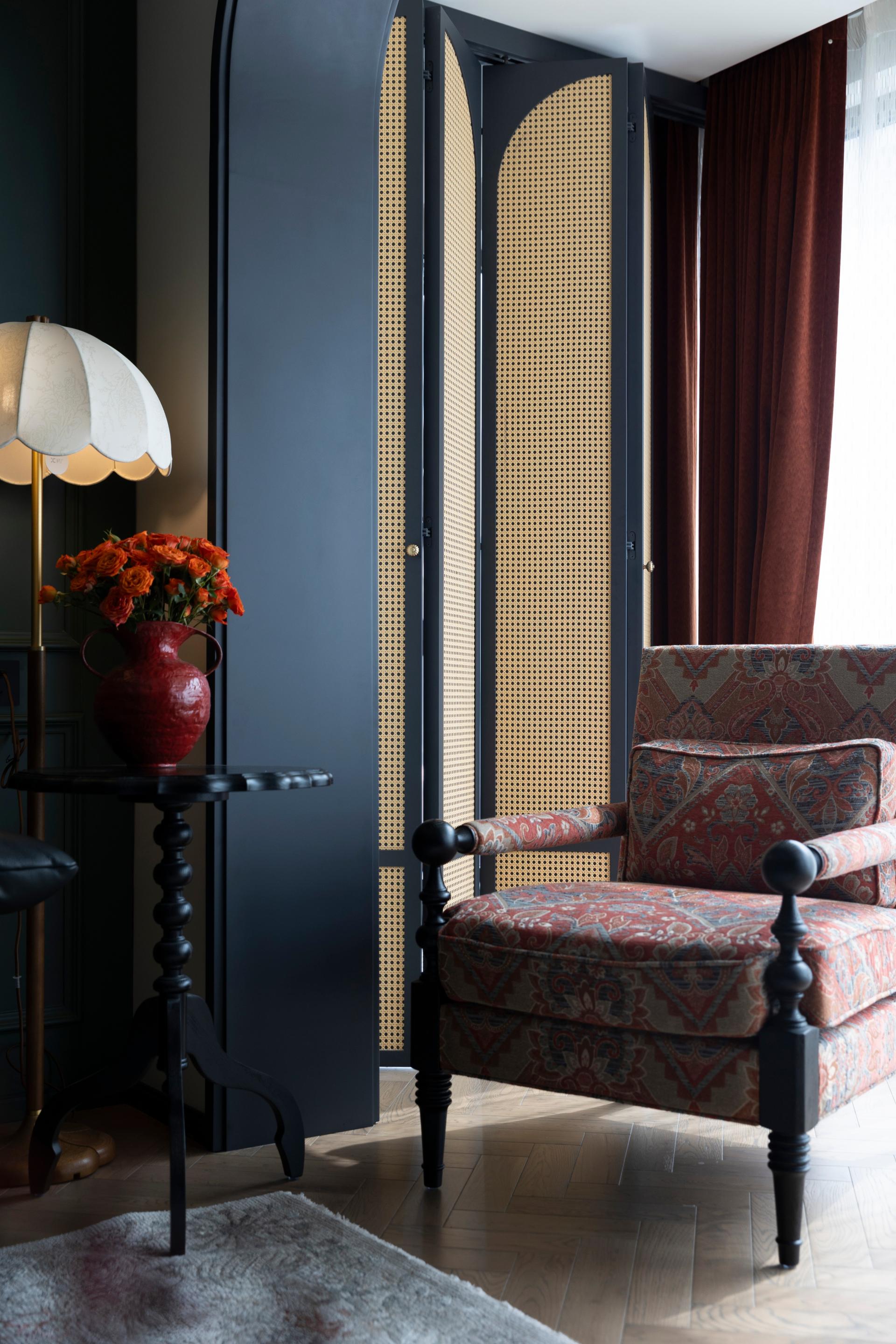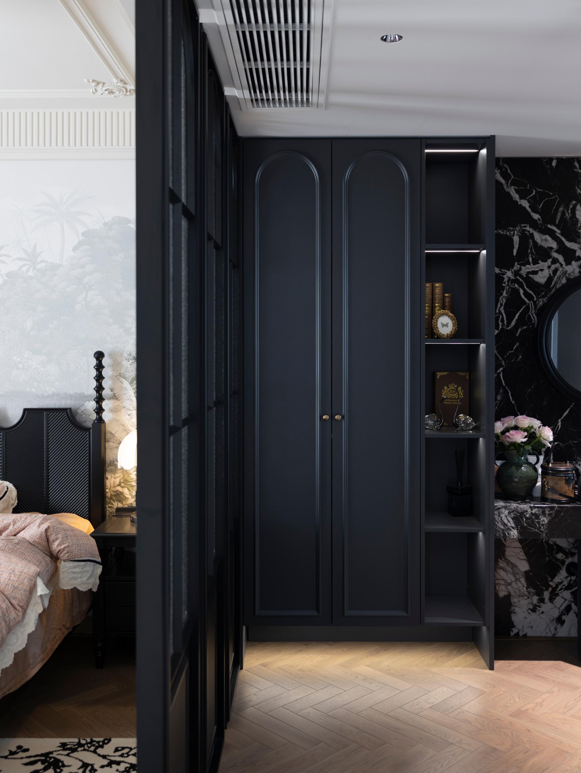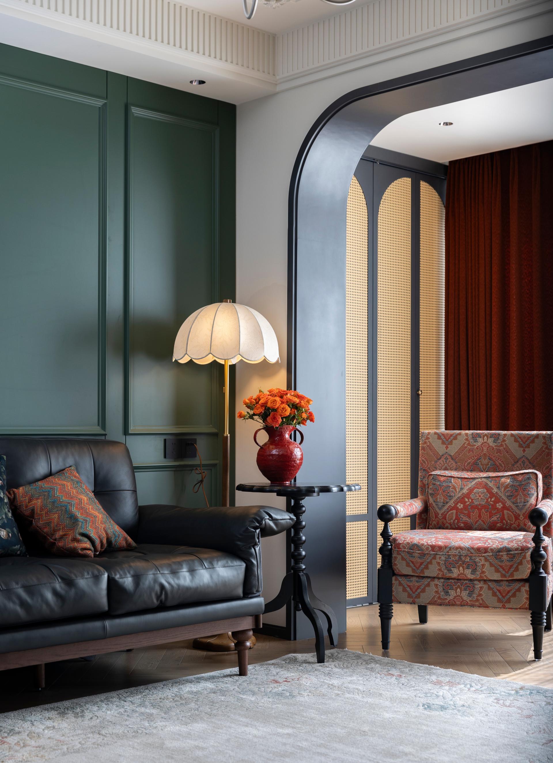 This space deliberately avoids chasing fleeting "styles." Instead, it begins with the resident's unique aesthetic, weaving together a nostalgia for the past with a pursuit of a refined quality of life. The result is a home that balances classical character with a contemporary edge. Our vision was for a space that is more than a mere backdrop, but a place that resonates emotionally with its inhabitants. The design rejects static style labels, instead establishing the "arch" as a core visual anchor that unifies the spatial flow, material palette, and functional zones. Inspiration is drawn from a fusion of European classical elegance, the relaxed ambiance of Southeast Asian colonial style, and the restraint of modernism. Every element, from the archways to the lighting and furniture, narrates a vignette from different cultures and eras. A base palette of dark green, black, and wood tones grounds the space, lending each area a distinct yet cohesive emotional mood. The arch, as the central design motif, appears not only in doorways but is also artfully integrated into the cabinet doors. Its soft curves disrupt the conventional rectilinear layout, imbuing the space with a sense of fluidity and ceremony. Expansive dark green wall paneling creates a serene atmosphere, forming a deep contrast with the black leather and lacquered furniture. A diverse material system—including rattan weaving, a Kilim-style rug, fluted glass, and brass accents—is introduced to enrich the tactile and visual layers, allowing for a natural fusion of the raw and the refined, the classic and the contemporary. Beyond aesthetic expression, we placed a strong emphasis on user experience. Storage solutions, such as the rattan cabinetry and full-height wardrobes, are seamlessly integrated into walls and partitions, addressing practical needs without compromising the visual integrity. The kitchen features an L-shaped workflow and a split-level countertop design to enhance efficiency. A multi-layered lighting system—comprising ambient, task, and accent lighting—caters to various scenarios, providing precise support for everything from kitchen prep to bedside reading, thus achieving a perfect balance between lifestyle and design.