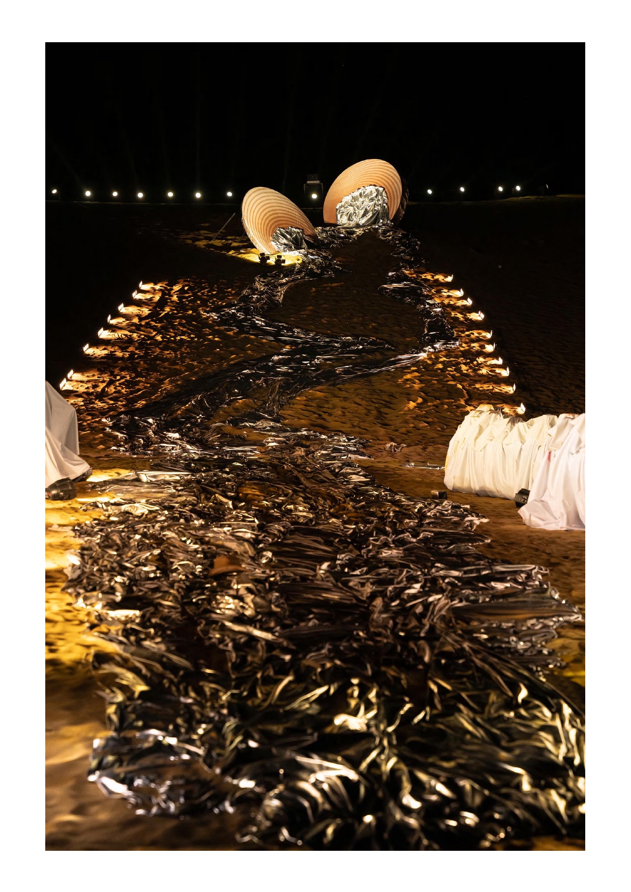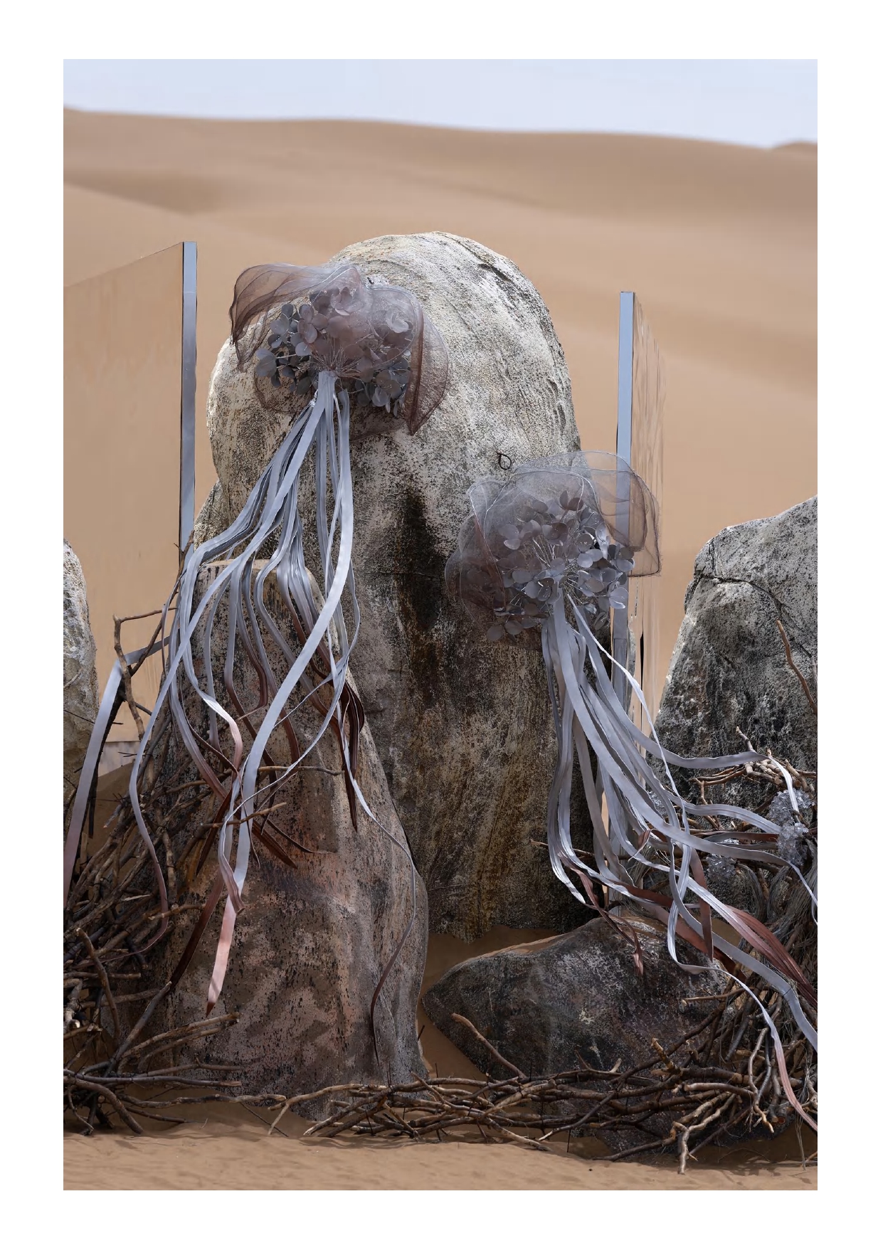 This wedding takes the newlyweds' passion for Dune as the creative starting point. The design team extracts the aesthetic images and futuristic concepts from the film, deconstructing and reorganizing them to create a surreal futuristic scene of the 21st century. With enlarged geometric forms as the main framework, it builds "realistic relics". In the mirror-refracting installations, it integrates the alien symbiosis of flowers and jellyfish. While retaining the natural wabi-sabi aesthetics of the desert, it dispels the sense of traditional order through a non-standardized layout, thus constructing a free-spirited ruin aesthetic.