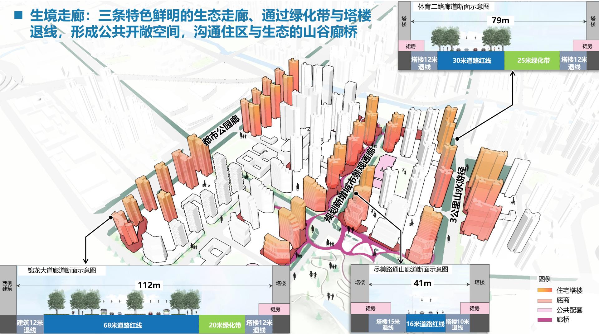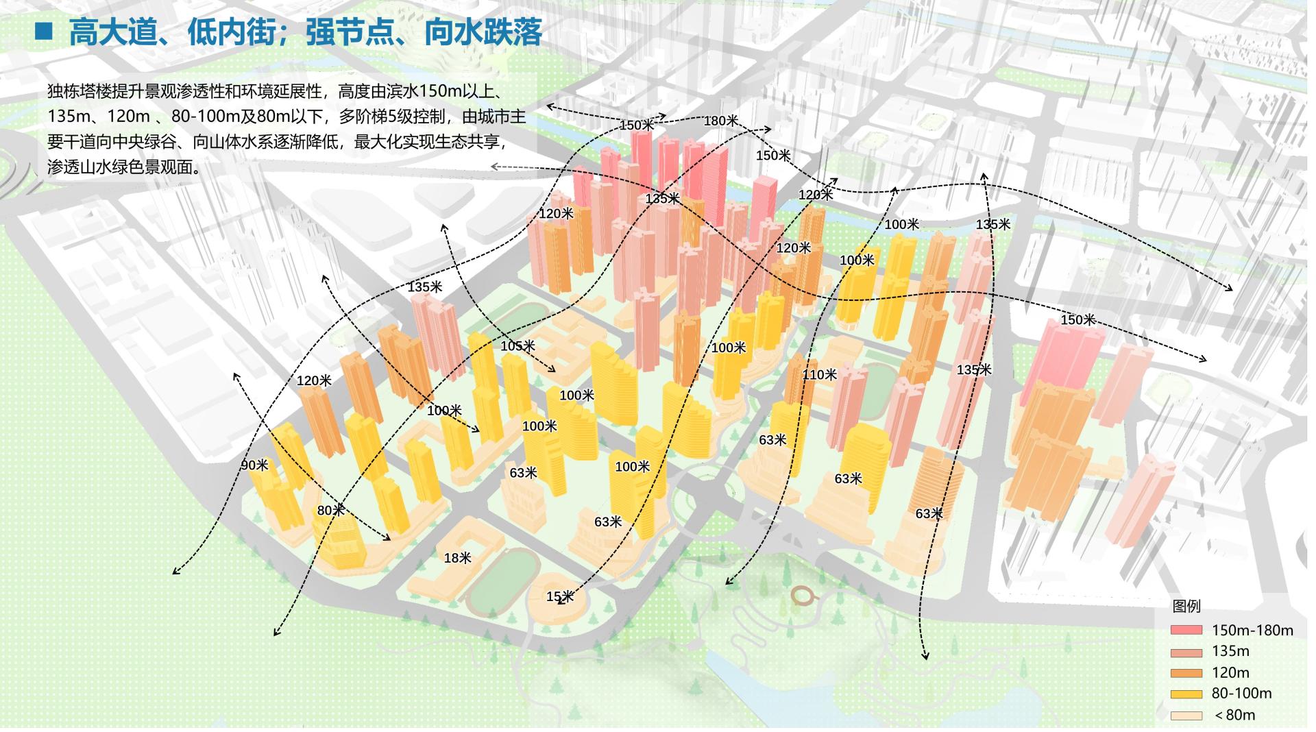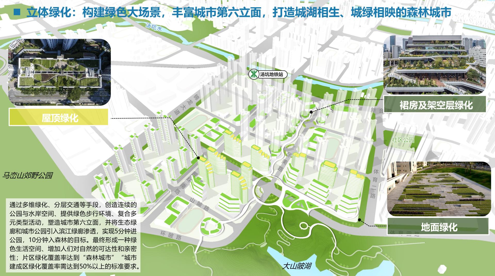 1.Mountain-Water Integration: Three vertical ecological corridors reconnect fragmented habitats for wildlife; building intensities taper from metro stations toward natural zones; waterfront structures feature wooden screens, partial hollow out designs, and elevated bases to enhance nature immersion.