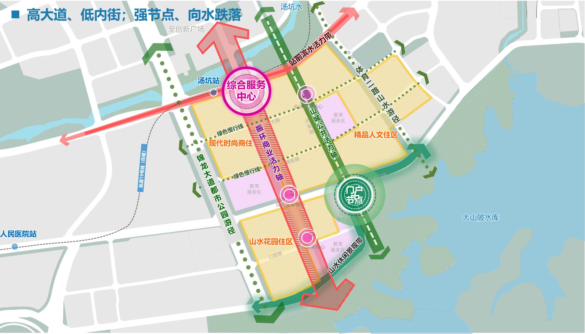 The masterplan follows the "Two Axes, Two Belts, One Core, One Gateway" spatial structure. Connected to metro stations, Zhenhuan South Road forms a dynamic commercial axis, while Jinmei Road serves as a public vitality axis linking ecological corridors between Pingshan River and Dashanpi Reservoir, culminating in a gateway node by the waterside.