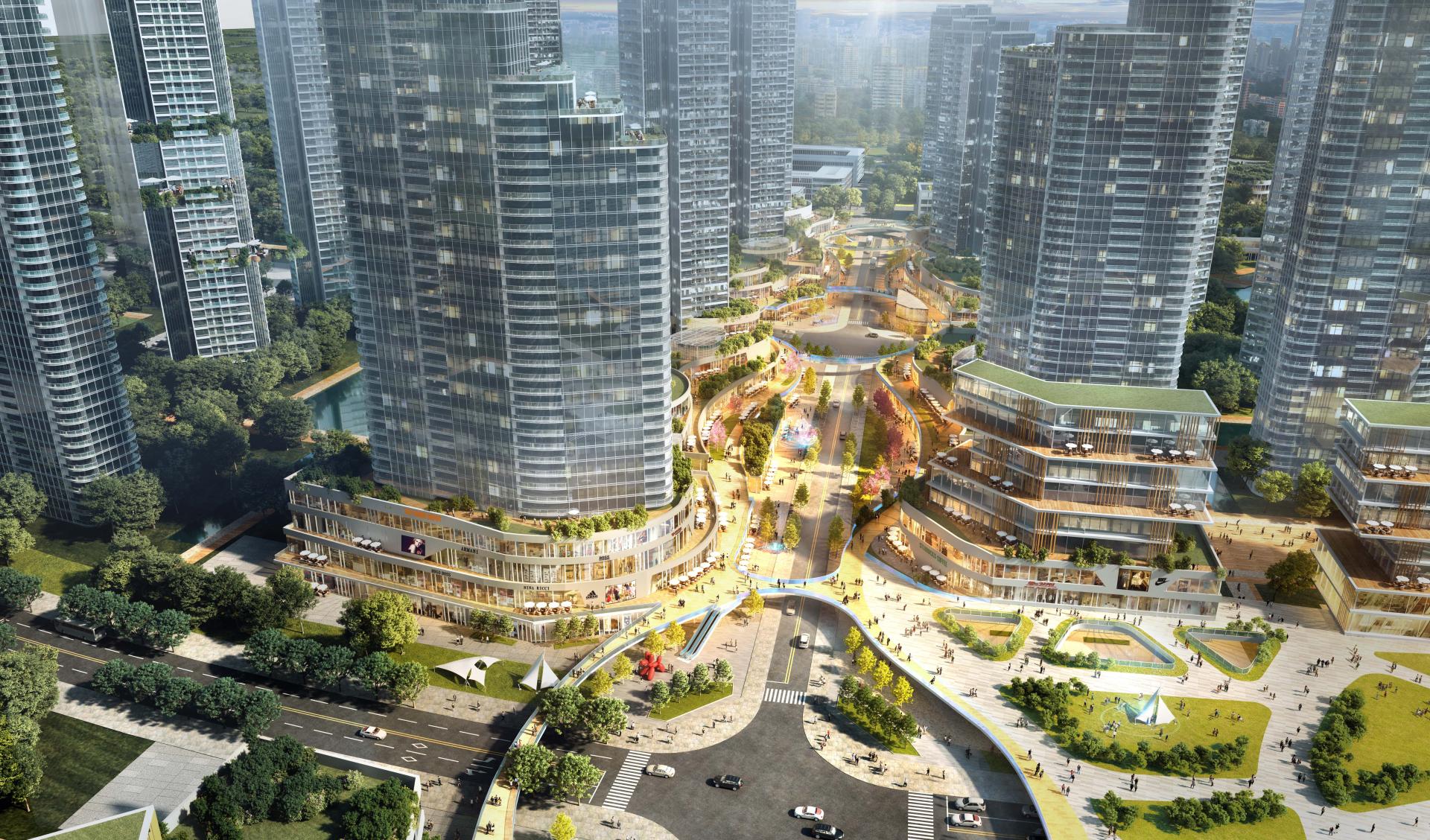 3.Urban Vibrancy: The project creates themed, immersive retail streets that incorporate metro station, residential commercial street, and the Maluan Mountain Greenway. The waterfront residential community features a slab-type enclosed layout with stepped terraces facing the water. The residential towers are arranged along the roads to maintain open and transparent spatial relationships, forming a central garden.
