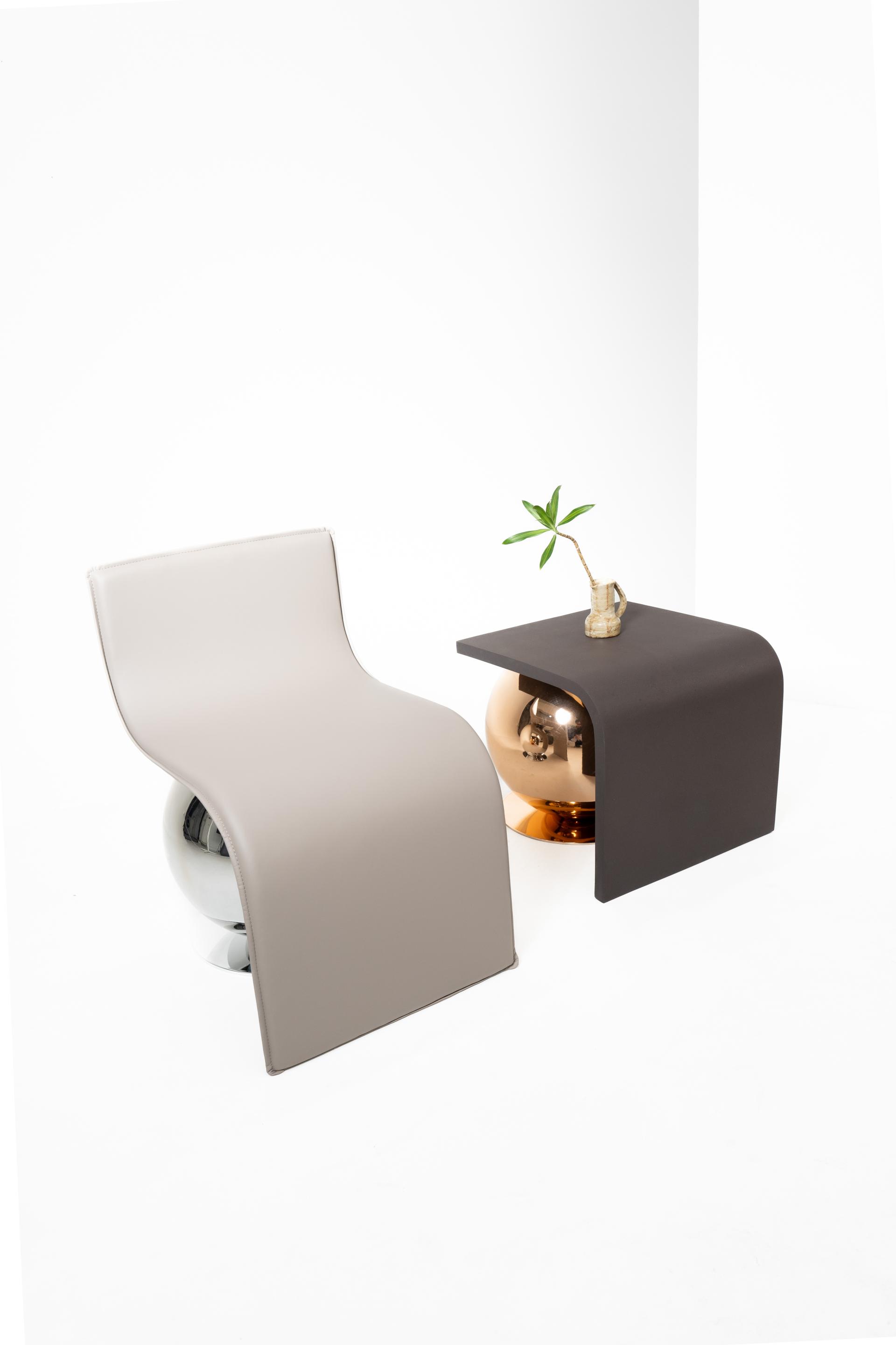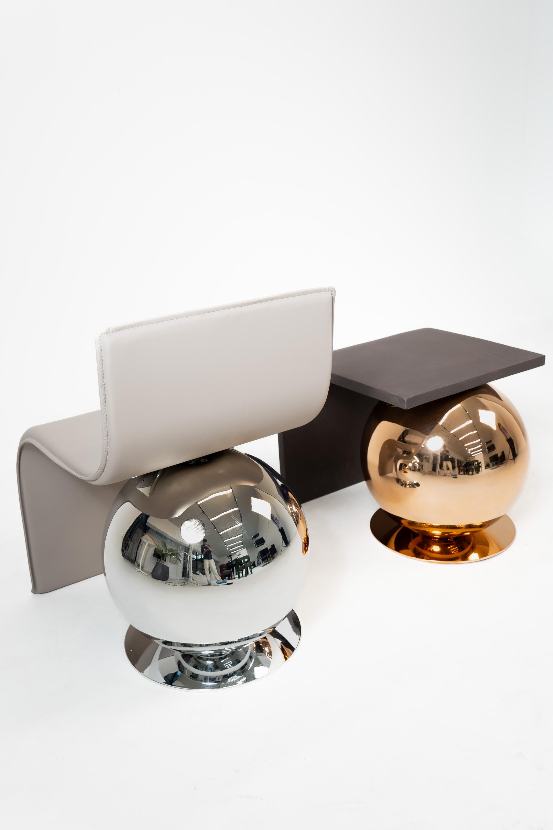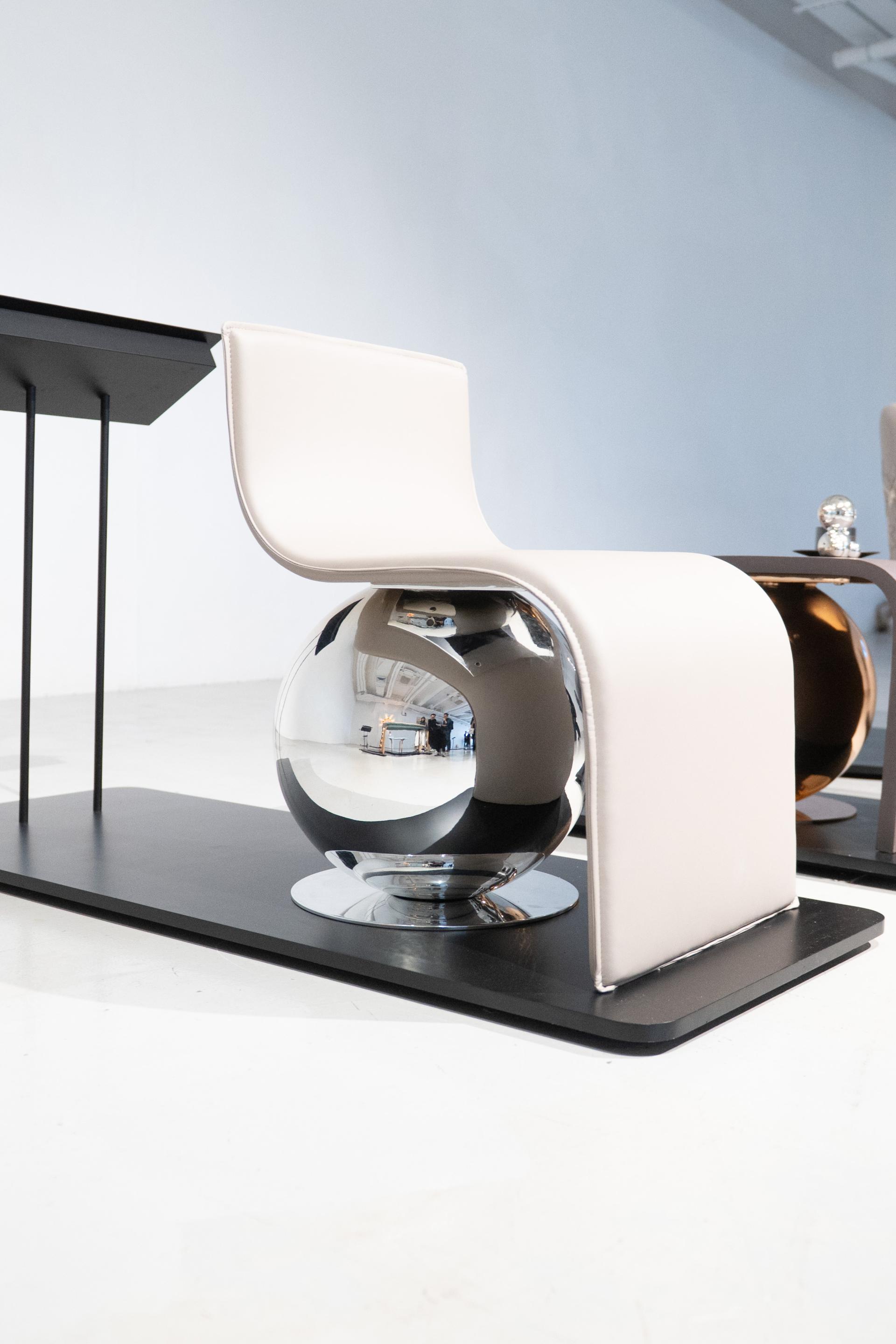 A striking support system showcases a modern sphere crafted through advanced 3D printing technology, enhancing visual appeal. The sphere is electroplated for a stunning metallic chrome finish, adding a bold, reflective quality. This combination of sleek metal and warm leather upholstery creates a harmonious balance, making it versatile for various interior styles.
