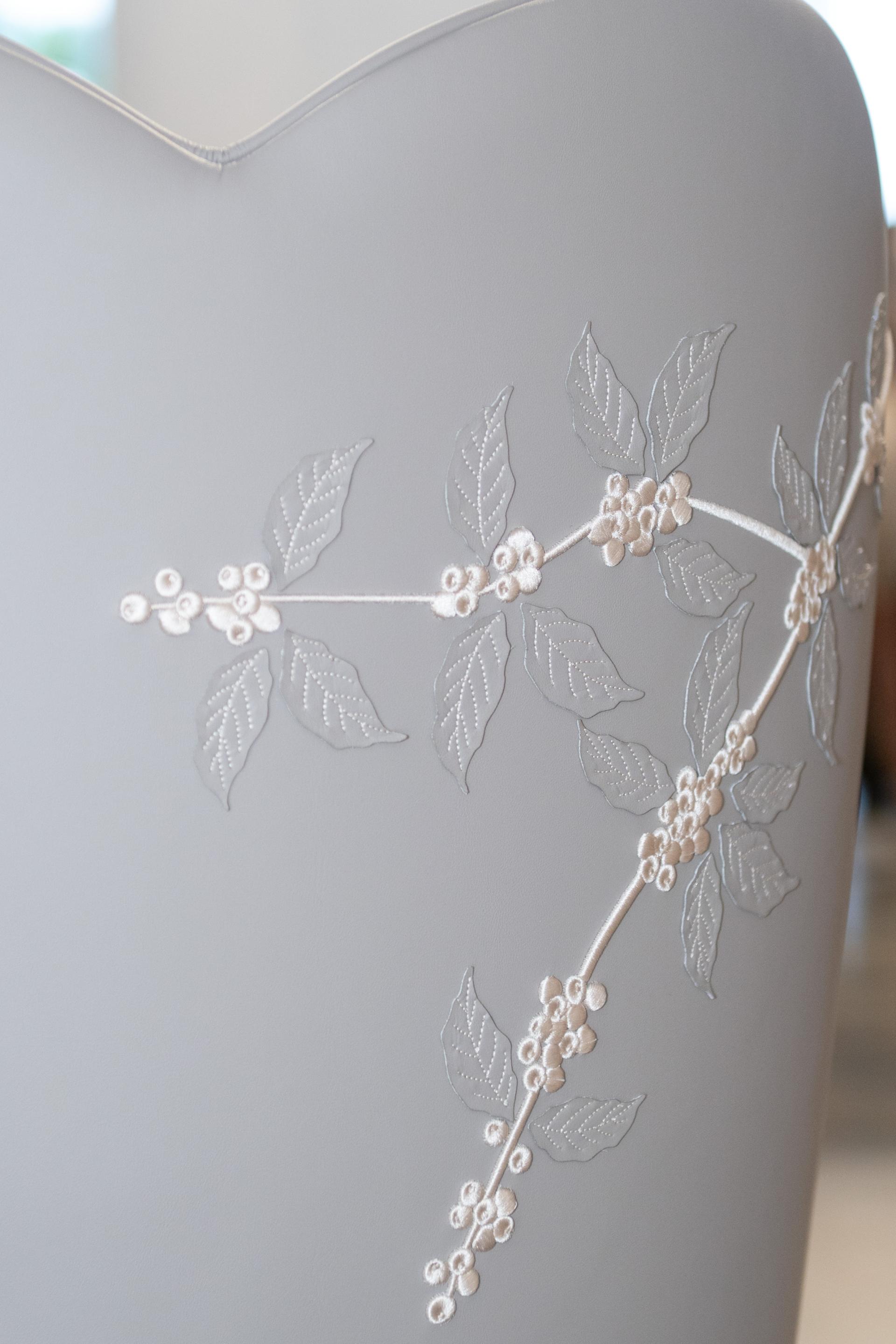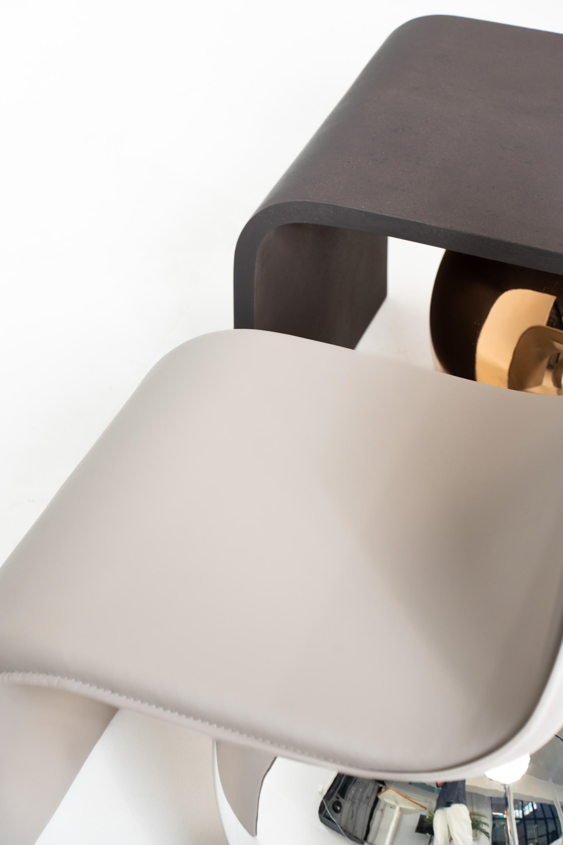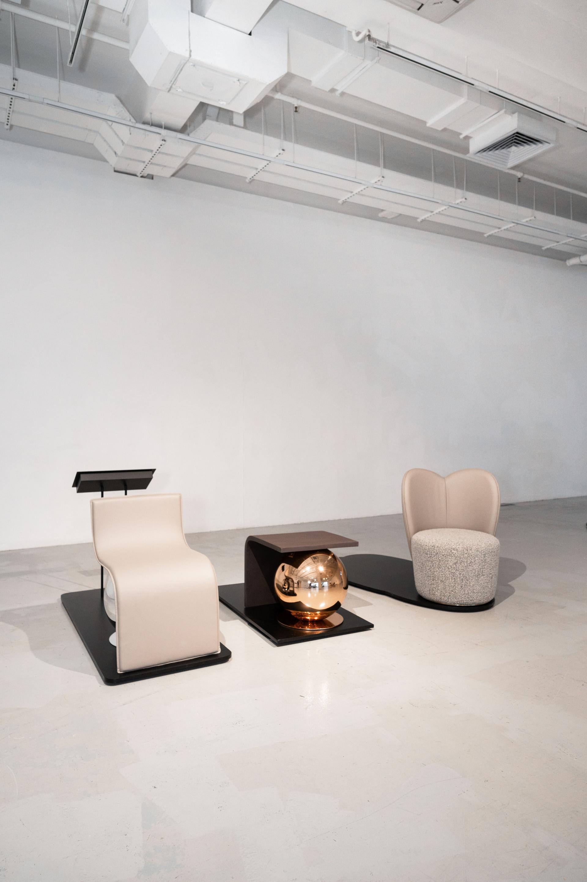 Complementing the armchair is a meticulously designed coffee table with the same innovative sphere support. The tabletop, crafted from repurposed coffee grounds, enhances its sustainable appeal and gives new life to waste. The table allows for customization of colors, enabling users to personalize their space.