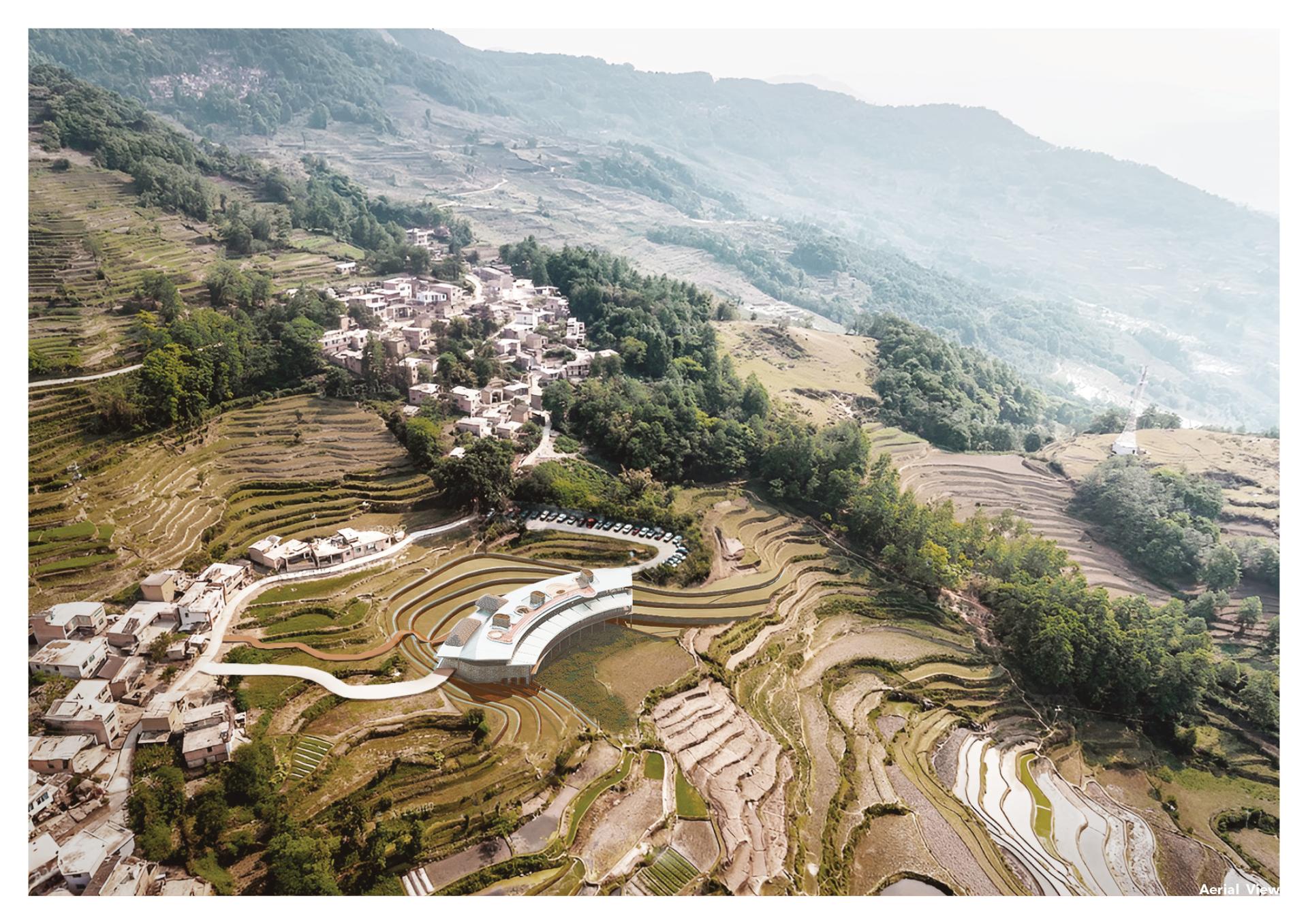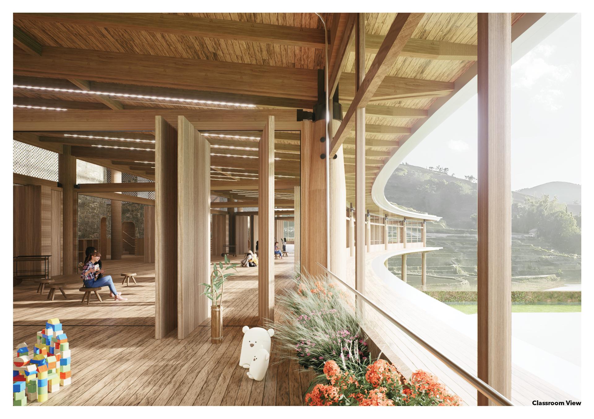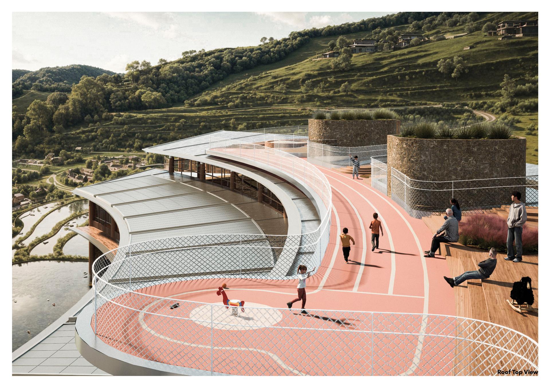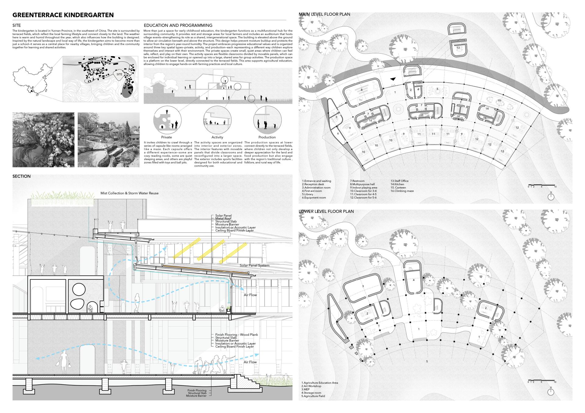 Located in Yunnan’s iconic terraced fields, this kindergarten serves as both an educational and community space. Inspired by the stepped terrain, the curved design integrates classrooms, interior activity spaces, farmer rest areas, and rooftop sports facilities. Children engage with local ecology and agricultural production through outdoor platforms. Flexible learning spaces and sustainable features—natural ventilation, solar power, , mist irrigation and storm water reuse—support a low-impact footprint. The school fosters cultural continuity, ecological awareness, and community resilience.