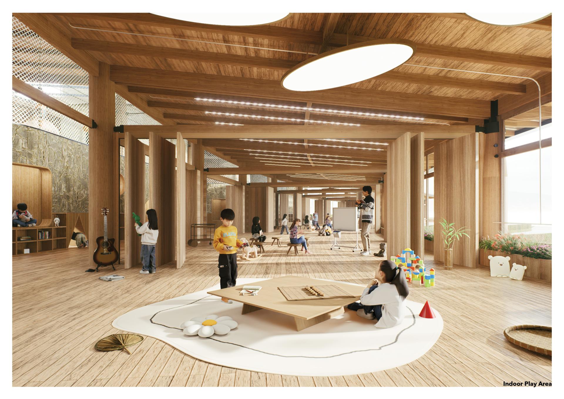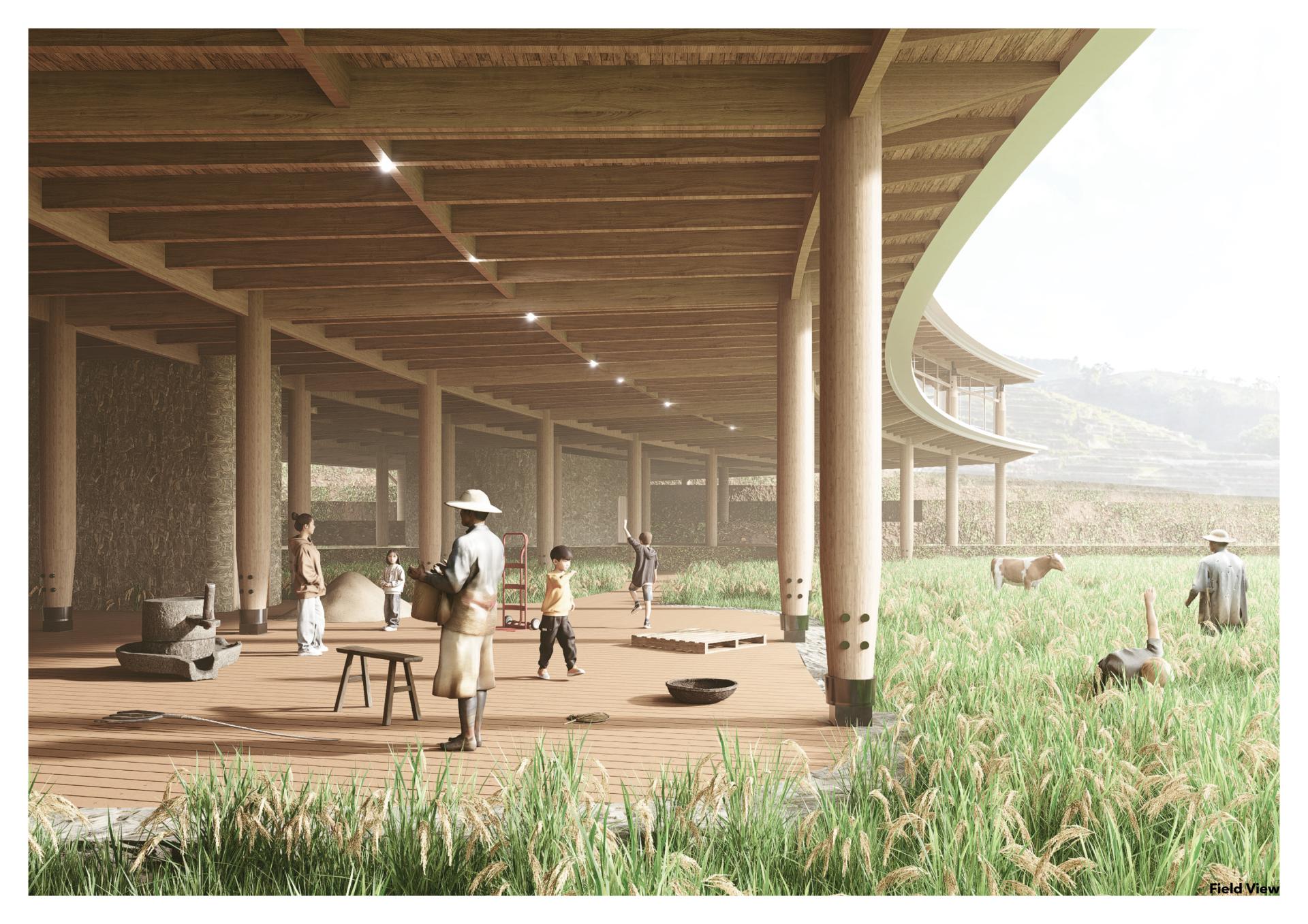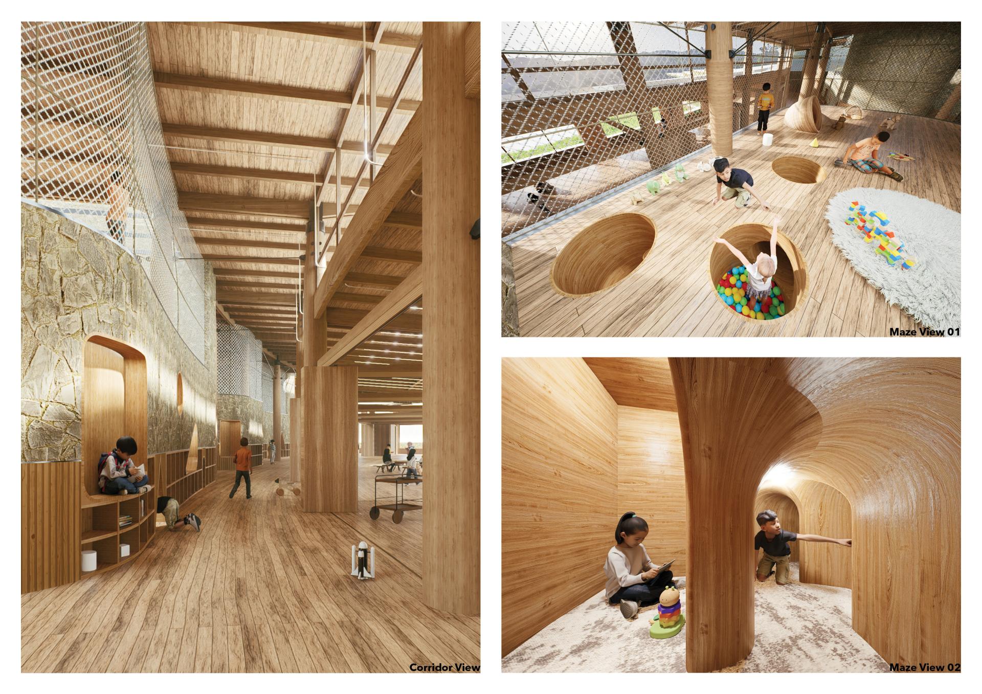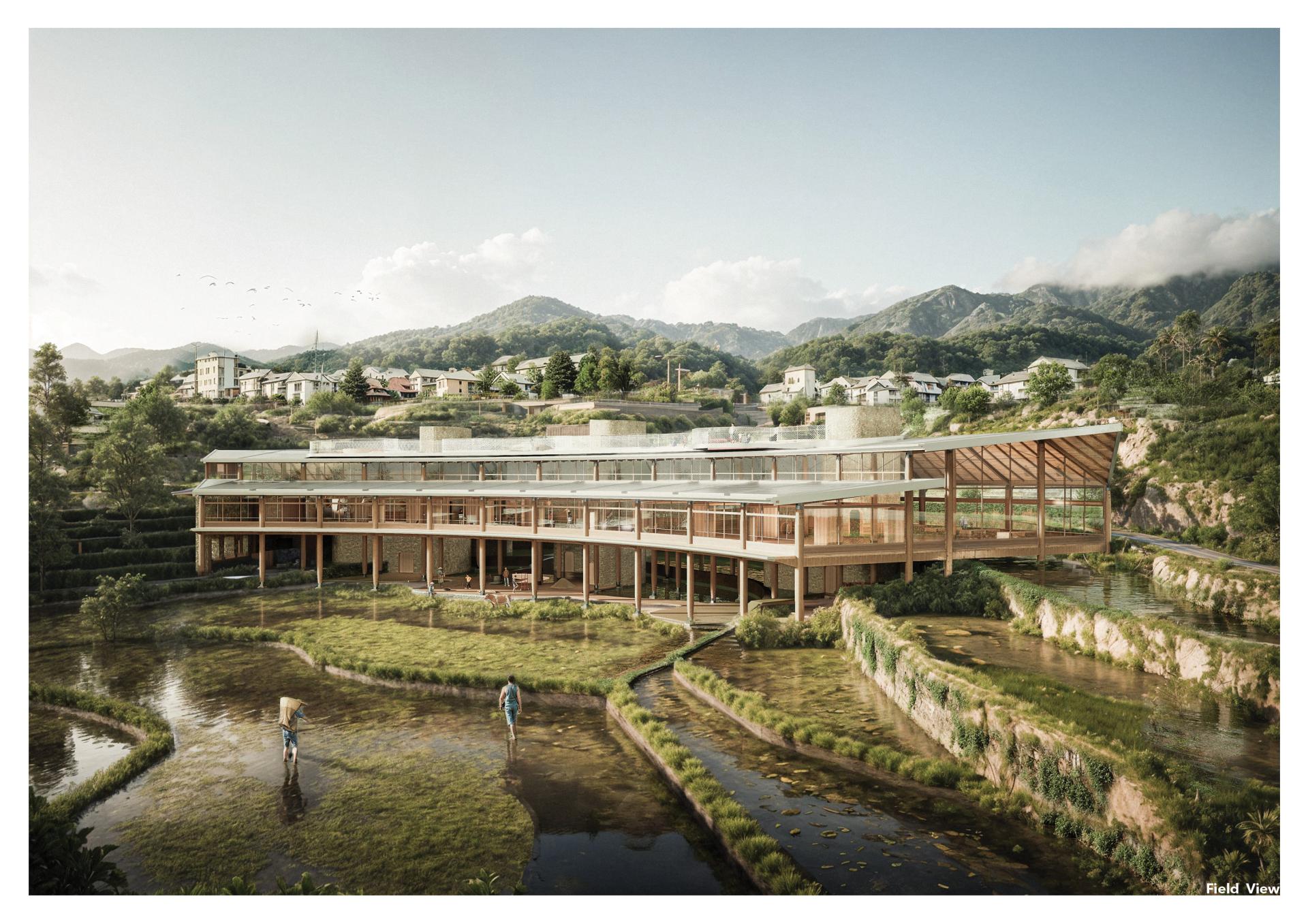Located in Yunnan’s iconic terraced fields, this kindergarten serves as both an educational and community space. Inspired by the stepped terrain, the curved design integrates classrooms, interior activity spaces, farmer rest areas, and rooftop sports facilities. Children engage with local ecology and agricultural production through outdoor platforms. Flexible learning spaces and sustainable features—natural ventilation, solar power, , mist irrigation and storm water reuse—support a low-impact footprint. The school fosters cultural continuity, ecological awareness, and community resilience.