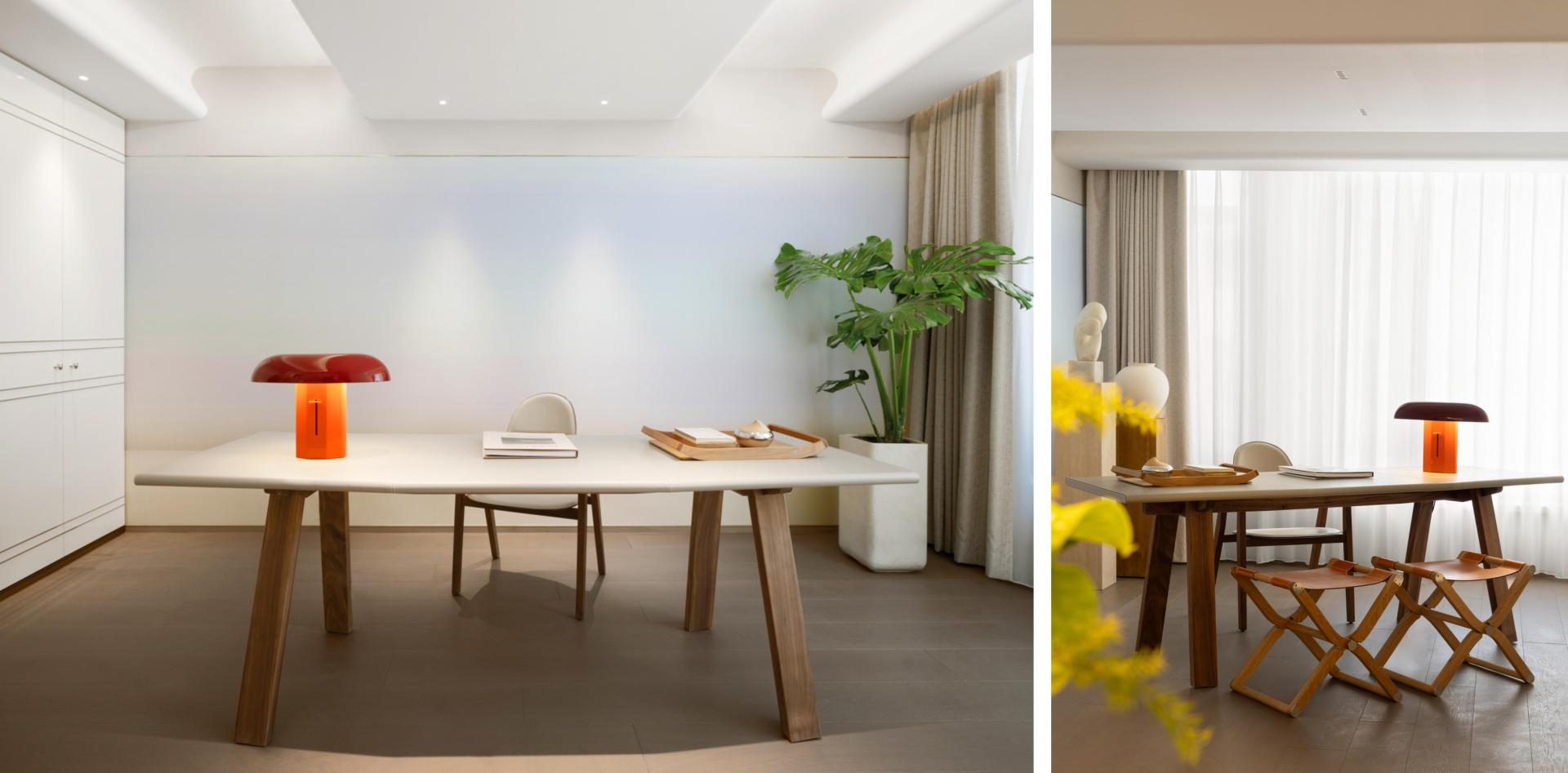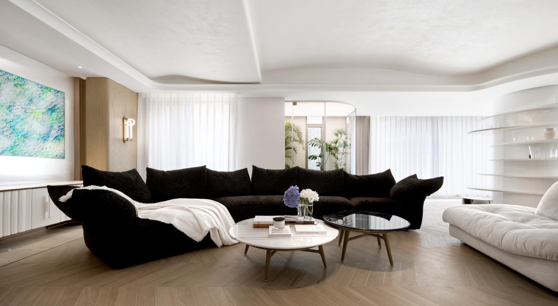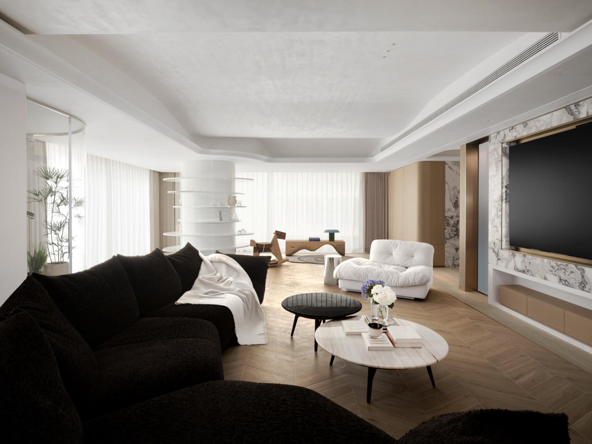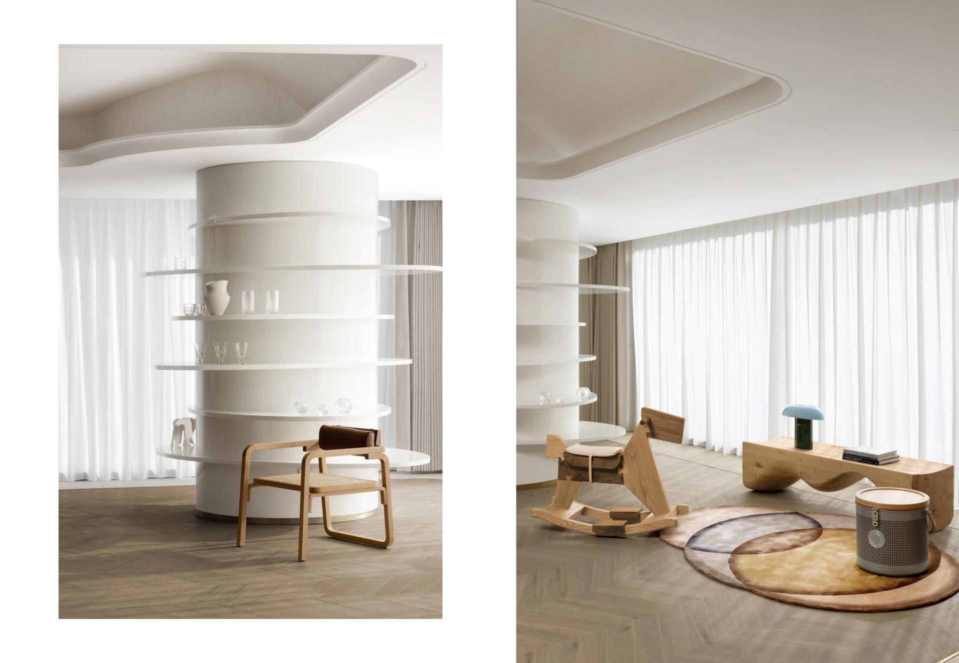 project is located in the CBD of Xi'an New District, and the owners have studied abroad for many years and have received multicultural influences. FL+Design team took this as an opportunity to reorganize the definition of “home” for them. The designer cleverly handled the abrupt beams and columns. The ceiling naturally forms waves, and the columns are surrounded by display shelves, with random shapes that resemble a gentle breeze. The clever design makes them part of the functional and aesthetic design, blending seamlessly with the space. When the artistic design language meets with the life trajectory of the residents, the space becomes a flowing dialogue, which is not only a game of rationality and sensibility, but also a symbiosis of functionality and poetry. Designers creates not only a container for furniture, but also a growing art space, where the clients' stories continue to ferment, and ultimately create unique spatial imprints.