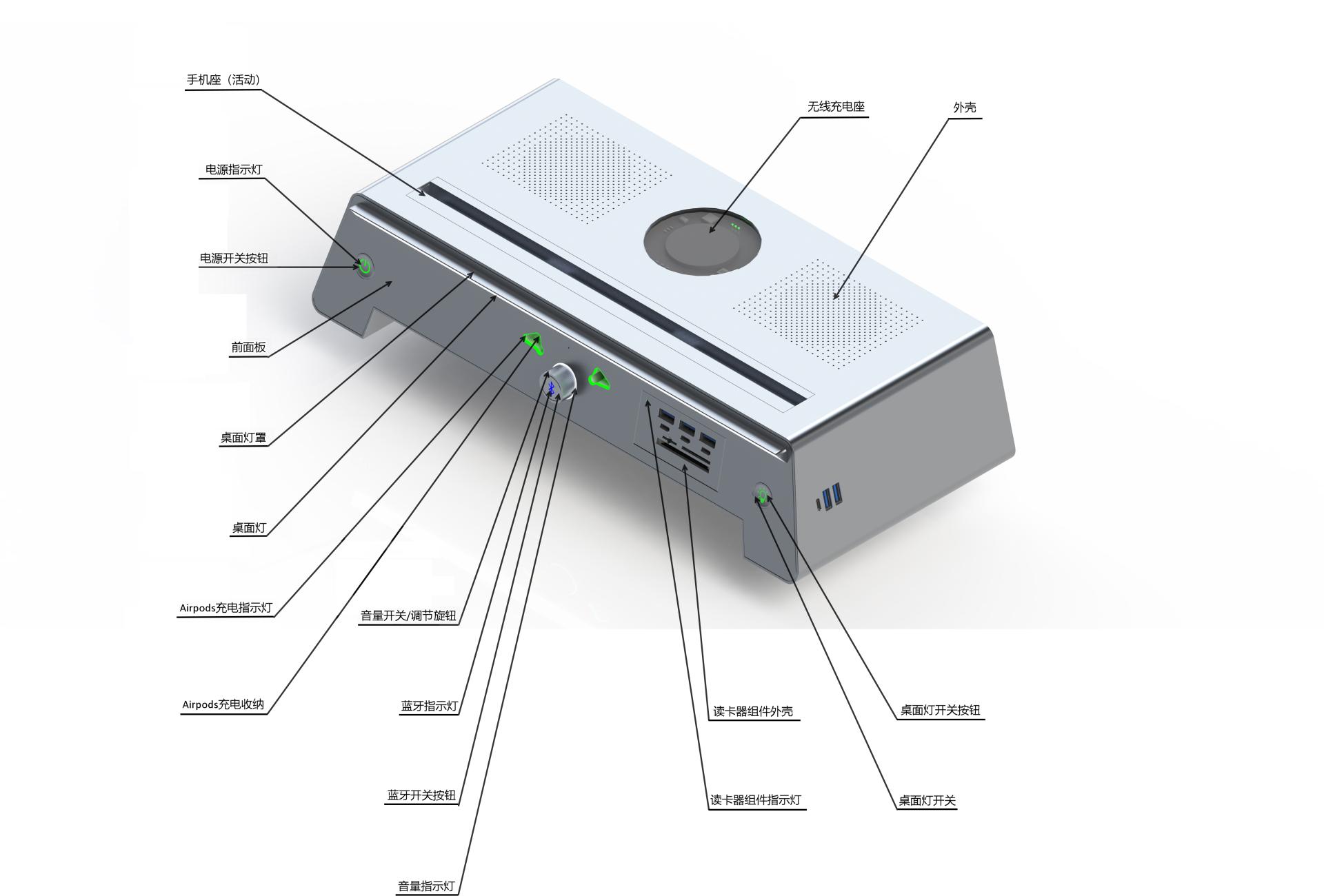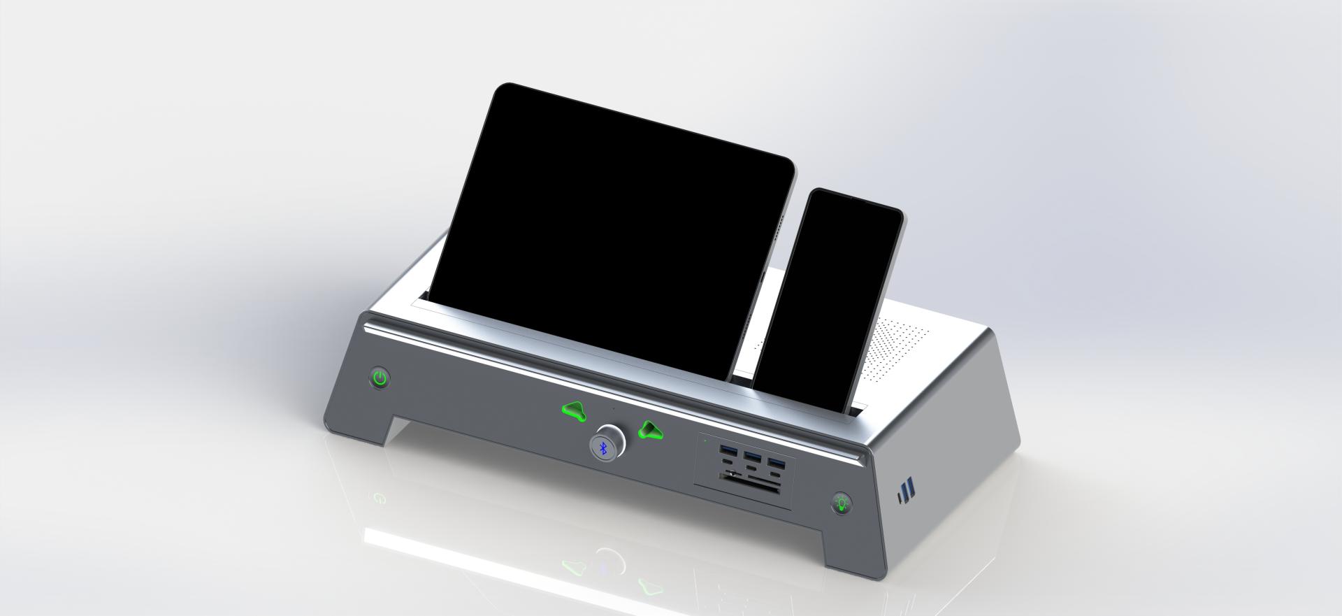 (3) It functions both as a monitor riser and a desktop speaker, while integrating wired or wireless charging for today’s personal consumer electronics—iPhone, iPad, Apple Watch, AirPods, and more.