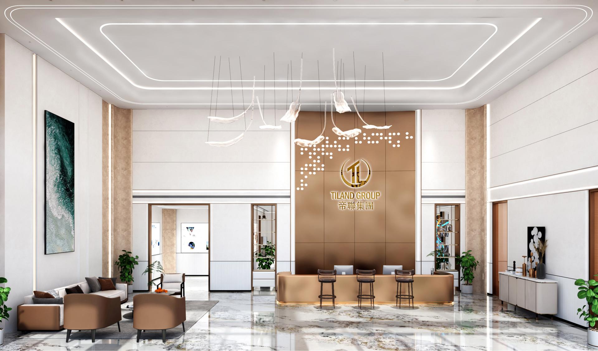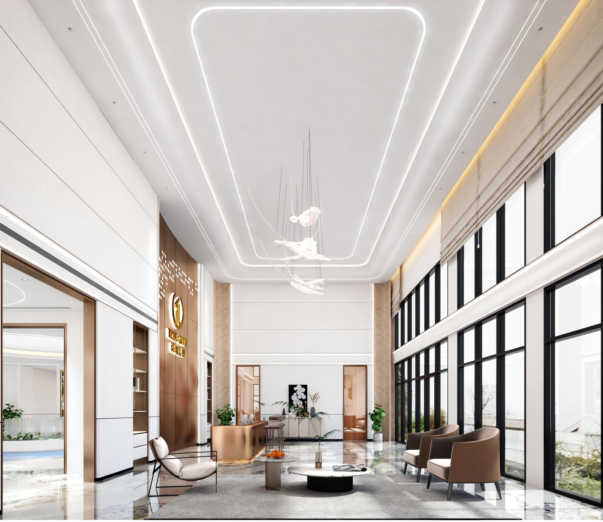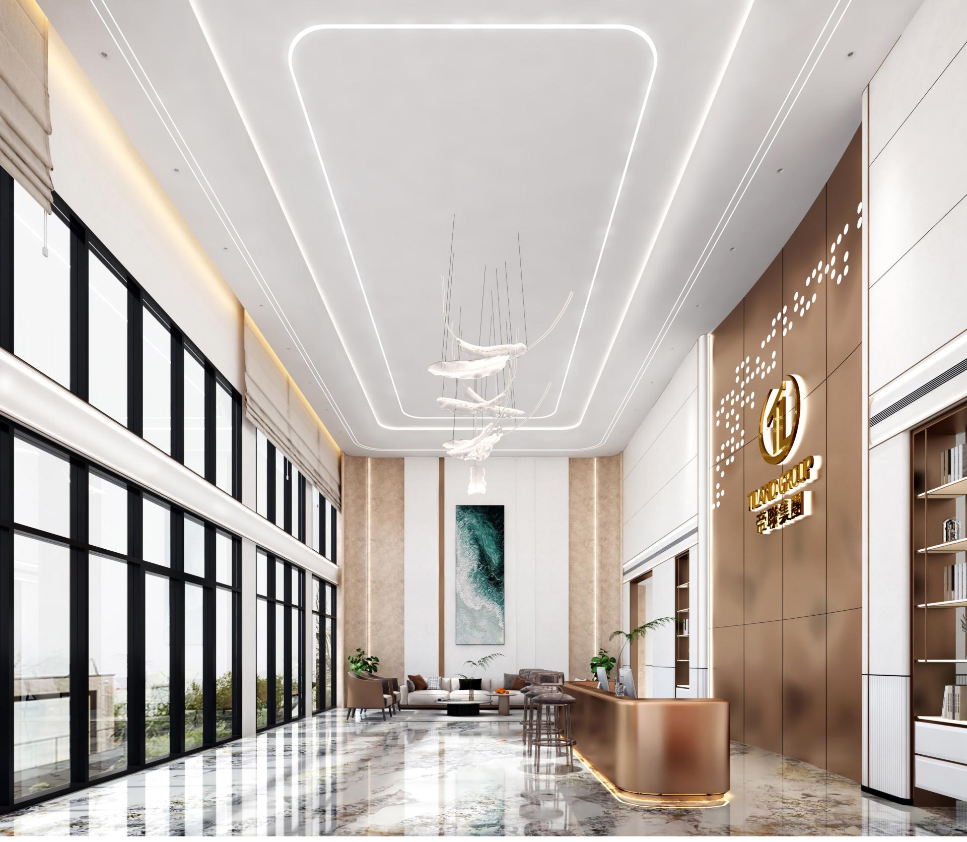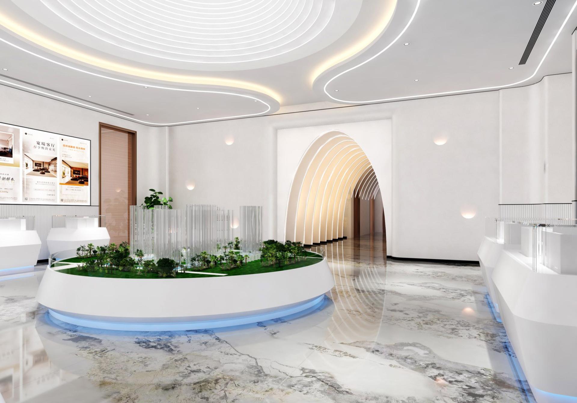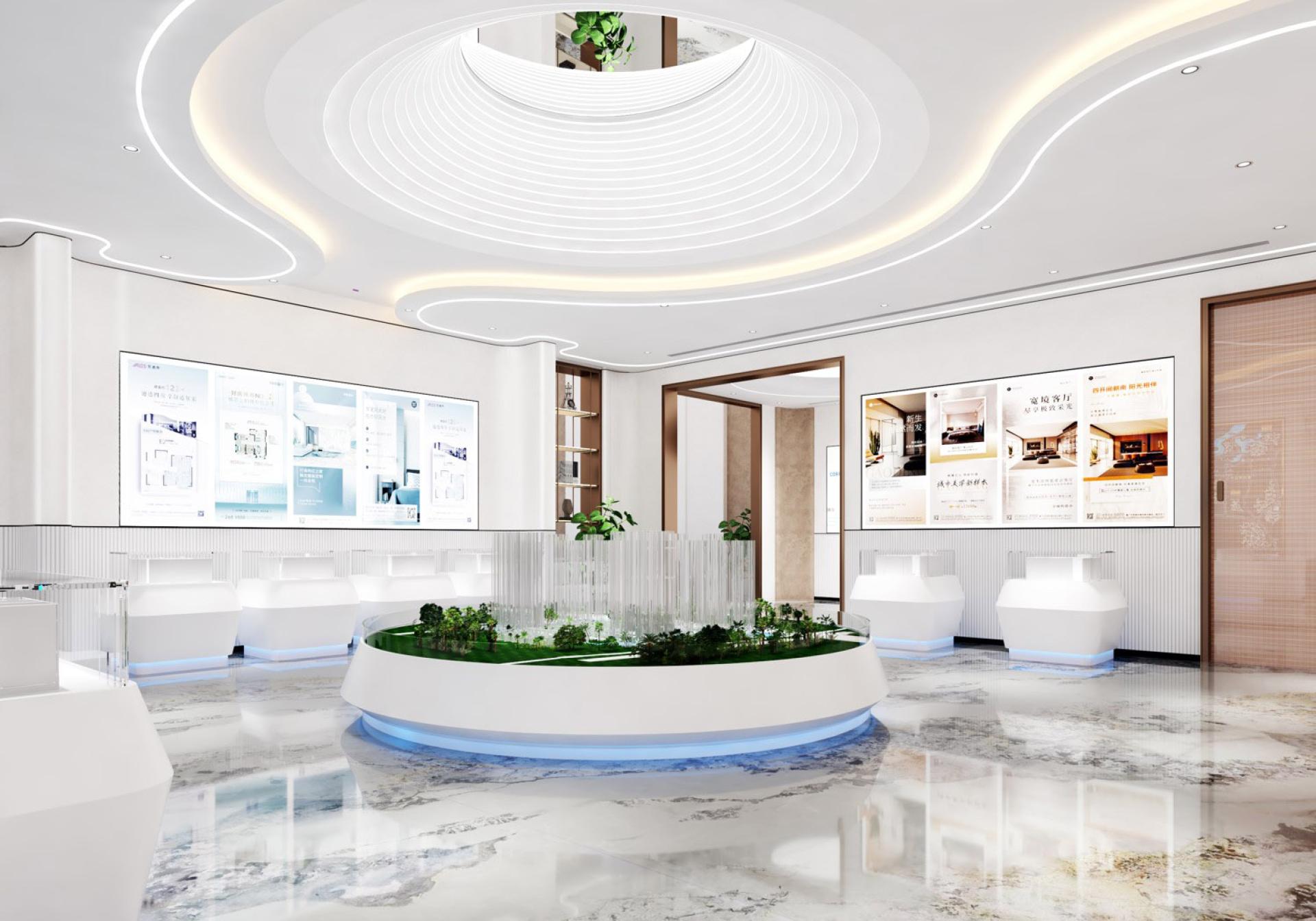 This design integrates technology, environmental protection and humanistic care to create a multi-functional experience space. The en-trance is a white-toned reception hall with golden decorations. In the center, there is a display area of the property model, and it is close to the reception desk for convenient consultation. The interior is equipped with a leisure area, a negotiation area and a children's area. Corridors connect all areas to ensure smooth movement.