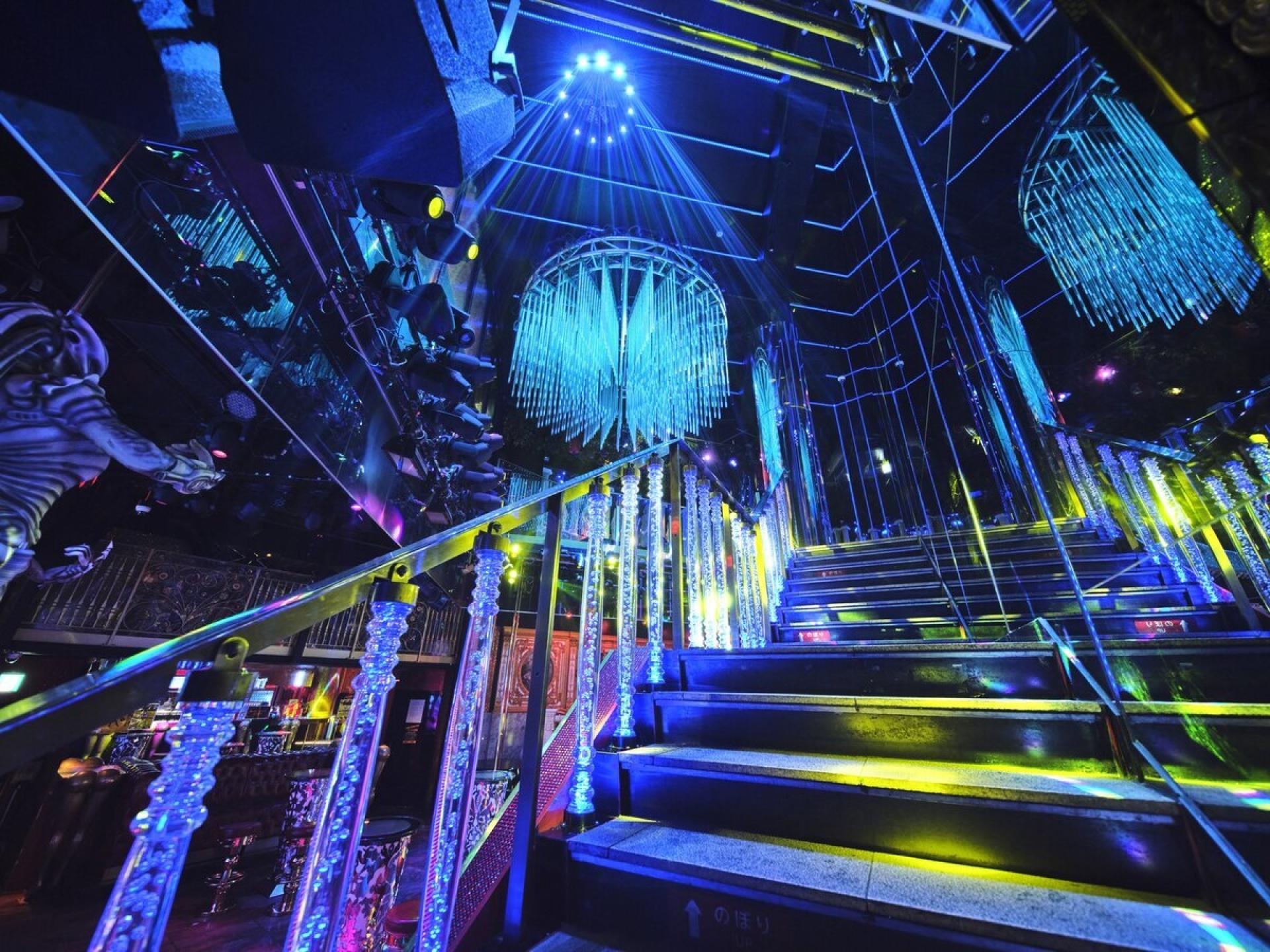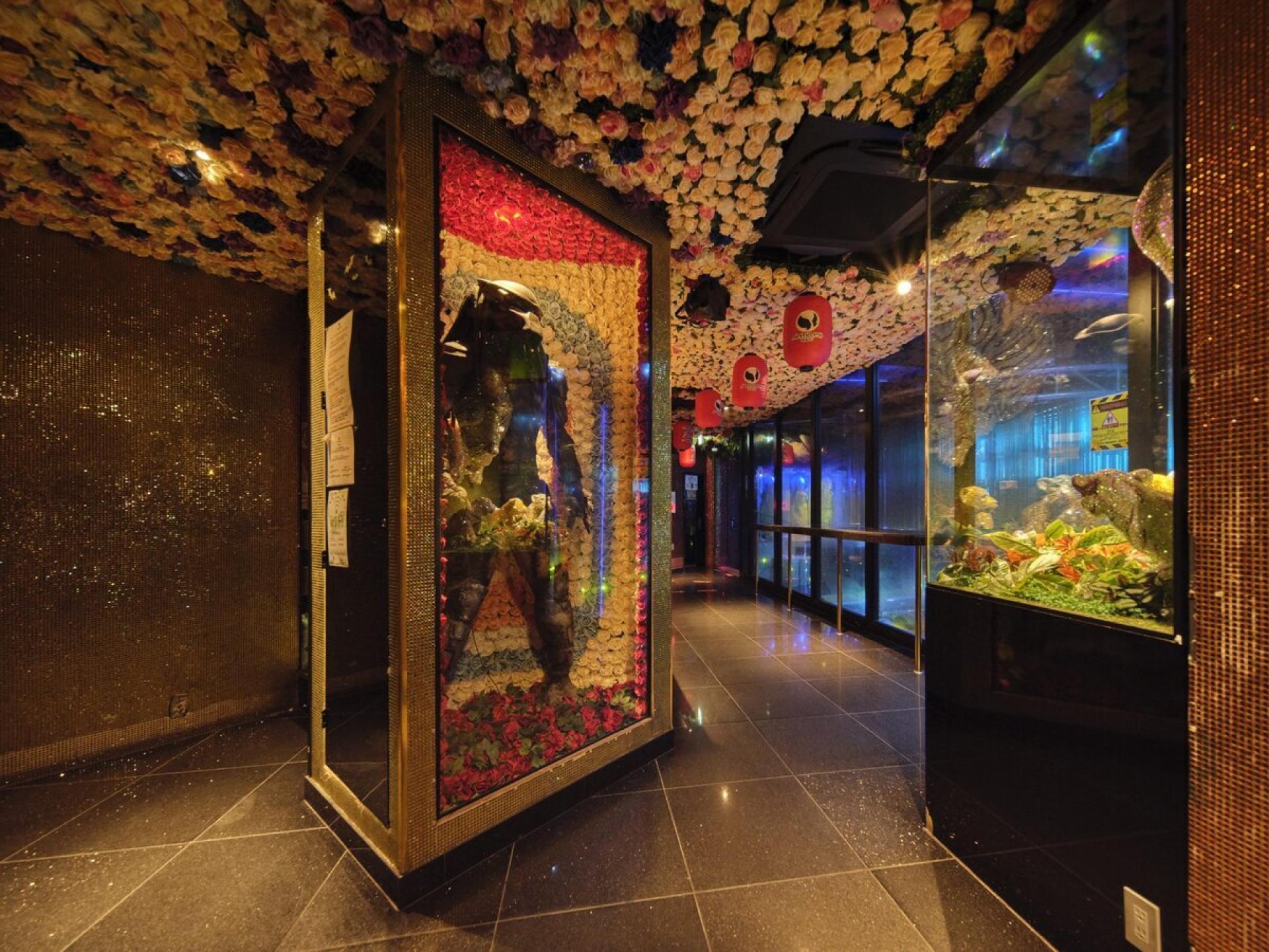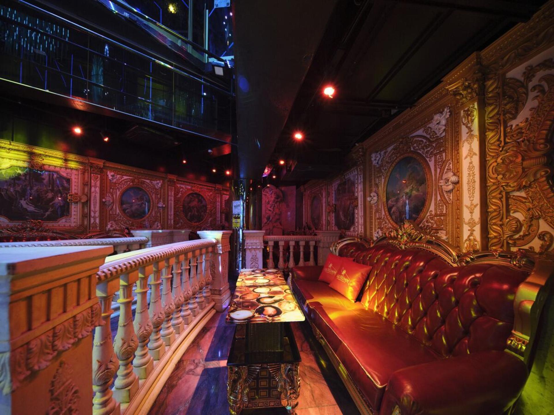 Above, mirrored ceilings and sparkling chandeliers form layered compositions, evoking depth and levity. The upper floor offers a cultural collage: baroque-inspired red leather sofas, traditional Japanese floral ceilings, and Asian-themed corridors coexist to express the diverse, borderless nature of nightlife culture.