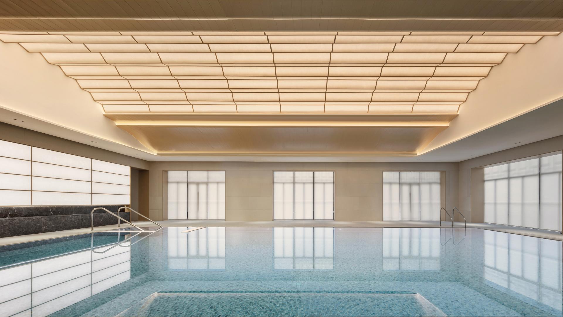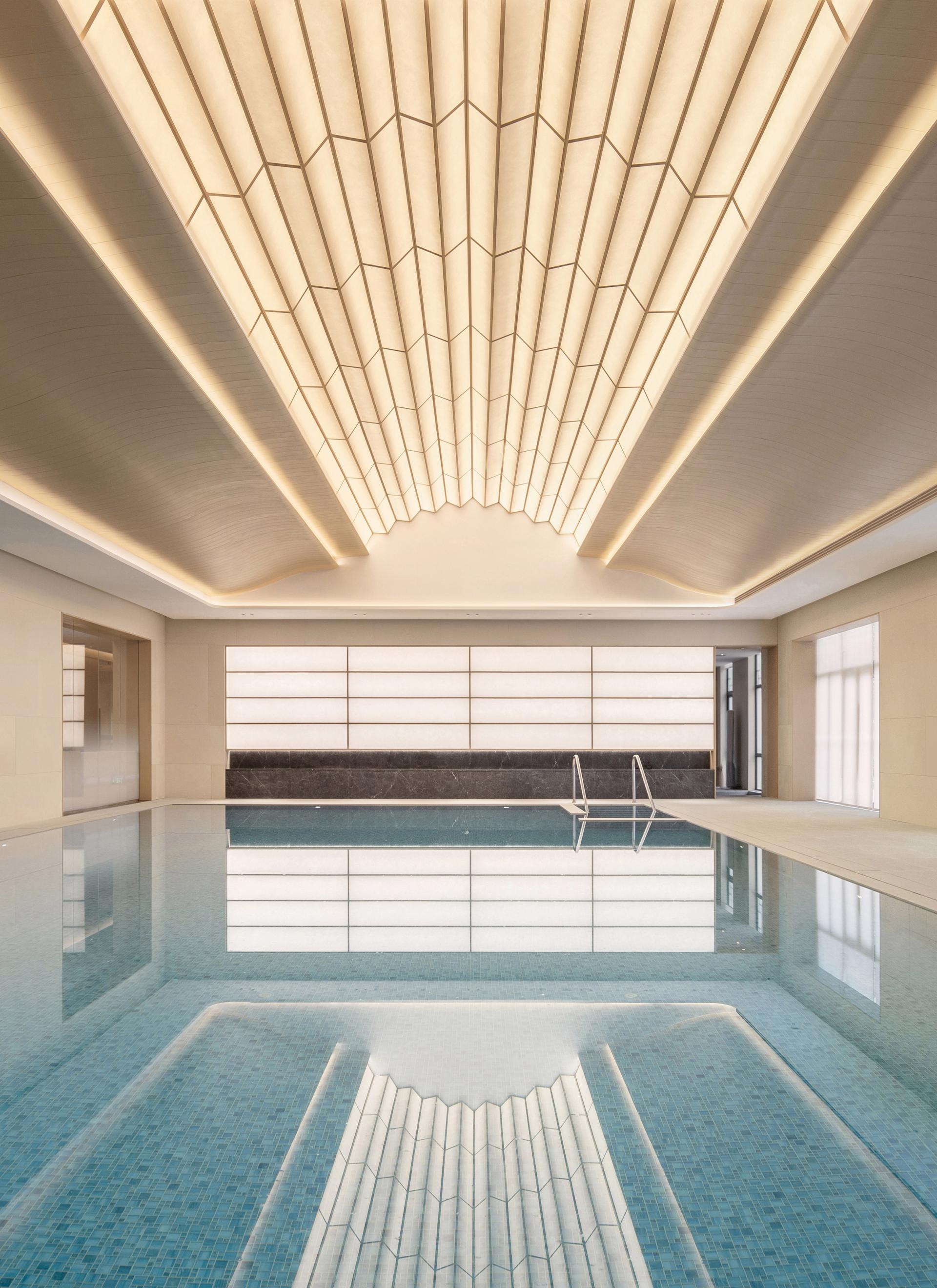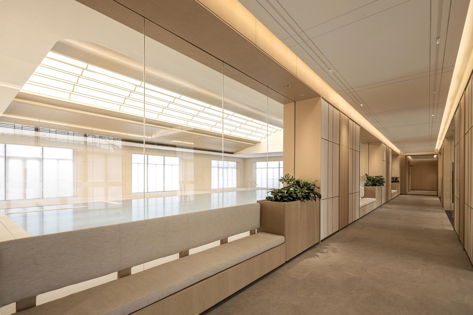 The long corridor connects all the main public areas, including the reception lobby, dining hall and swimming pool. Pass by the swimming pool and you will see that the continuous window openings form a series of picture frames. These capture not only the shimmering surface of the pool, but also the refreshing breeze visible when you look up, as the ceiling resembles a fan that opens and closes.