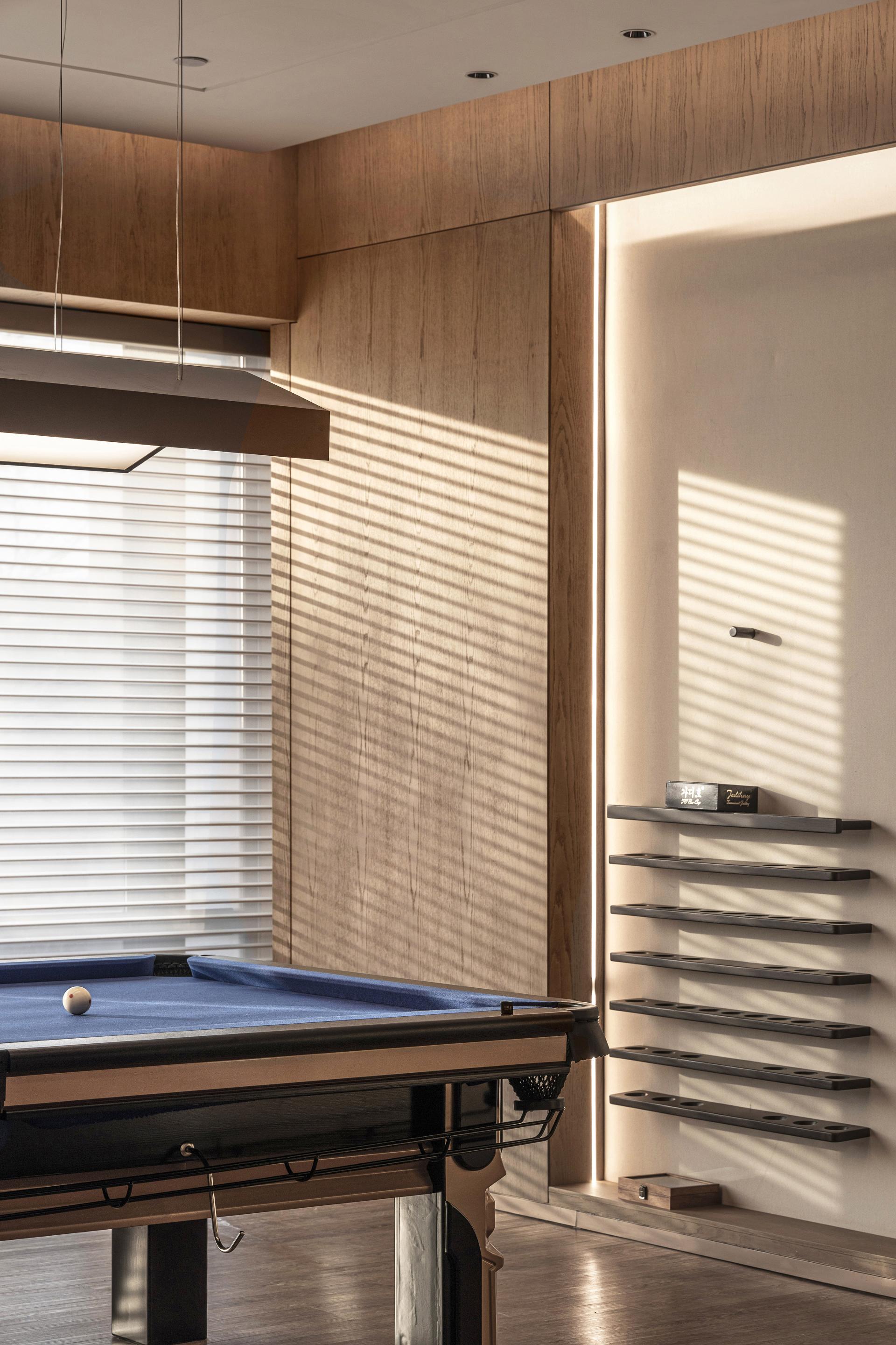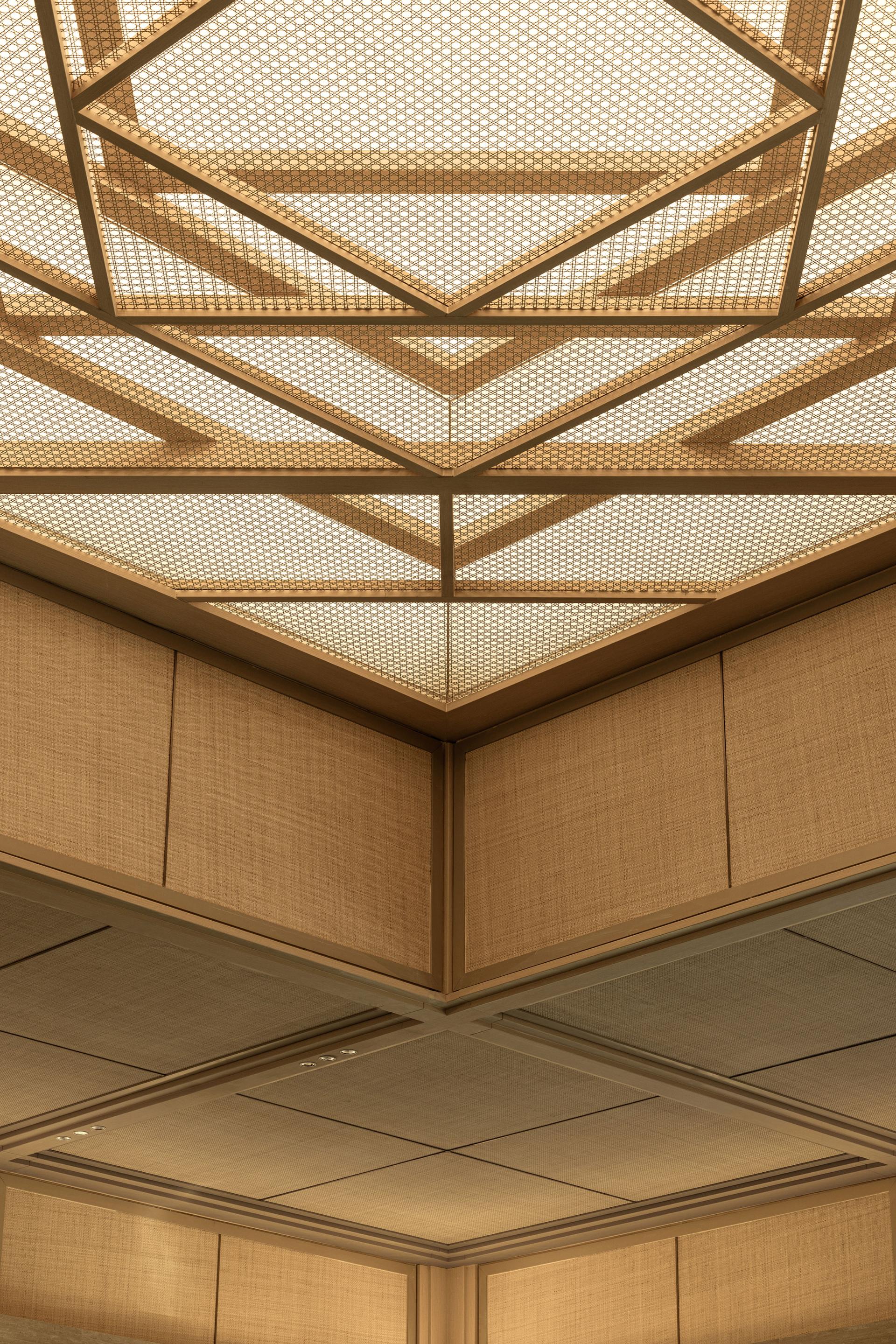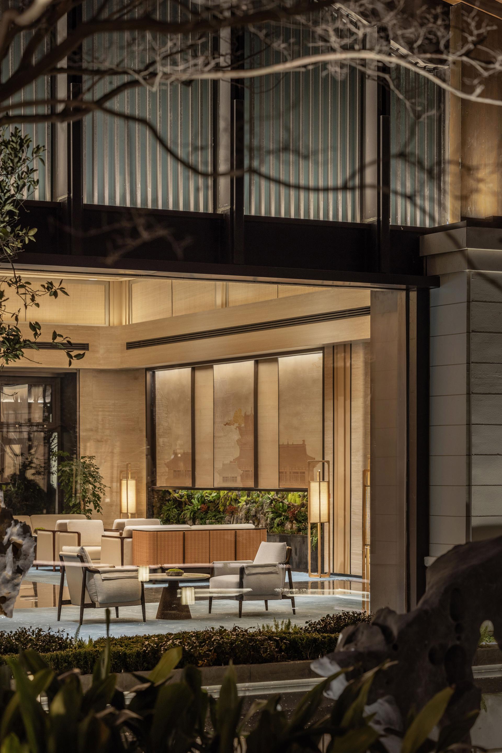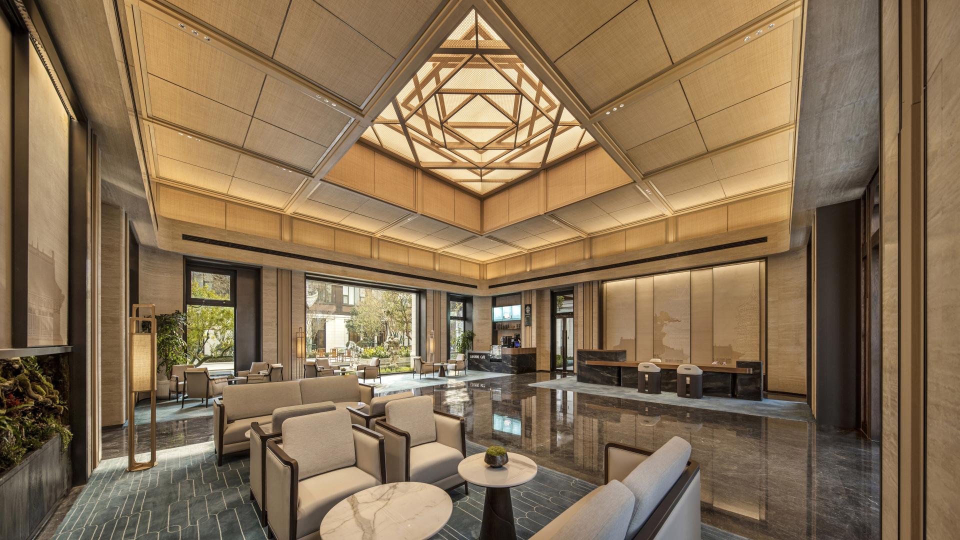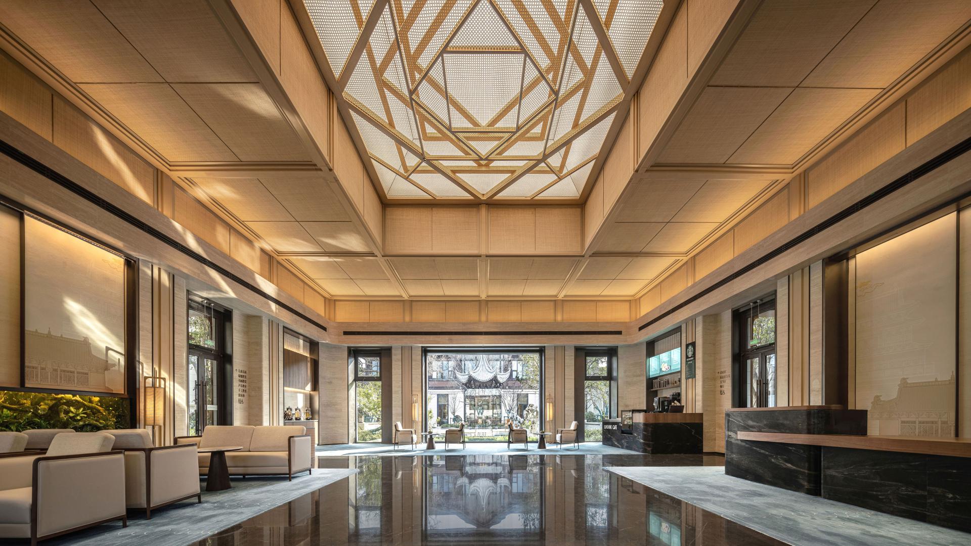 The ceiling design for the communal lounge draws inspiration from 'zao jing' found in traditional Chinese architecture, featuring a central well that rises upwards. Within the central well is the 'Four Directions and Eight Directions' wooden artwork, which unfolds outwards in layers to create a sense of height and depth in the space and convey the philosophical concept of 'unity between heaven and humanity'.