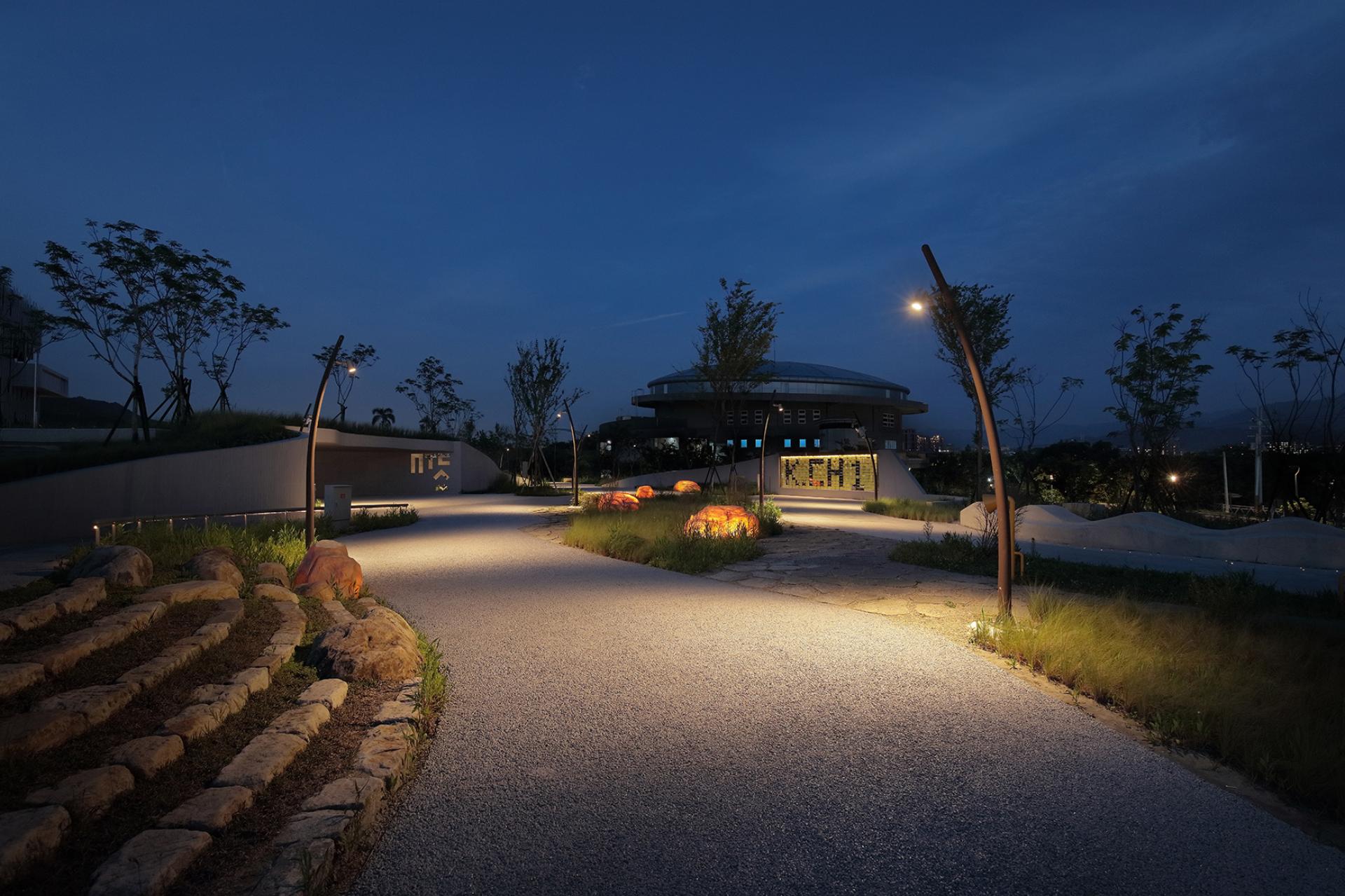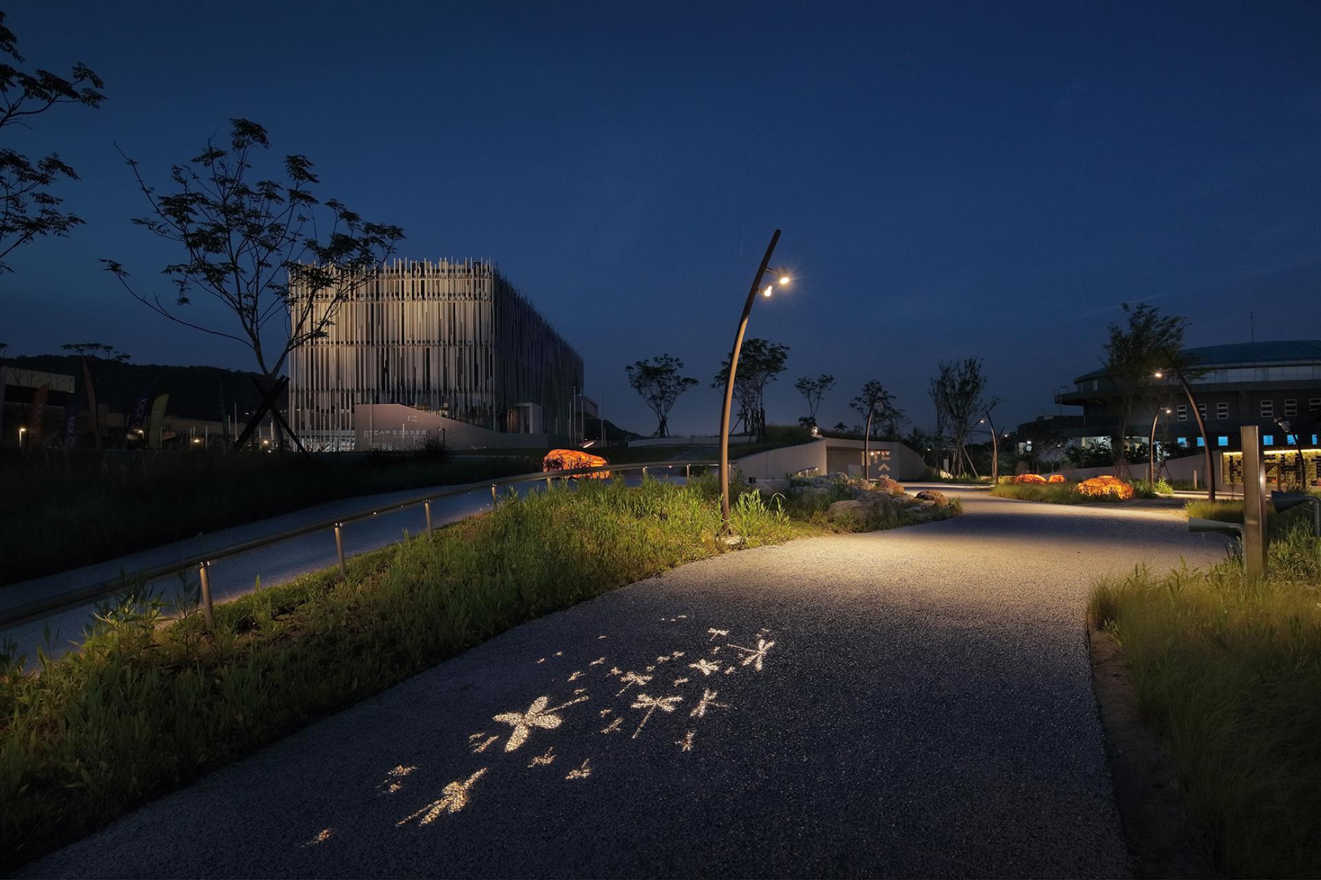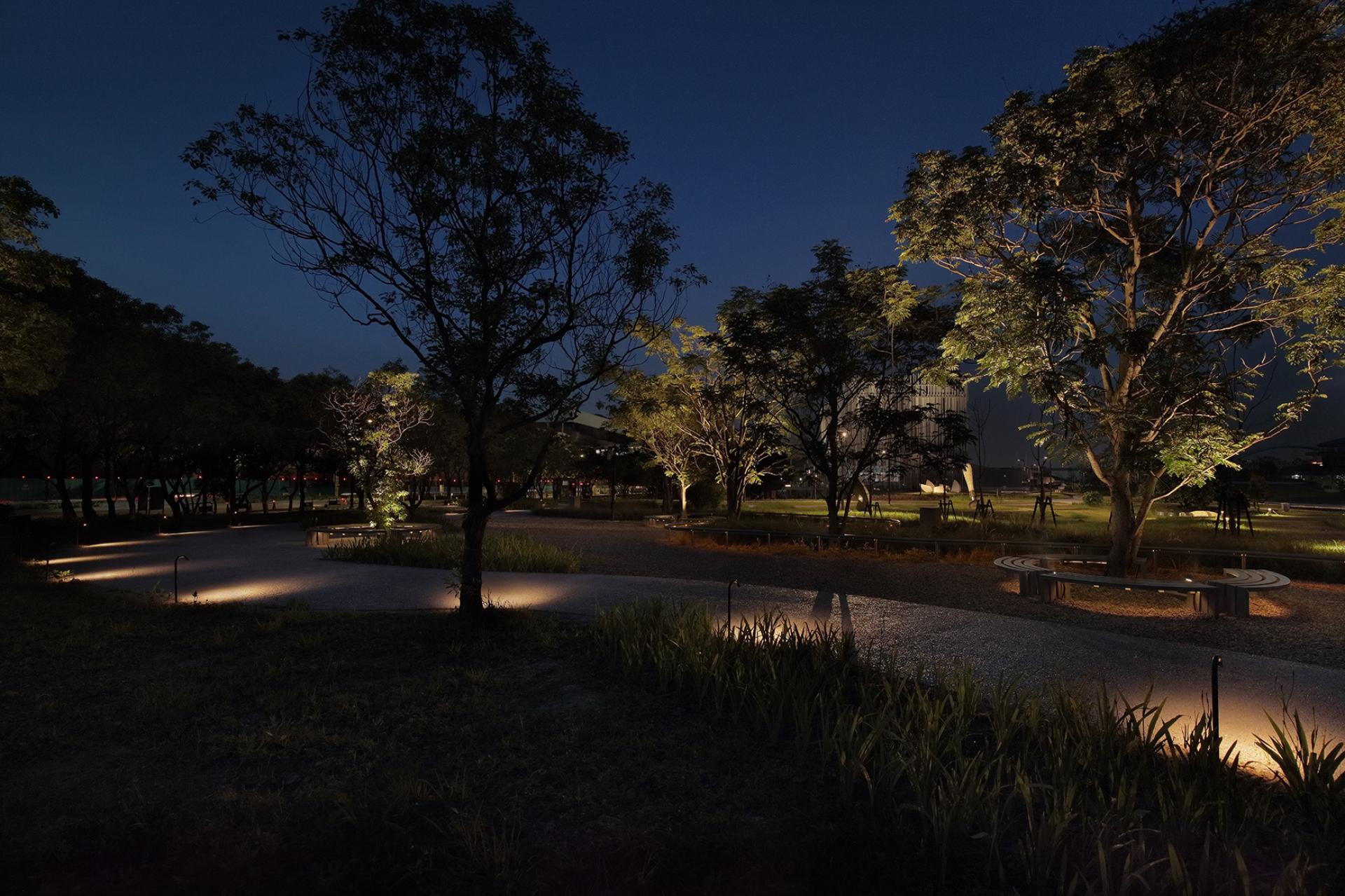 The lighting design for the New Taipei City Art Museum Outdoor Park incorporates many elements that respond to the environment, such as bionic reed-style landscape lights and dragonfly-pattern projections by the creek. The lighting is not only intended to provide a comfortable light environment but also to engage in dialogue with the surrounding environment.