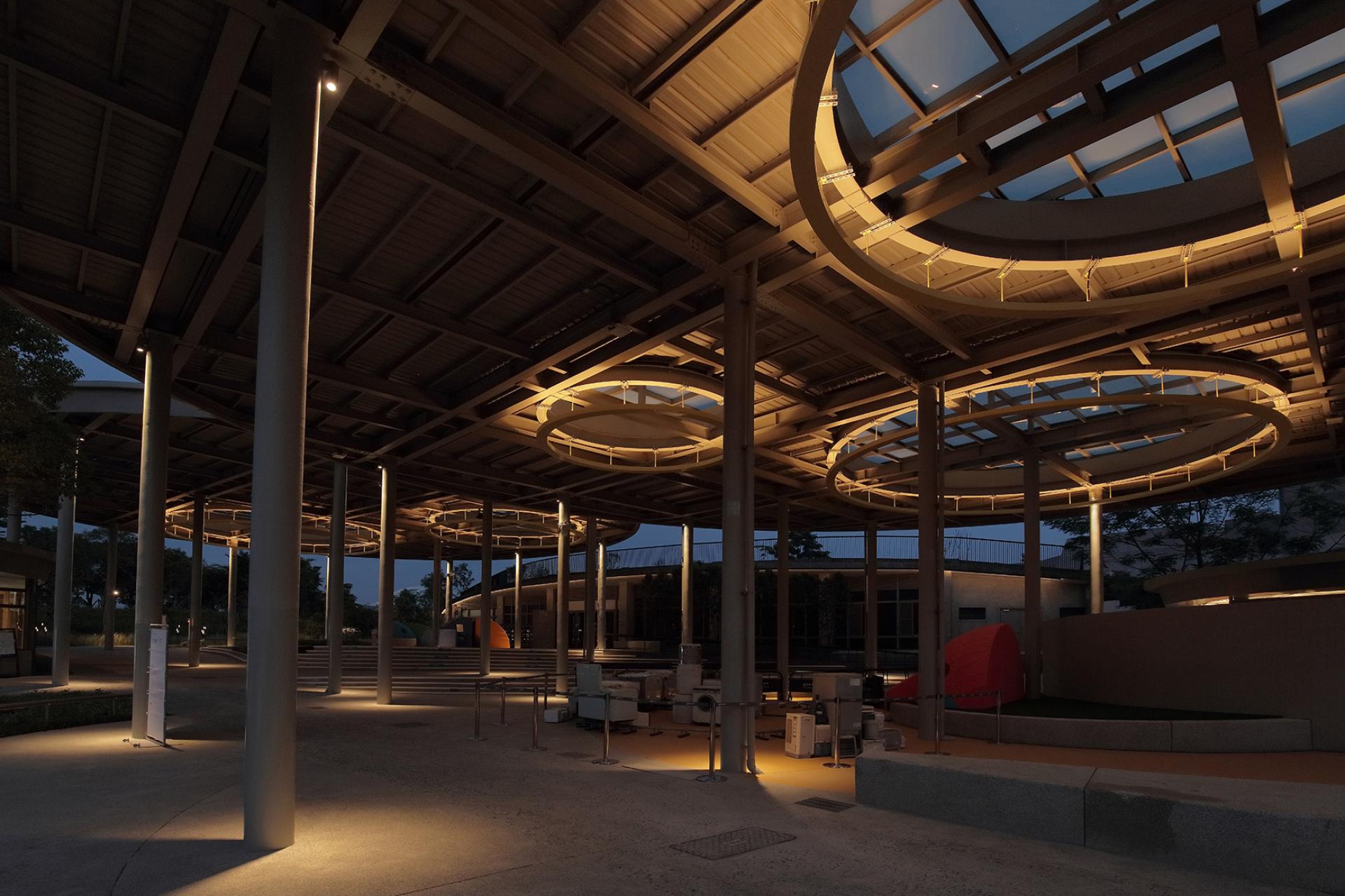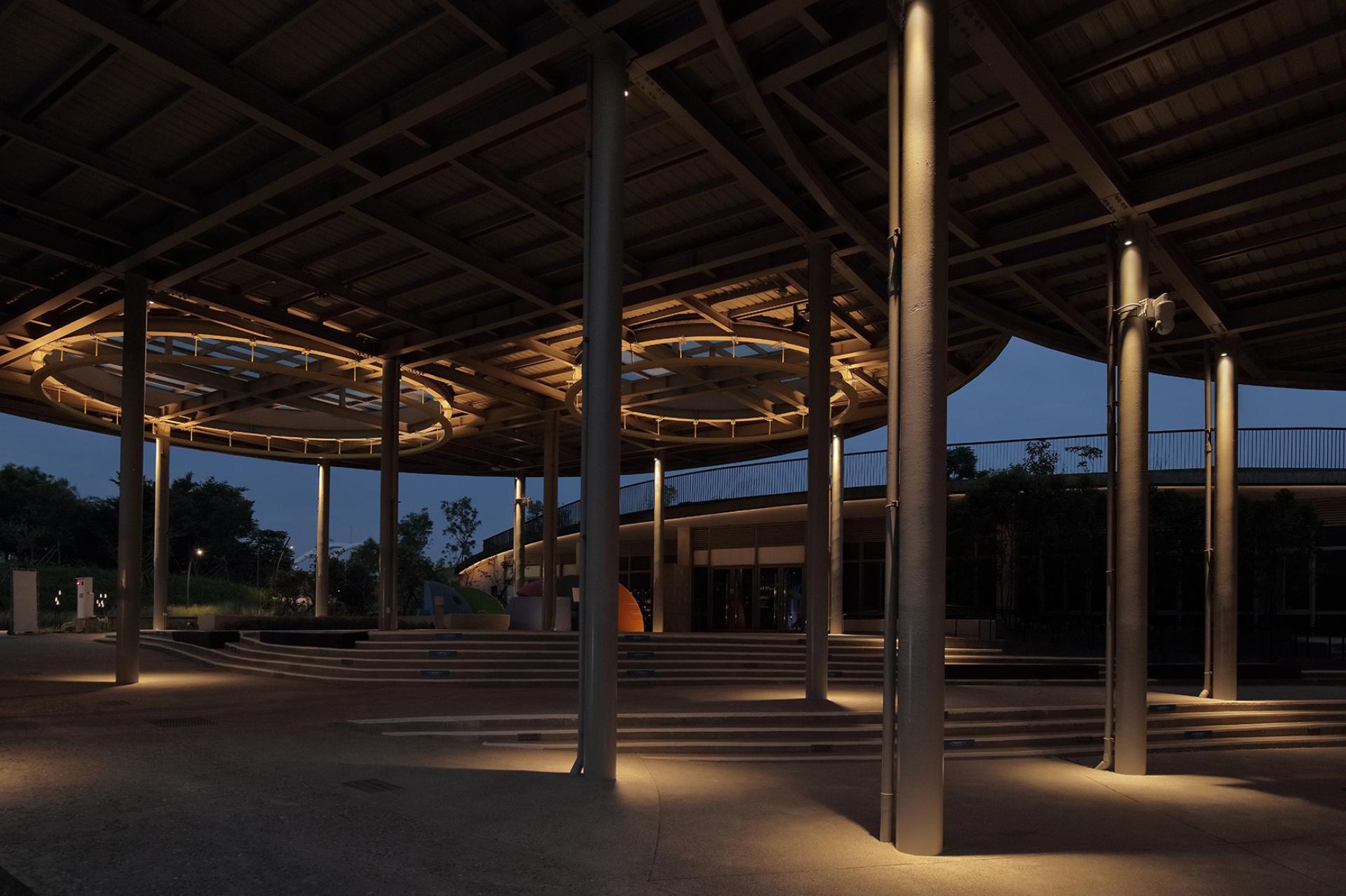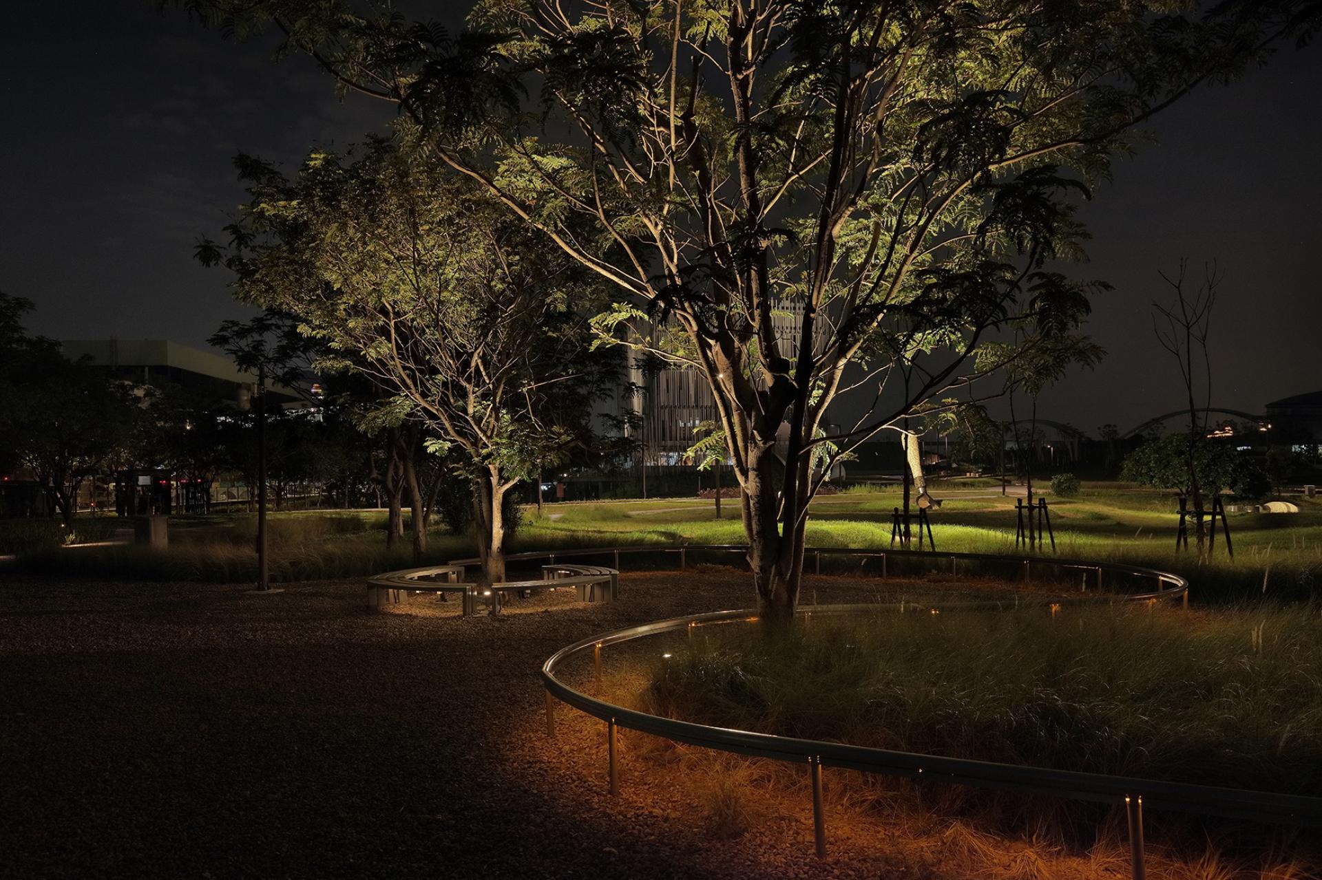 The lighting design for the New Taipei City Art Museum Outdoor Park incorporates many elements that respond to the environment, such as bionic reed-style landscape lights and dragonfly-pattern projections by the creek. The lighting is not only intended to provide a comfortable light environment but also to engage in dialogue with the surrounding environment.