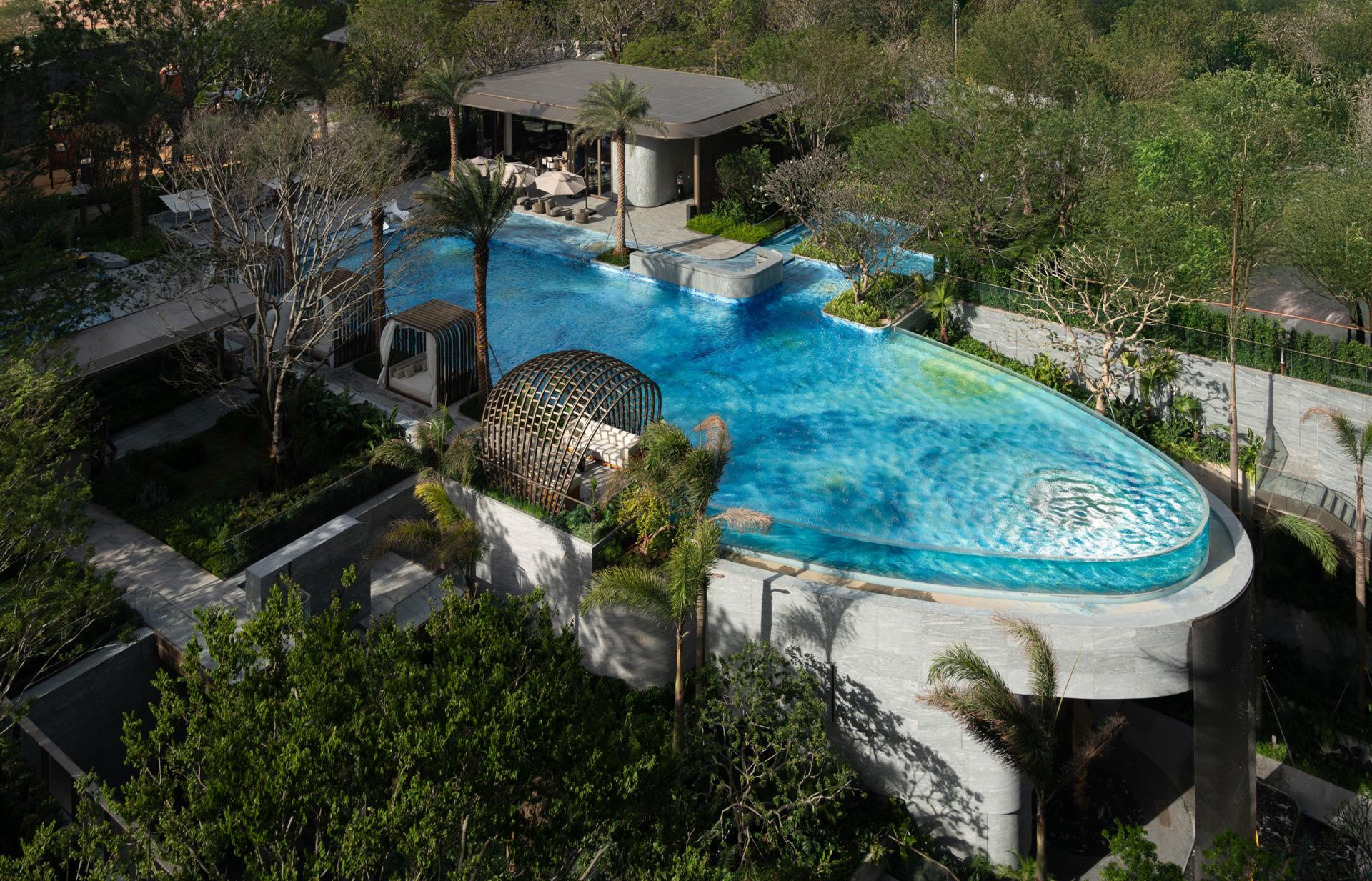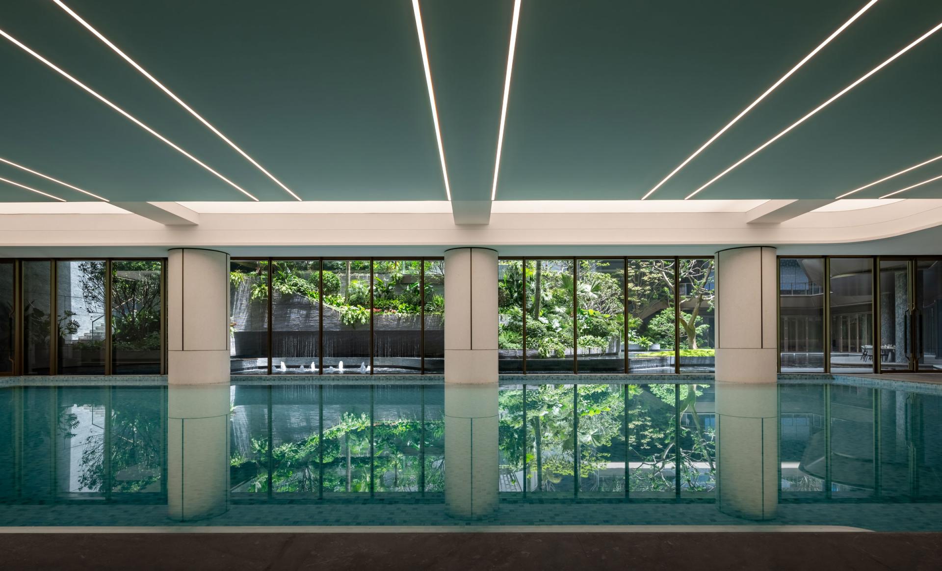 The clubhouse houses a diverse mix of wellness and social spaces, including a gym, yoga and pilates studios, indoor and outdoor pools, a water bar, spa, VIP lounges, and a private dining room. A standout feature is the outdoor infinity pool, nestled within a sloped forest setting and anchored by an 8.6-meter cascading waterfall. The pool bottom is paved with custom mosaic tiles inspired by Van Gogh’s Starry Night, treated with photoluminescence to glow softly after dark—transforming the space into a starlit dreamscape.
