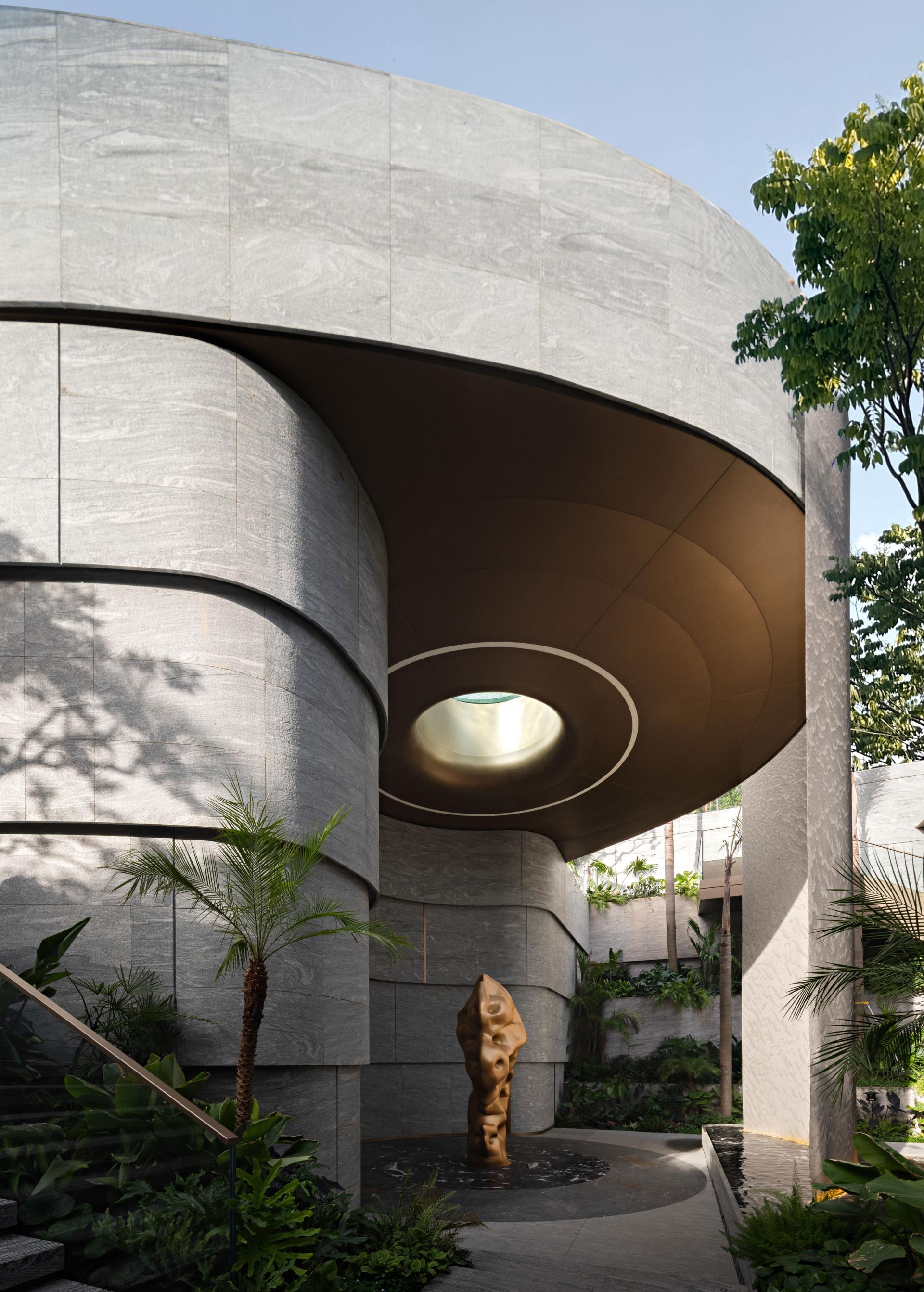 The design unfolds through three nested courtyard experiences inspired by traditional Chinese garden principles—creating a journey of progressive retreat. Soft curved building forms, vertical green walls, and flowing water features guide visitors into an immersive, rainforest-like environment where each step reveals a new visual and spatial encounter. A 270° panoramic façade allows natural light and garden views to pour into the interior, dissolving the barriers between inside and out.