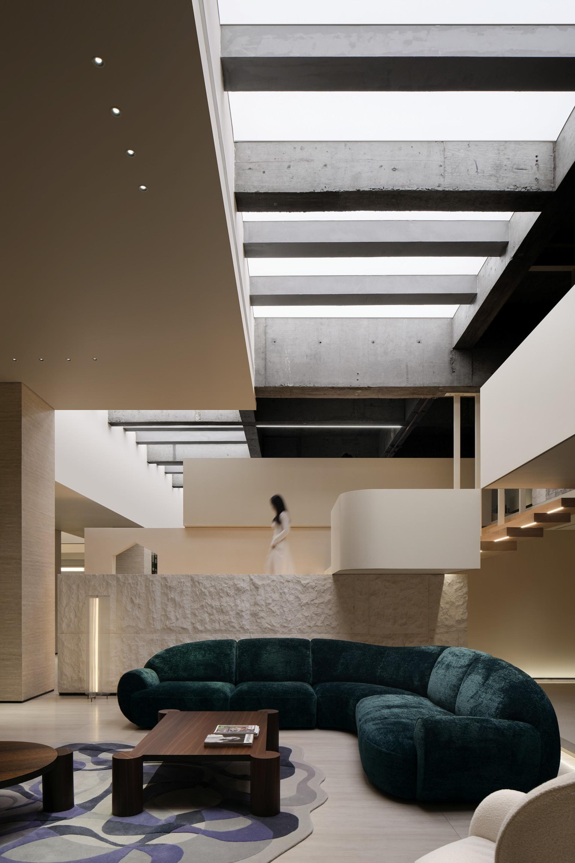 On the ceiling, a new beam-column sequence is integrated between the original column networks to meet the needs of fire pipelines. The juxtaposition of old and new structures, the collision of roughness and precision, reveals the beauty of the original skeleton. The light of the sky flowing from the hanging lamp film flows between the columns, blurring the boundary between man-made and natural, and the space becomes a container of light.