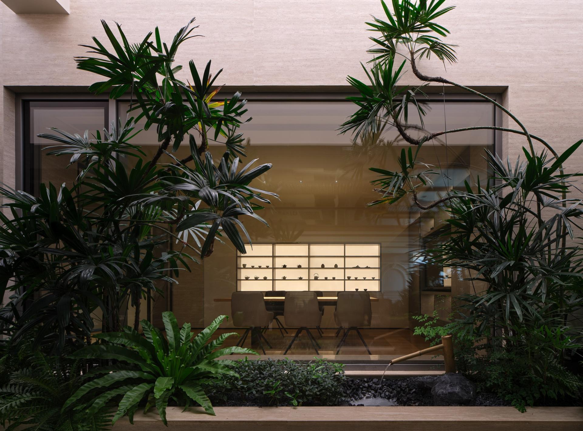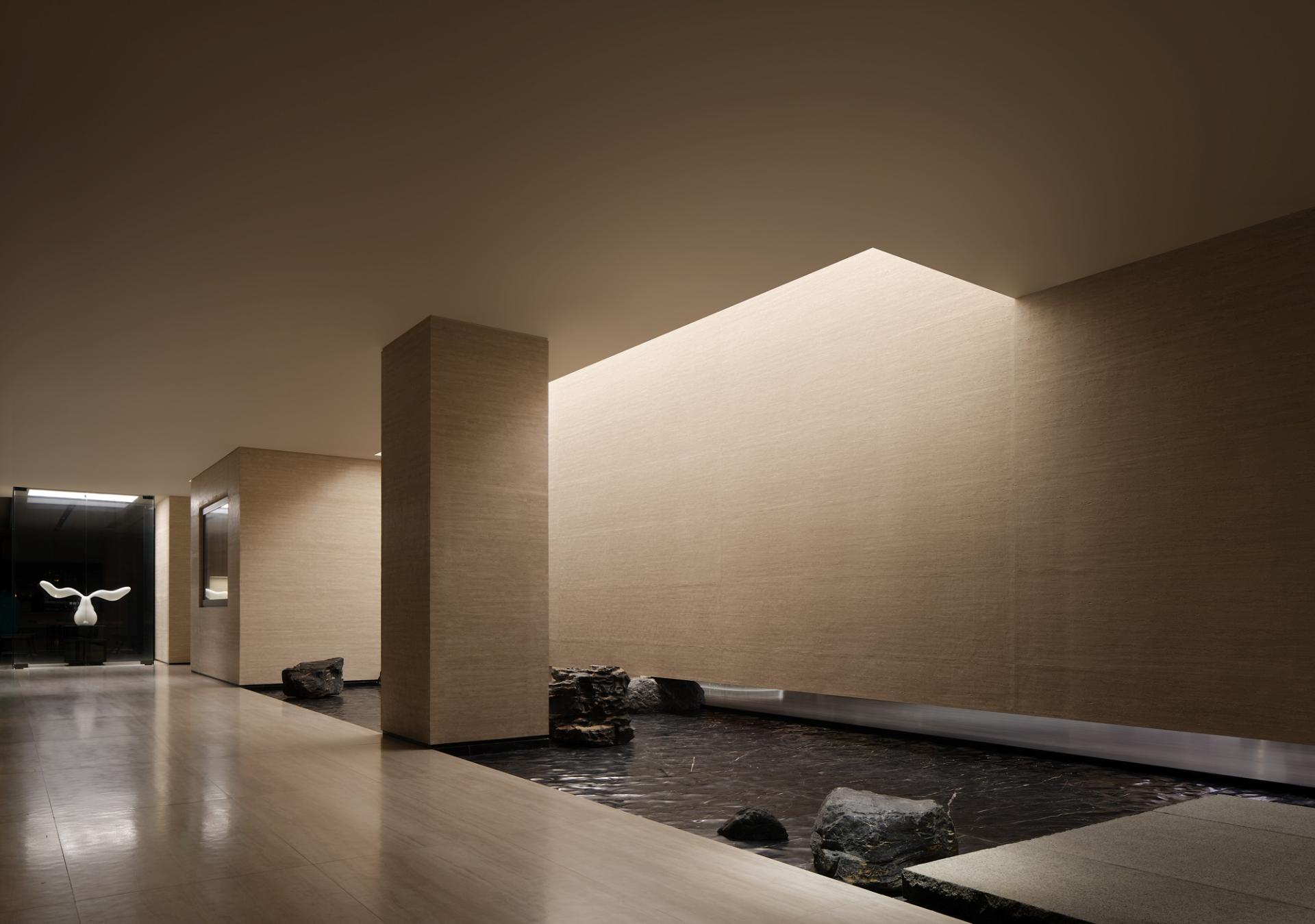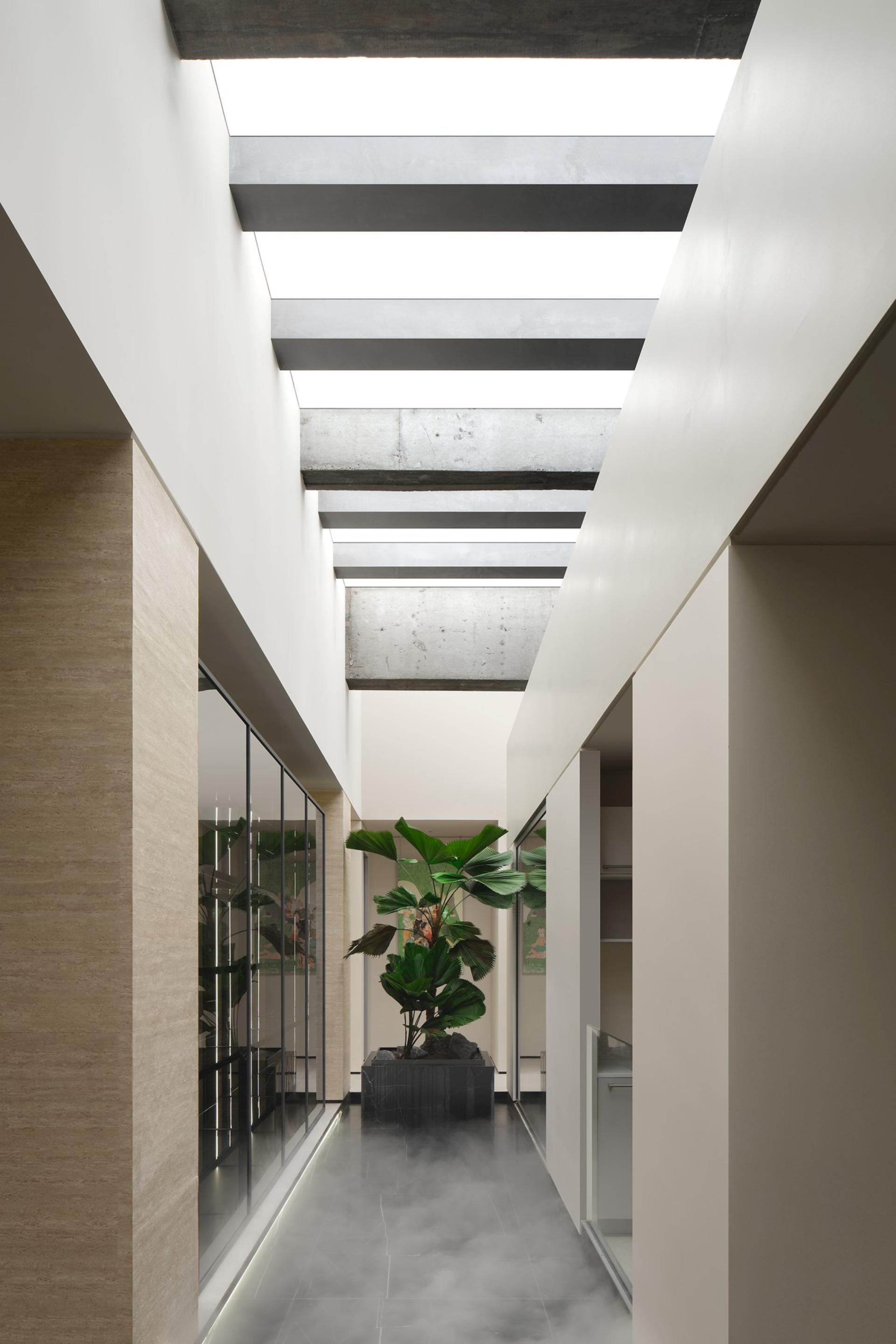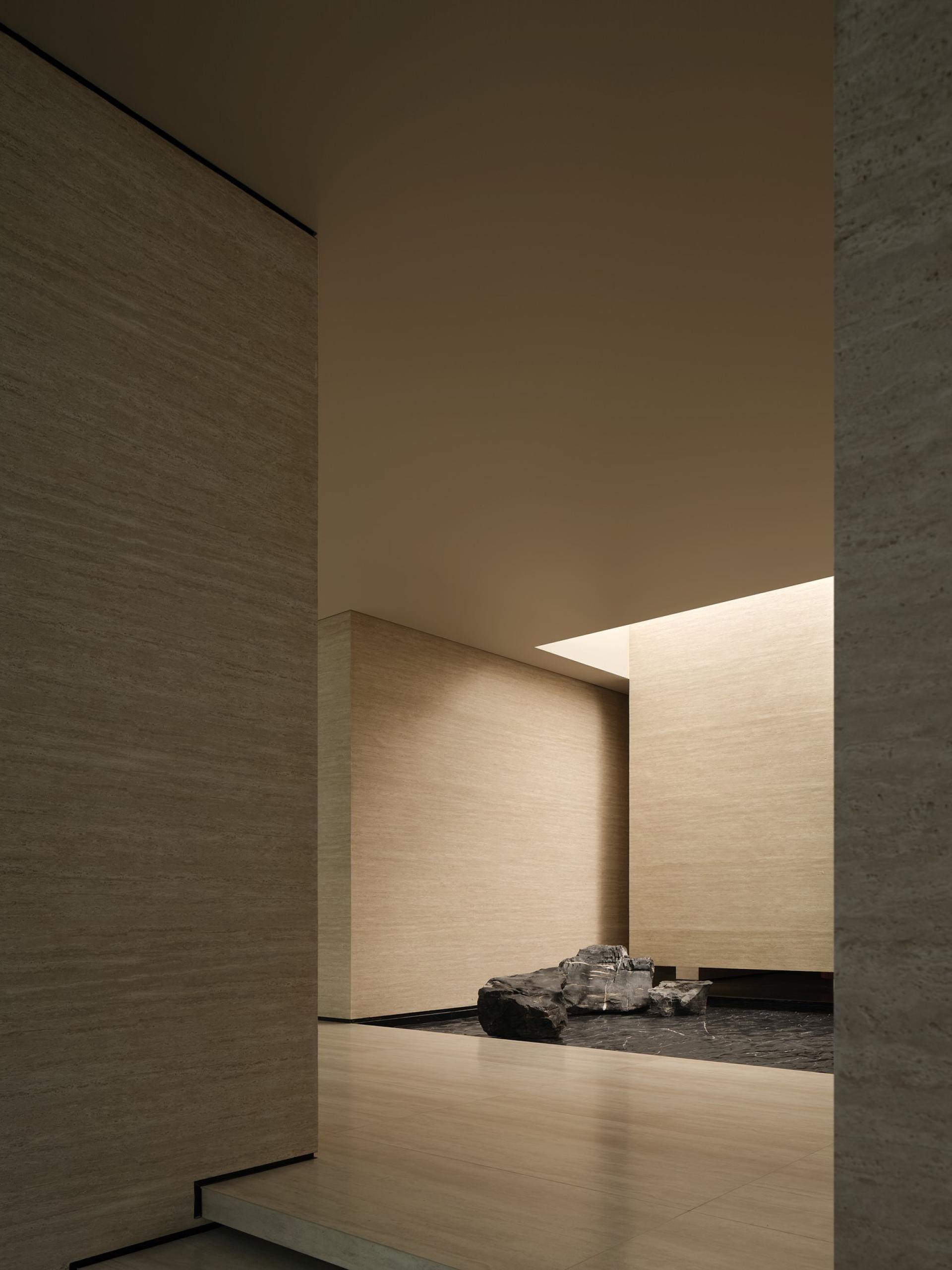 On the north and south sides of the east façade, the simple lines of the large flat entrance stand opposite the hidden style of the entrance of the clubhouse, and the 22-meter green flower pond runs through it, and the light film simulates the skylight pouring down, breaking the inherent boundary between the inside and outside of the building.