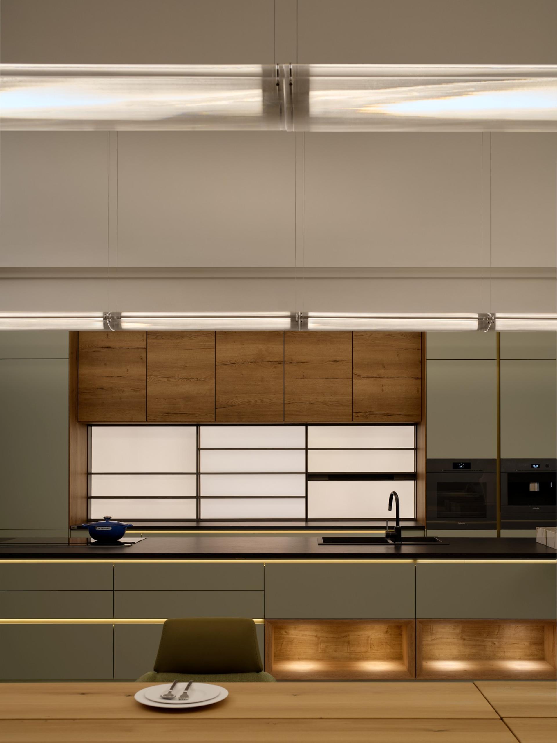 The chandelier above the bar and dining table is called the tile lamp, and each ceramic component of the tile lamp echoes the shape of the arch coupon, alluding to the warm essence of the home.