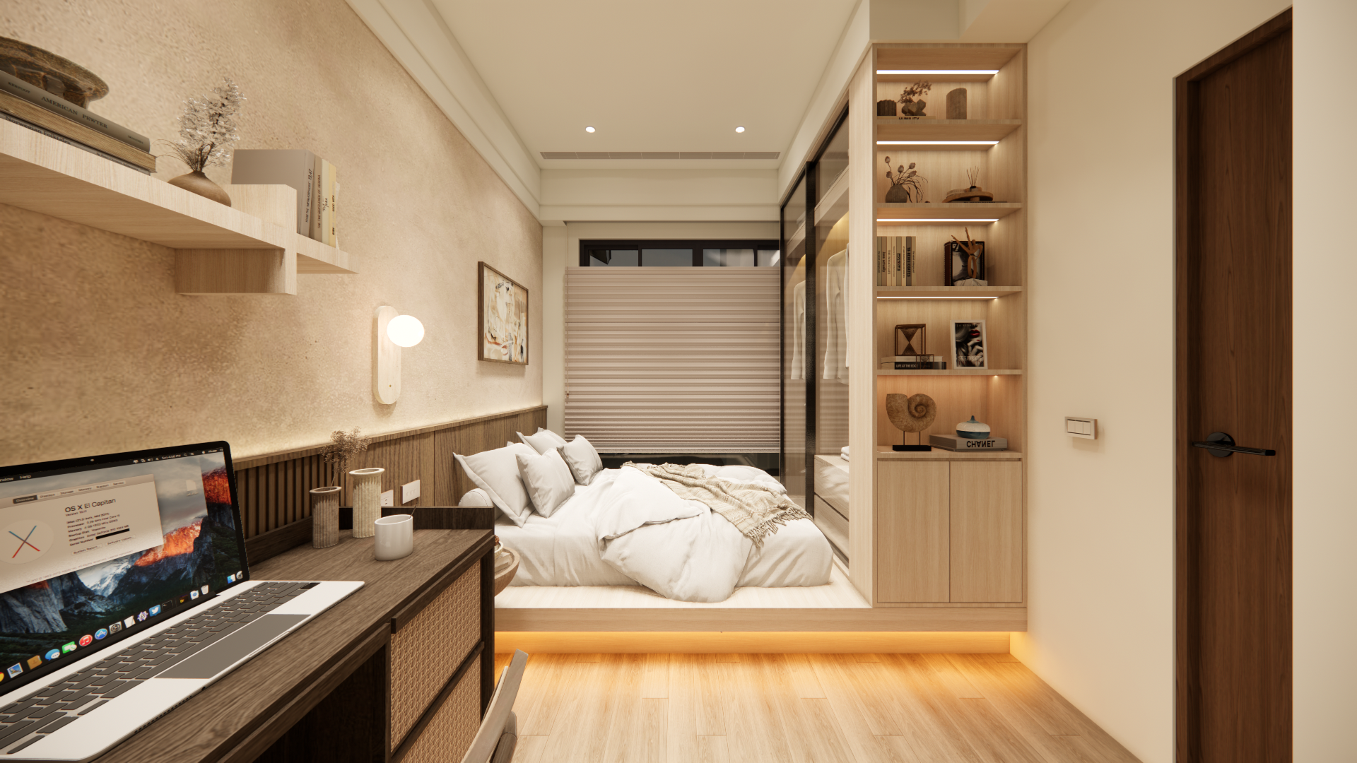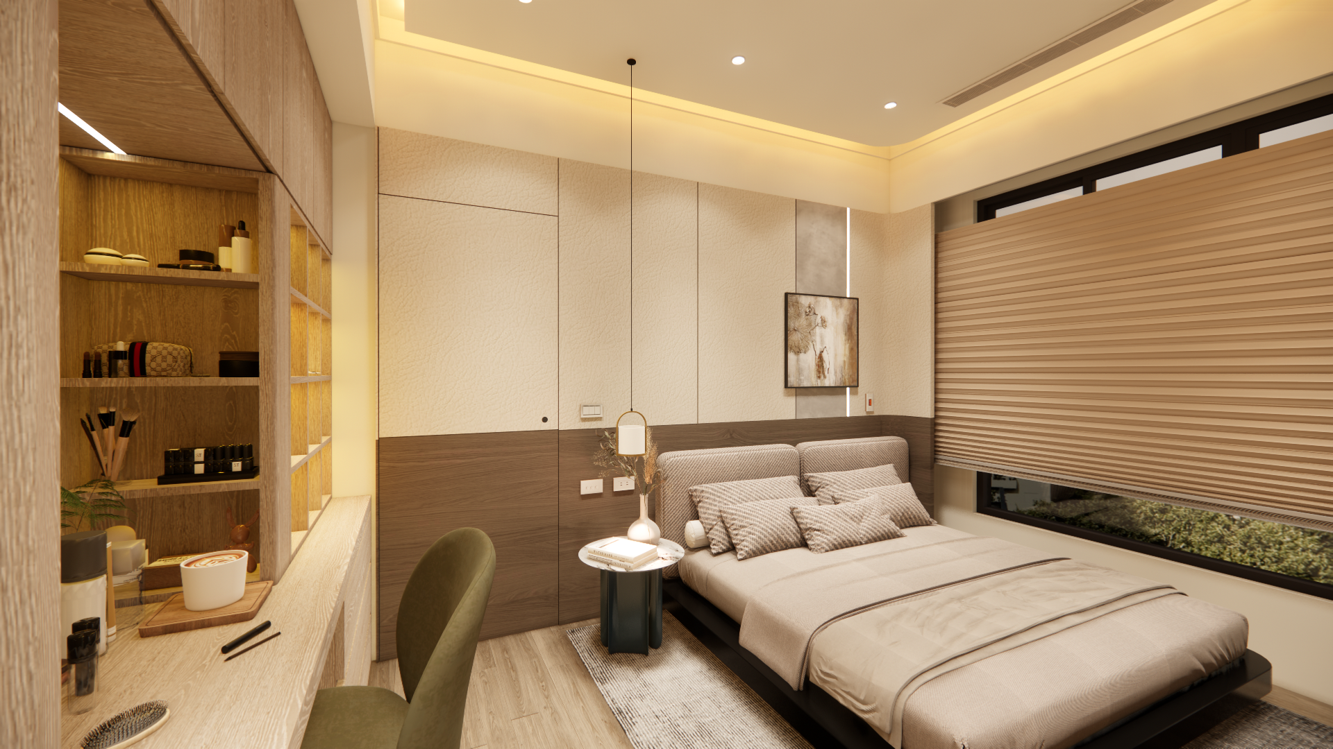 In the private zones, the master and secondary bedrooms maintain a warm, muted palette.