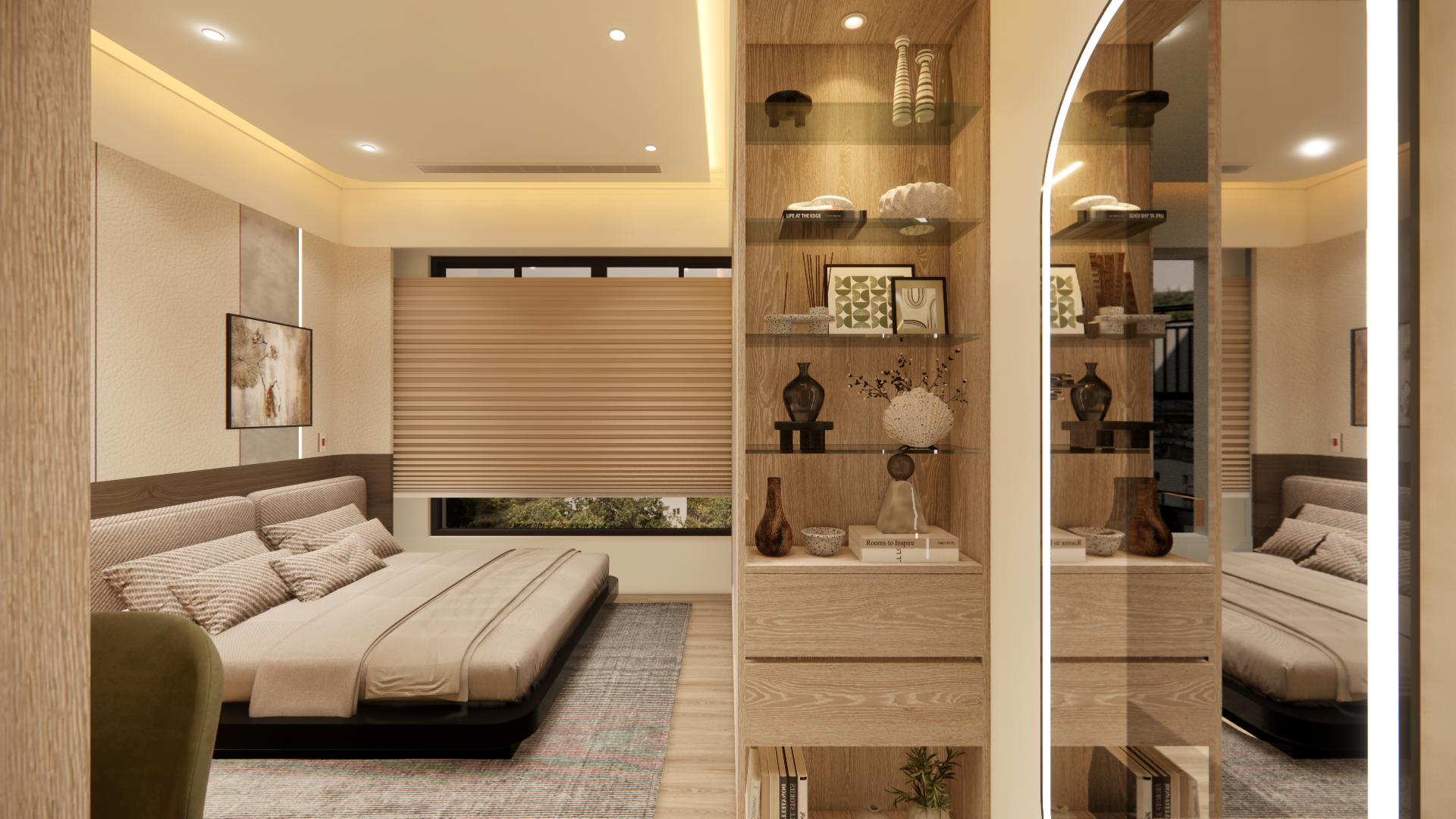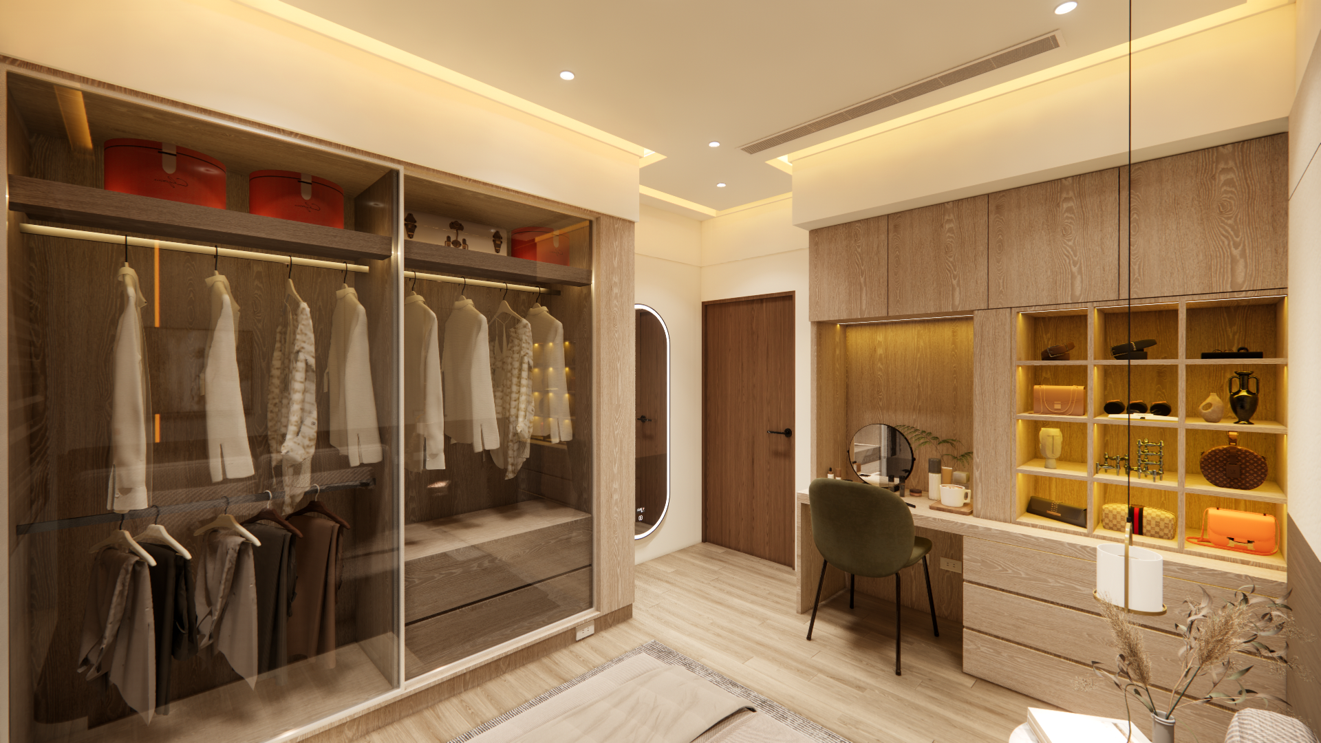 The master suite features a refined dressing area, built-in vanity, and full-length glass wardrobes at the foot of the bed, enhancing both function and understated elegance.
