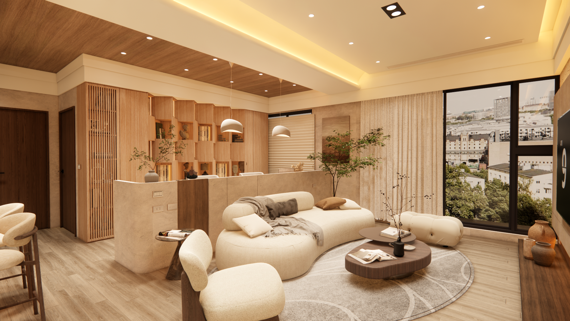 A key design gesture is the tailored curved sofa, which defines a cozy living zone and invites togetherness. Adjacent to it, the three-dimensional sculptural bookshelf wall integrates display, storage, and visual rhythm, becoming a multifunctional focal point.
