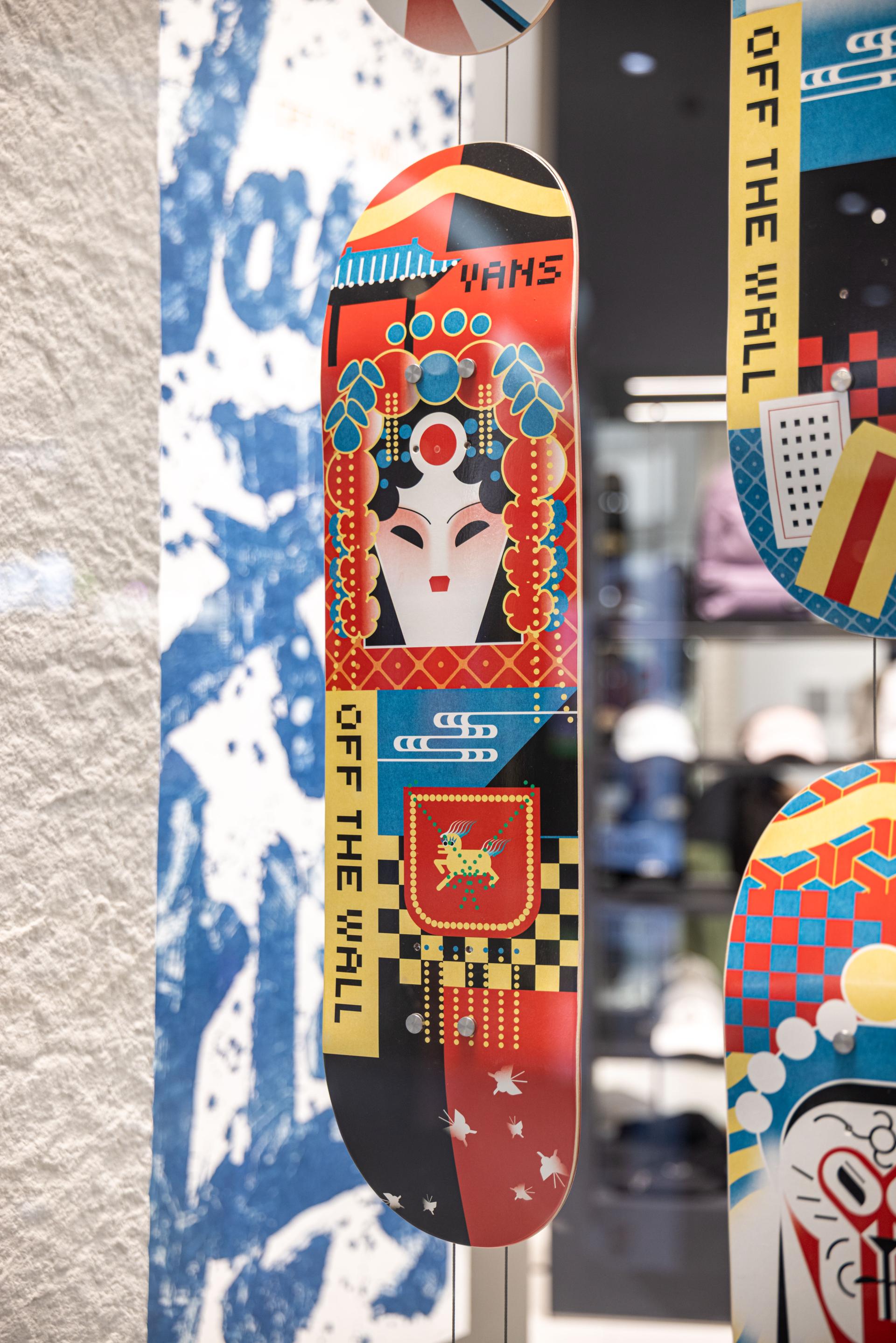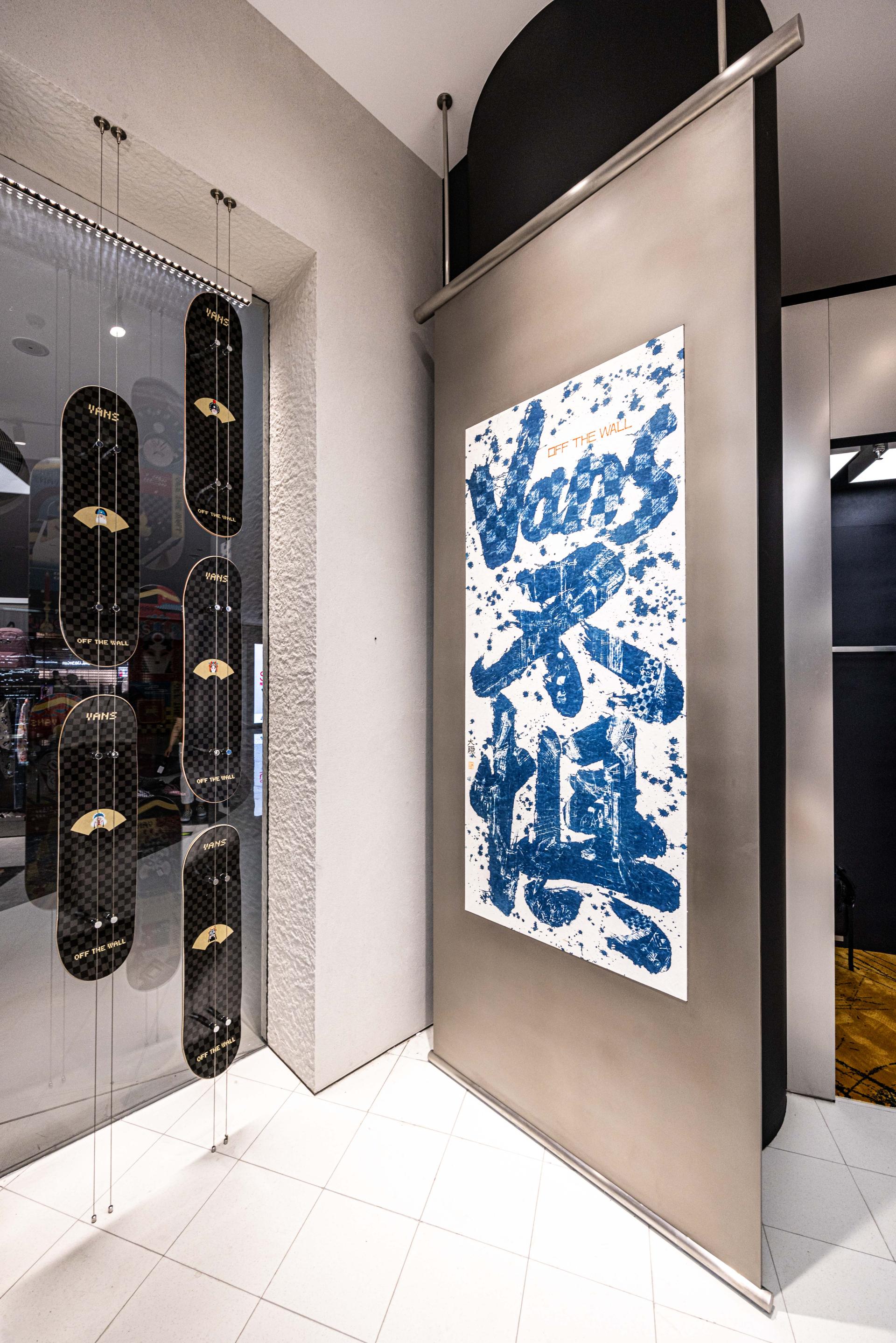 Artist Da Yin’s traditional monumental calligraphy (榜书) artwork "Fear Nothing" fuses sunlight with traditional strokes, embodying Vans' "OFF THE WALL" ethos. Meanwhile, artist A Hao (Renee) created branded skateboard installations themed after opera characters.
