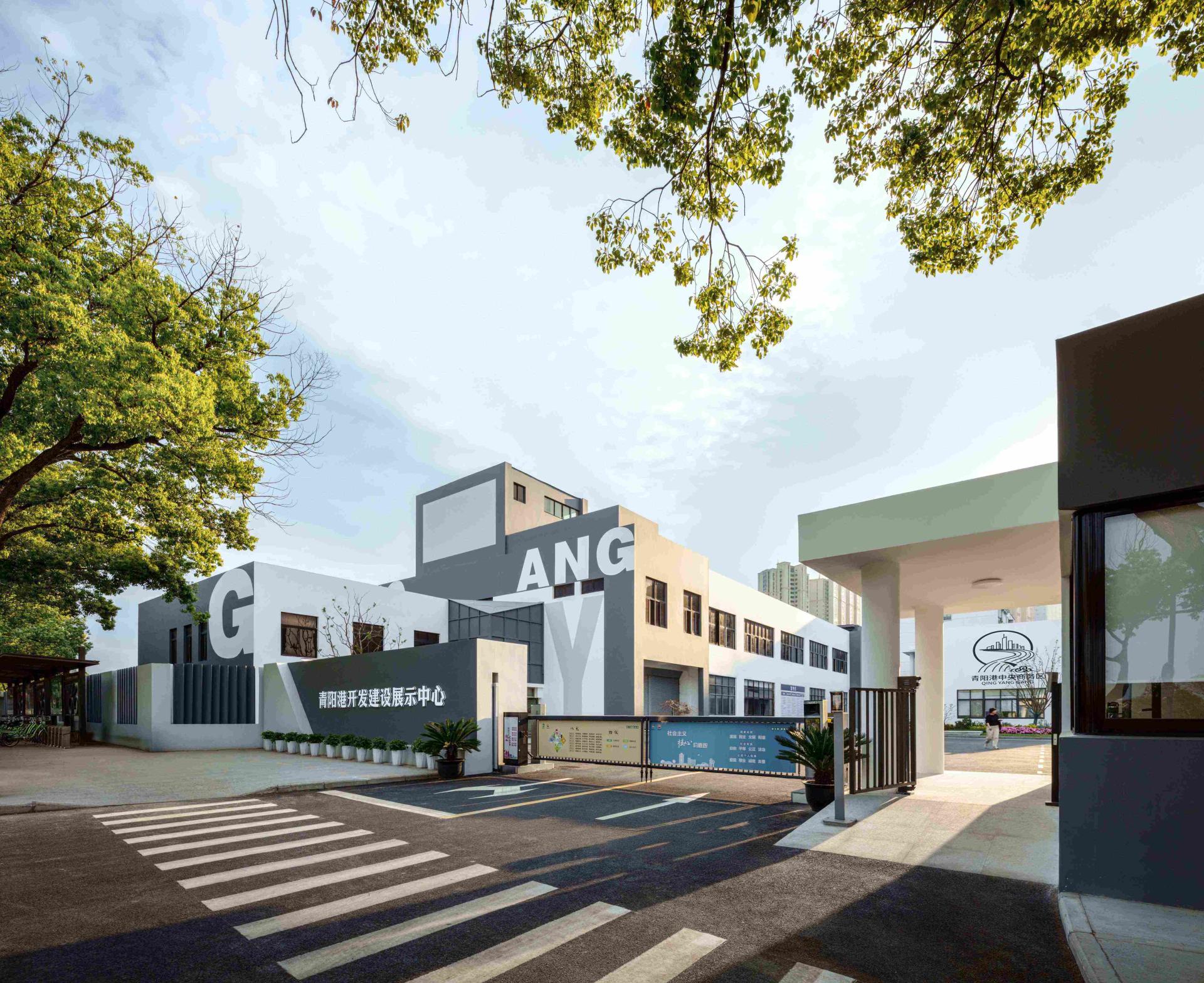 Qingyang Port Development and Construction Exhibition Center is located in the Qingyang Port area of Kunshan, Jiangsu Province, and is adapted from an old factory building and a community health service center. Constrained by an accelerated 30-day schedule and a total budget of RMB 4 million, the design employed a “minimum-intervention + parallel-construction” strategy. Retaining the existing structure, it integrates prefabricated components, modular exhibition systems, light-and-shadow composition, and green elements to achieve simultaneous upgrades in spatial function, visual identity, and ecological performance. The façades adopt a black-white-gray palette that fuses the Jiangnan water-town vernacular with Luis Barragán–inspired abstract geometric composition, using natural light to create a dynamic expression; locally embedded building-integrated photovoltaic (BIPV) units align energy generation with aesthetics. The study demonstrates that, under low-cost and short-timeline constraints, the project successfully accomplished a rapid transformation from a healthcare facility into an “urban living room,” showcasing a demonstrative model for renewing existing industrial buildings under “small-budget, fast-track” conditions.