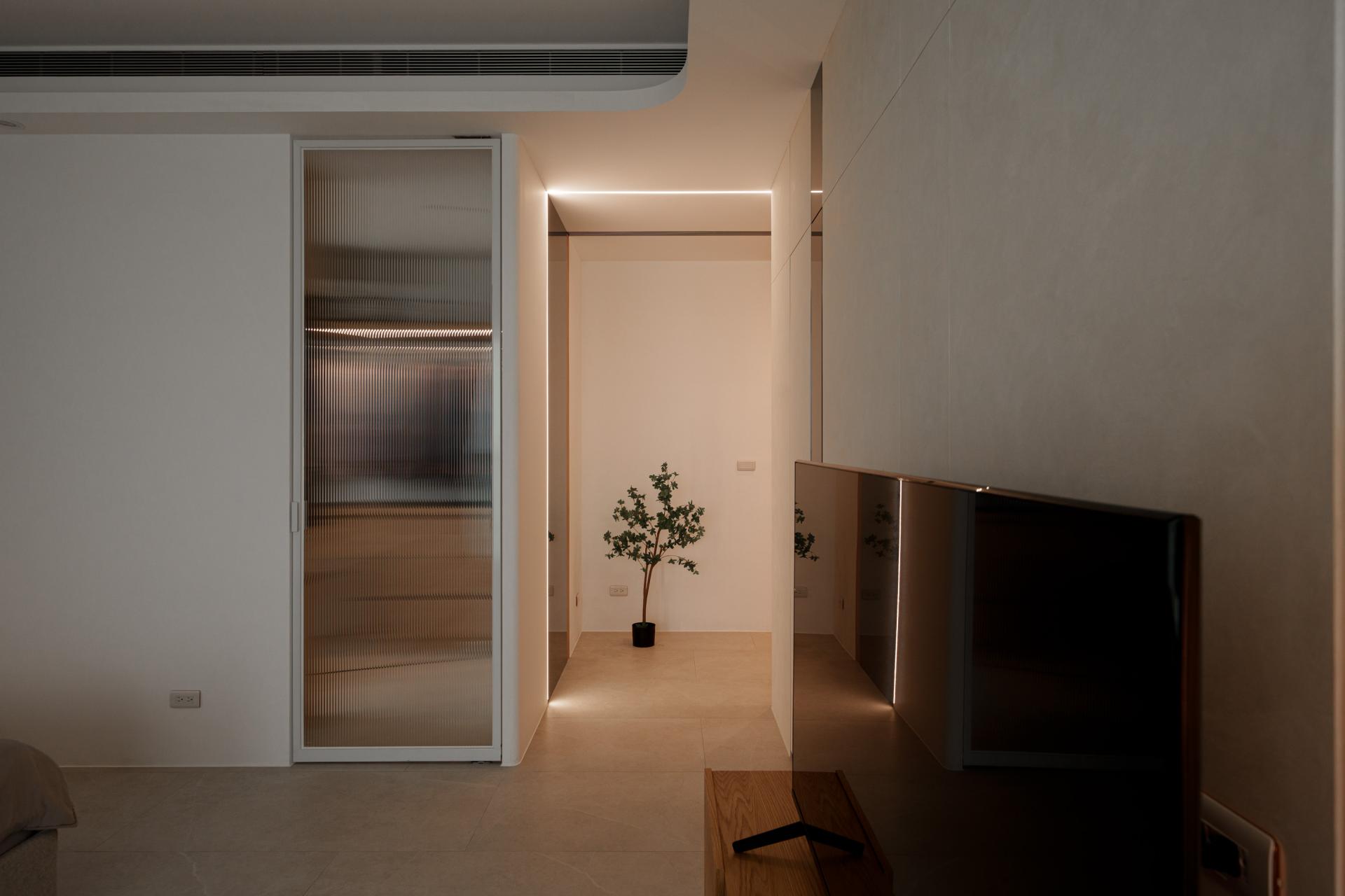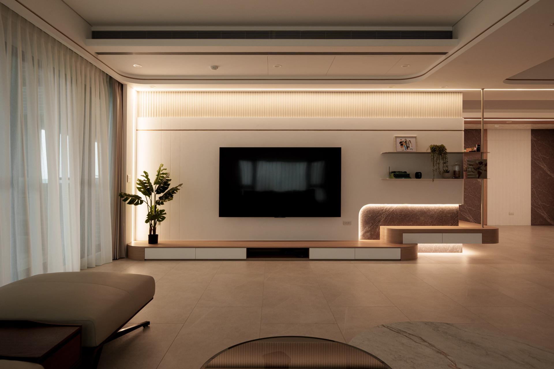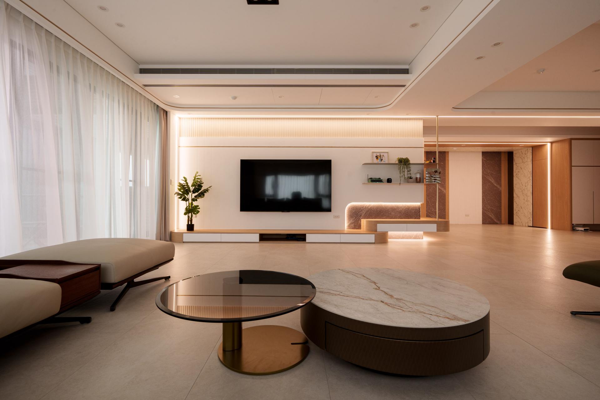 The core of the design is the dialogue between light and flow. A curved ceiling with integrated indirect lighting defines the living area, softening spatial boundaries and diffusing light evenly across surfaces. Linear light strips guide movement through the space and draw attention to select architectural elements, creating an ever-shifting atmosphere from dawn to dusk. Lighting here is not merely functional—it acts as sculpture and storyteller.