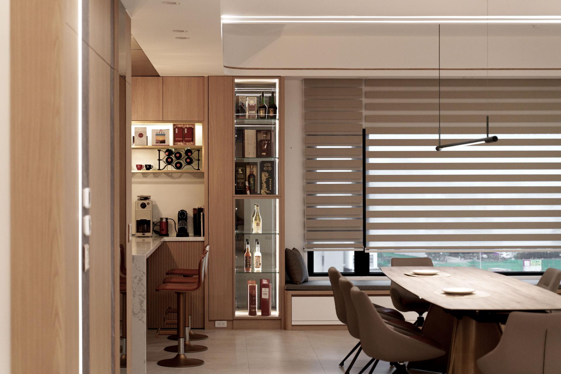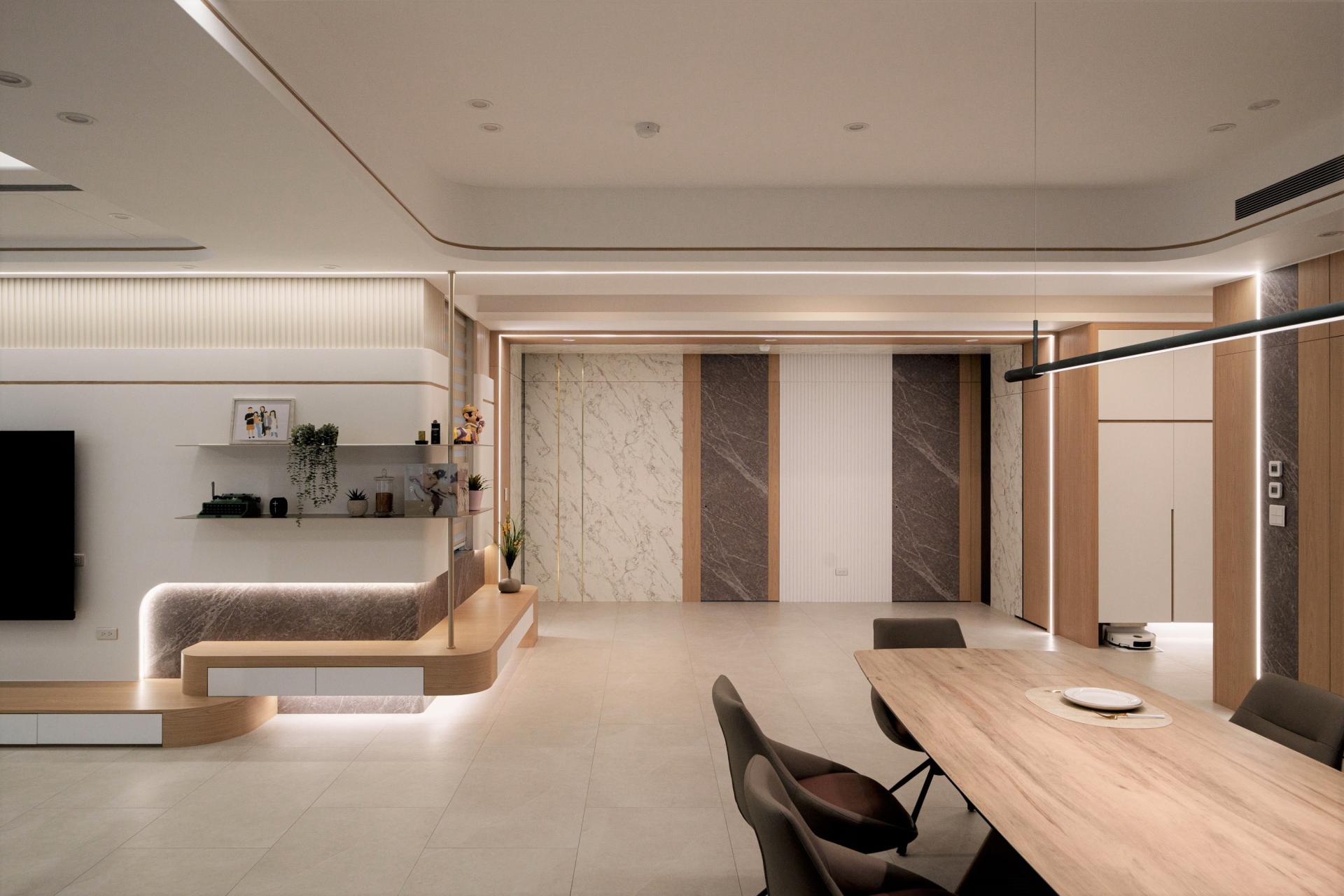 Spatial planning prioritizes openness and emotional connection. By minimizing partitions, the living, dining, and kitchen areas form an integrated social core that encourages interaction. Hidden, flush cabinetry maintains minimalist aesthetics while addressing practical storage needs. In the entryway, vertical wood and stone textures frame the threshold experience, while linear lights sculpt a spatial overture that leads to the heart of the home.