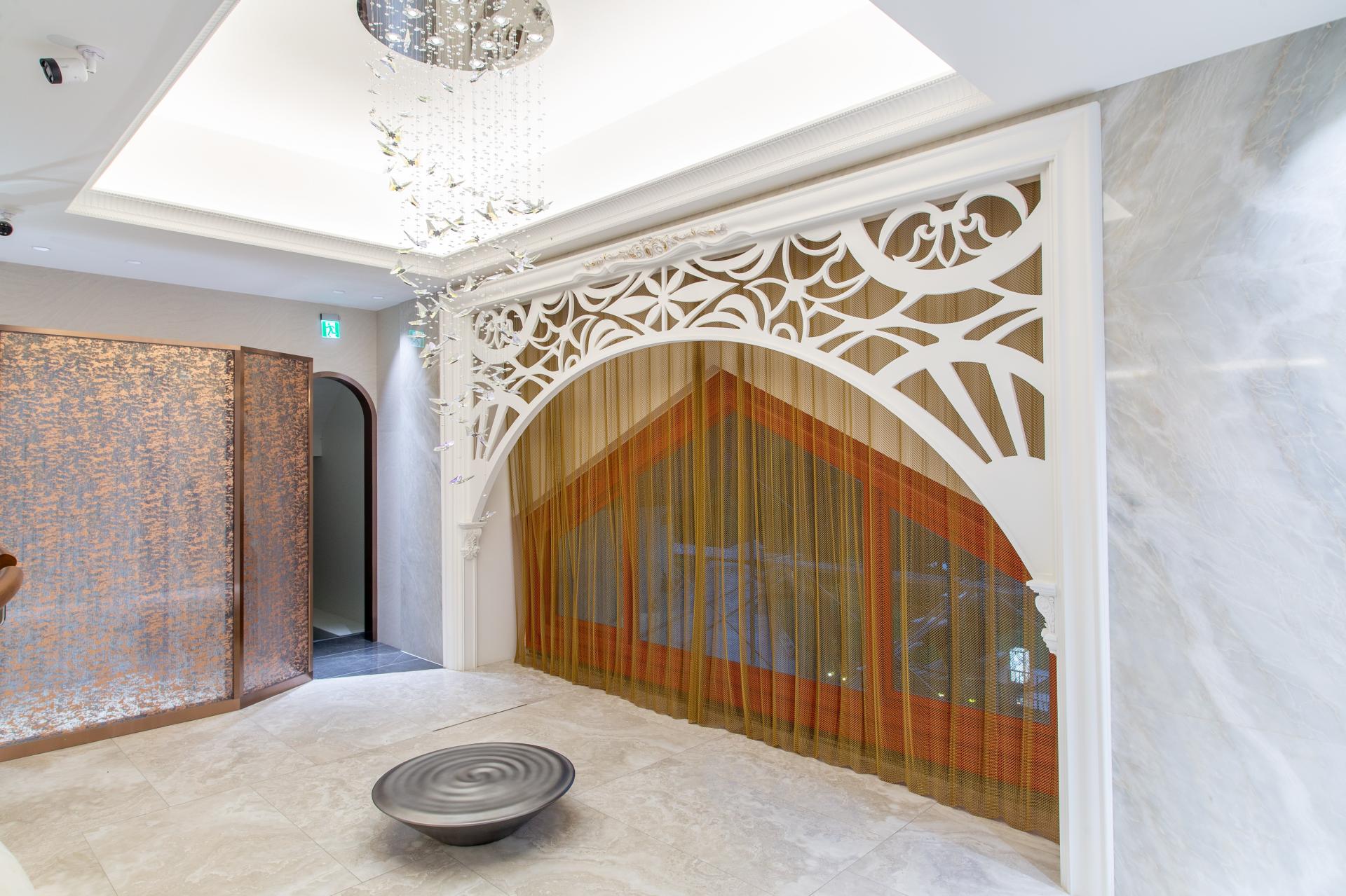 The main sanctuary features a monolithic volume, anchored by a custom-carved Nine-Dragon marble wall that pays homage to ancient temple iconography. A 5.5-meter-high ceiling and central glass dome allow natural light to shift with time, animating the sacred space in subtle rhythms. The result is both solemn and serene, where divinity is expressed through stillness.