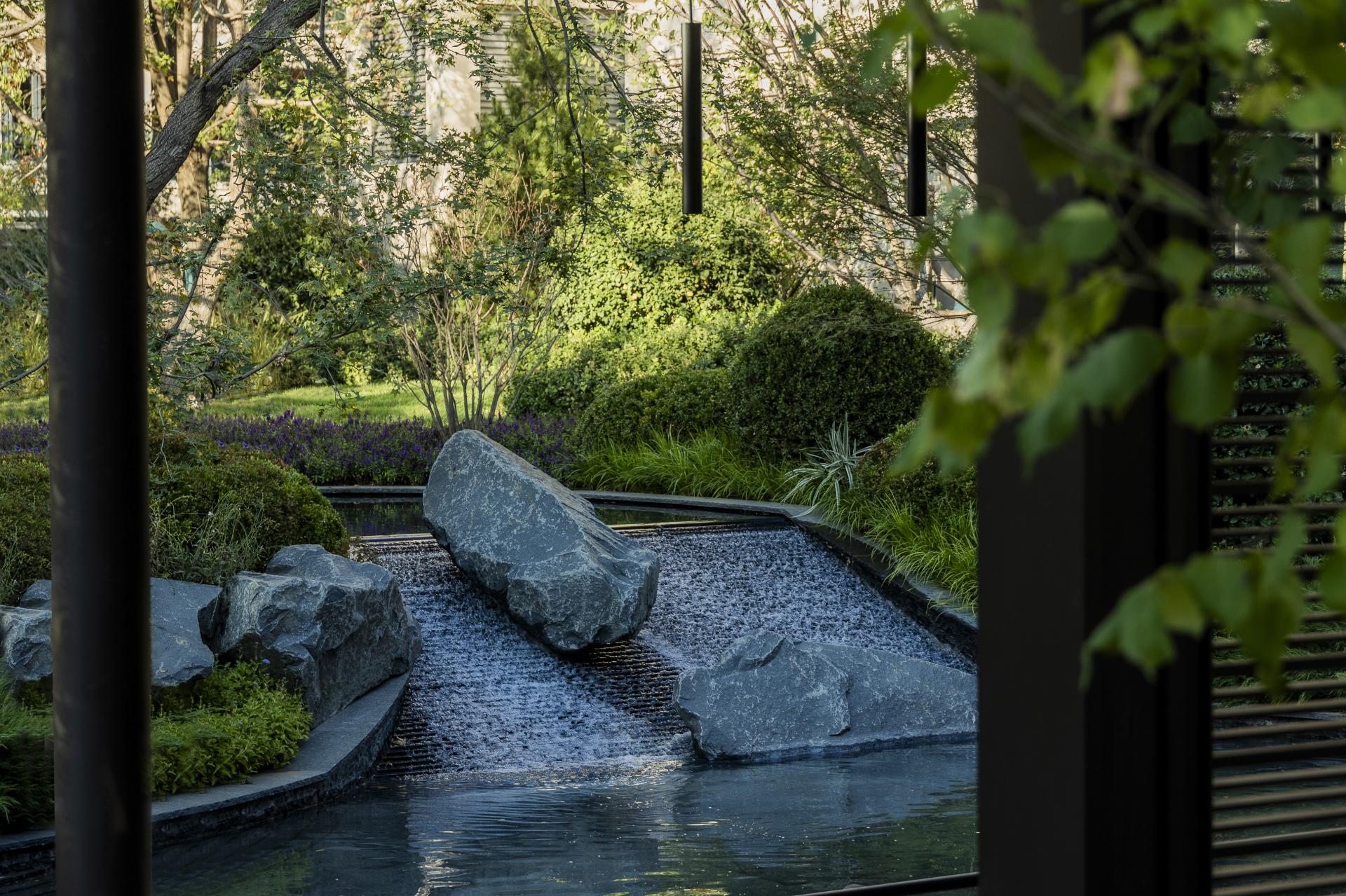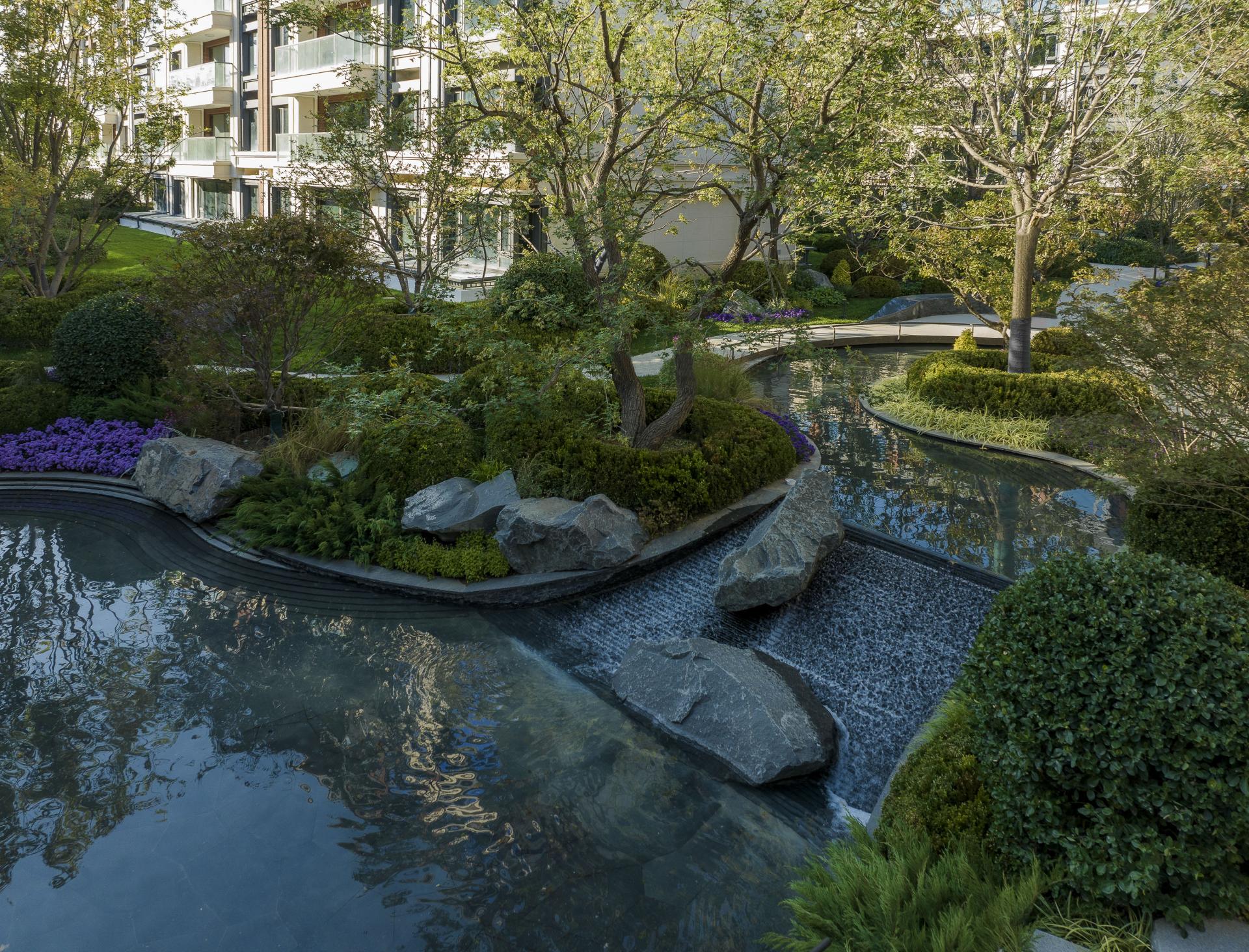 The area of high-quality apartment features a very rare 8,000-square-meter central axis space. The design of the landscape breaks away from the square architectural layout and adopts a curved composition as a whole. It makes multi-dimensional transitions between the facade and the plane. The garden paths and water systems are combined to form a double spiral structure. Thus, the garden paths sometimes seep into the water surface and sometimes are separated from it by plant clusters, presenting a series of natural valley landscapes such as flat bridges, cascading water, waterfront platform, and stone revetments. The garden path extending from this core area connects smoothly with the path leading home between the buildings, guiding the flow of people to gather here.