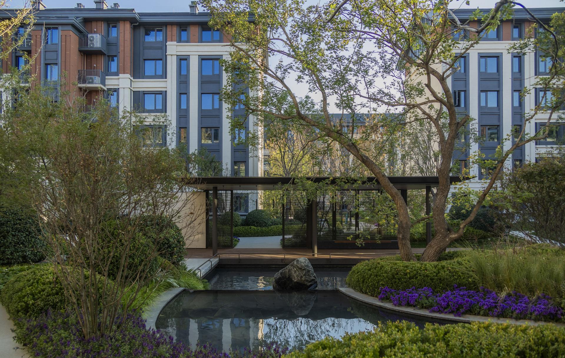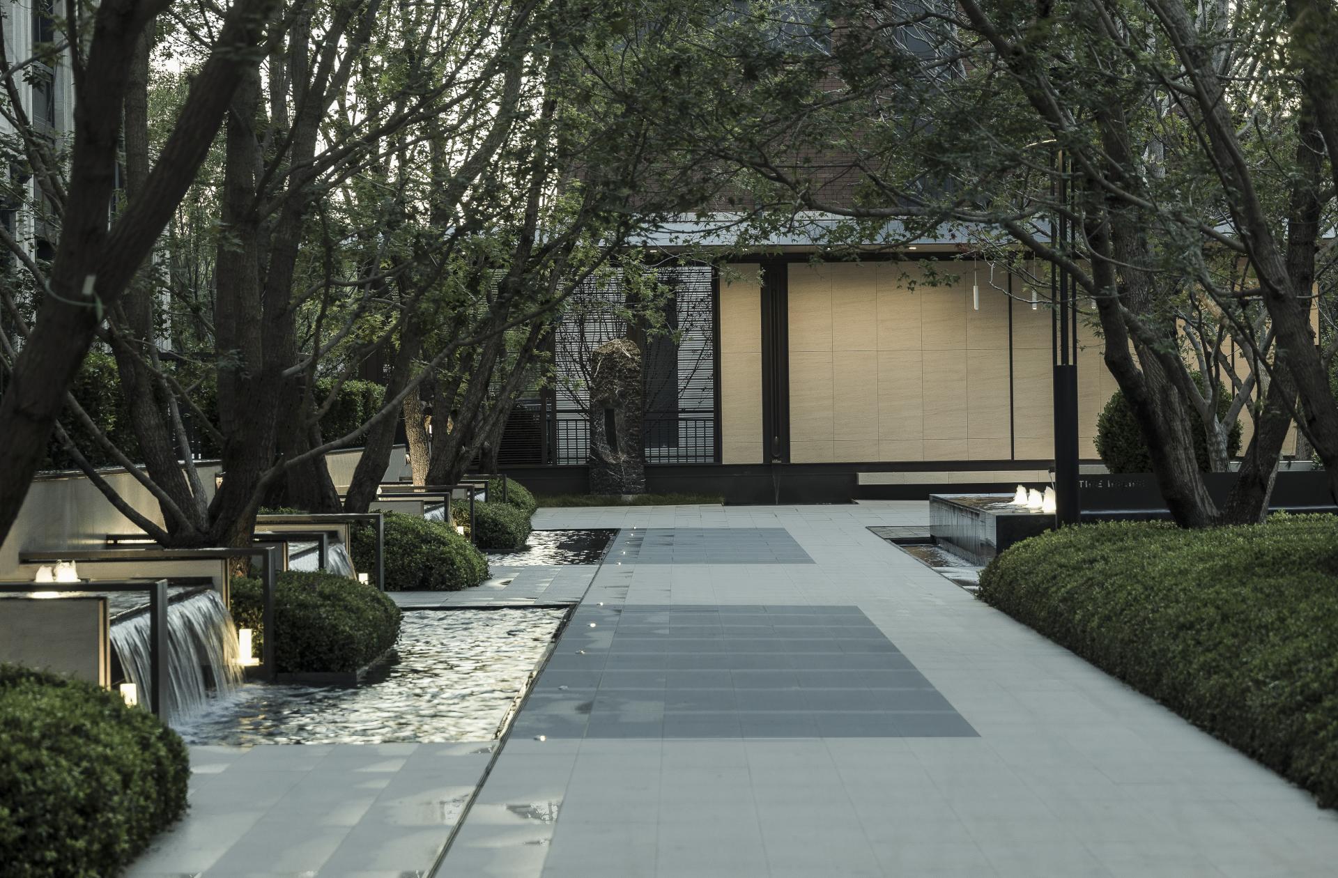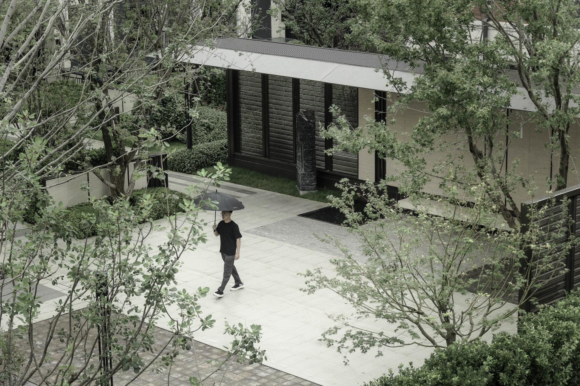 The townhouse area mainly consists of narrow lanes. The design integrates rich landscape elements, such as connecting corridors, mirror pools, cascading water, and placed stones, to decorate the space, with special selections of colorful-leaved large trees to enclose the area. The ground is paved with different materials to soften the boundaries and enhance the experience of the walking paths.