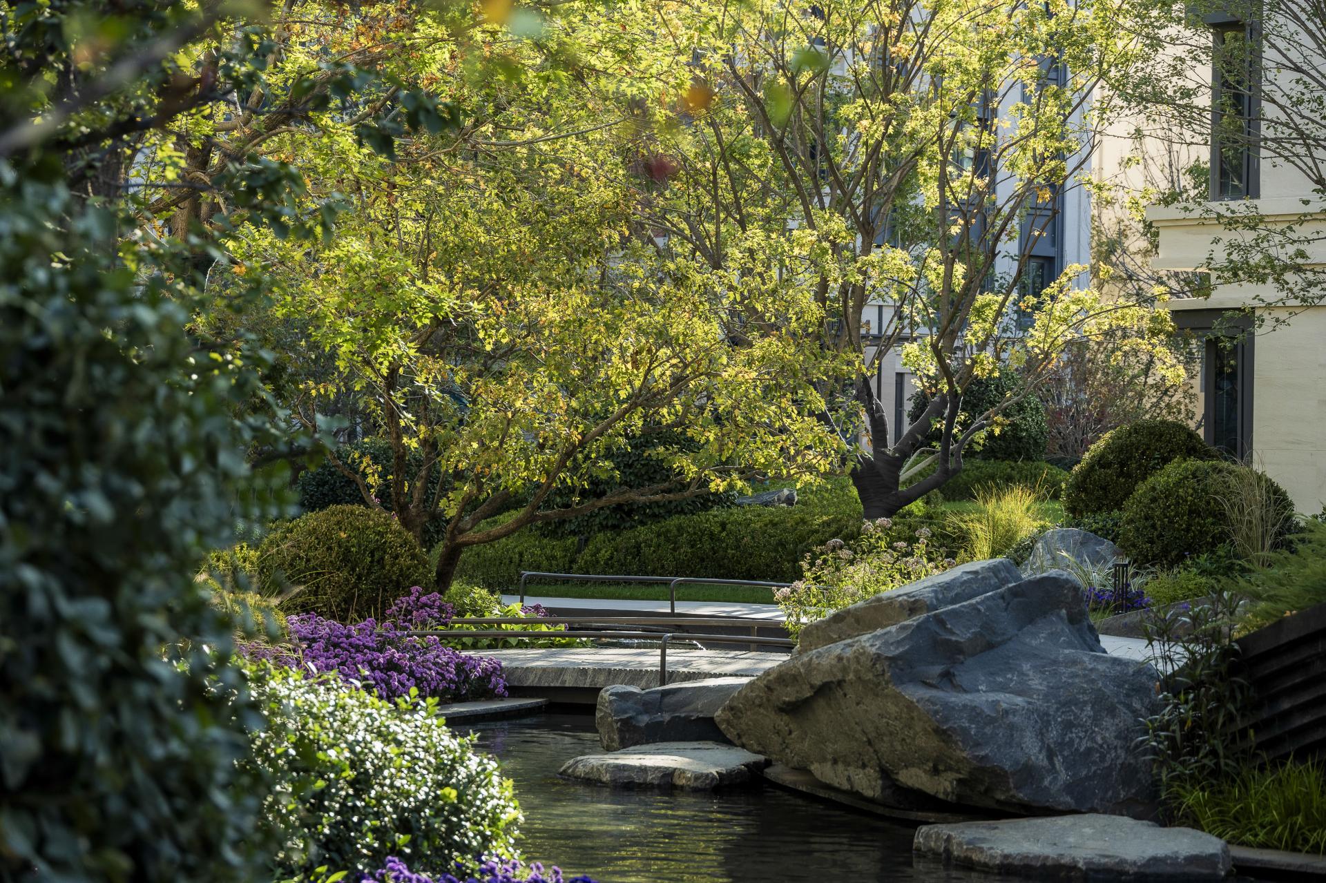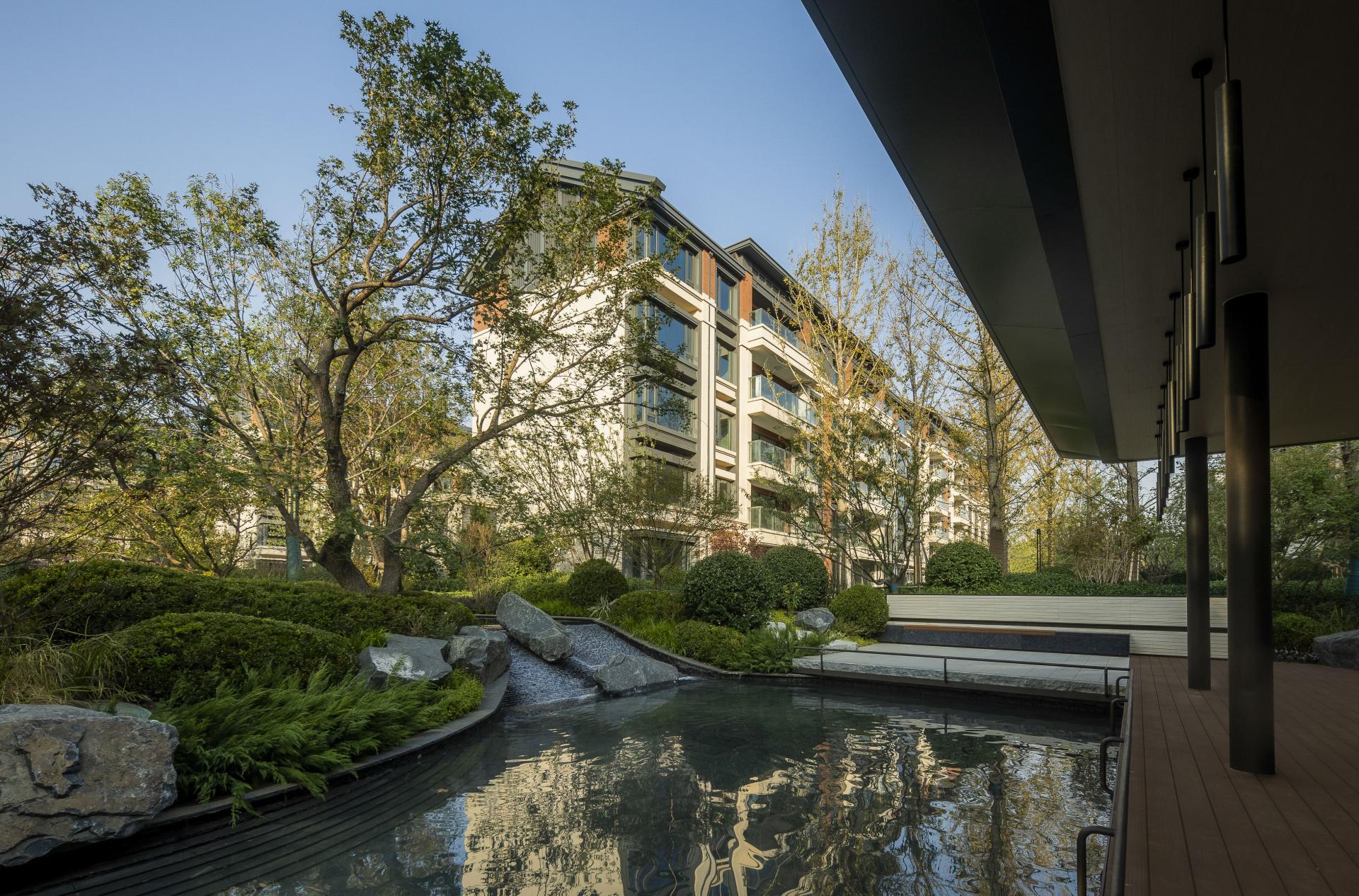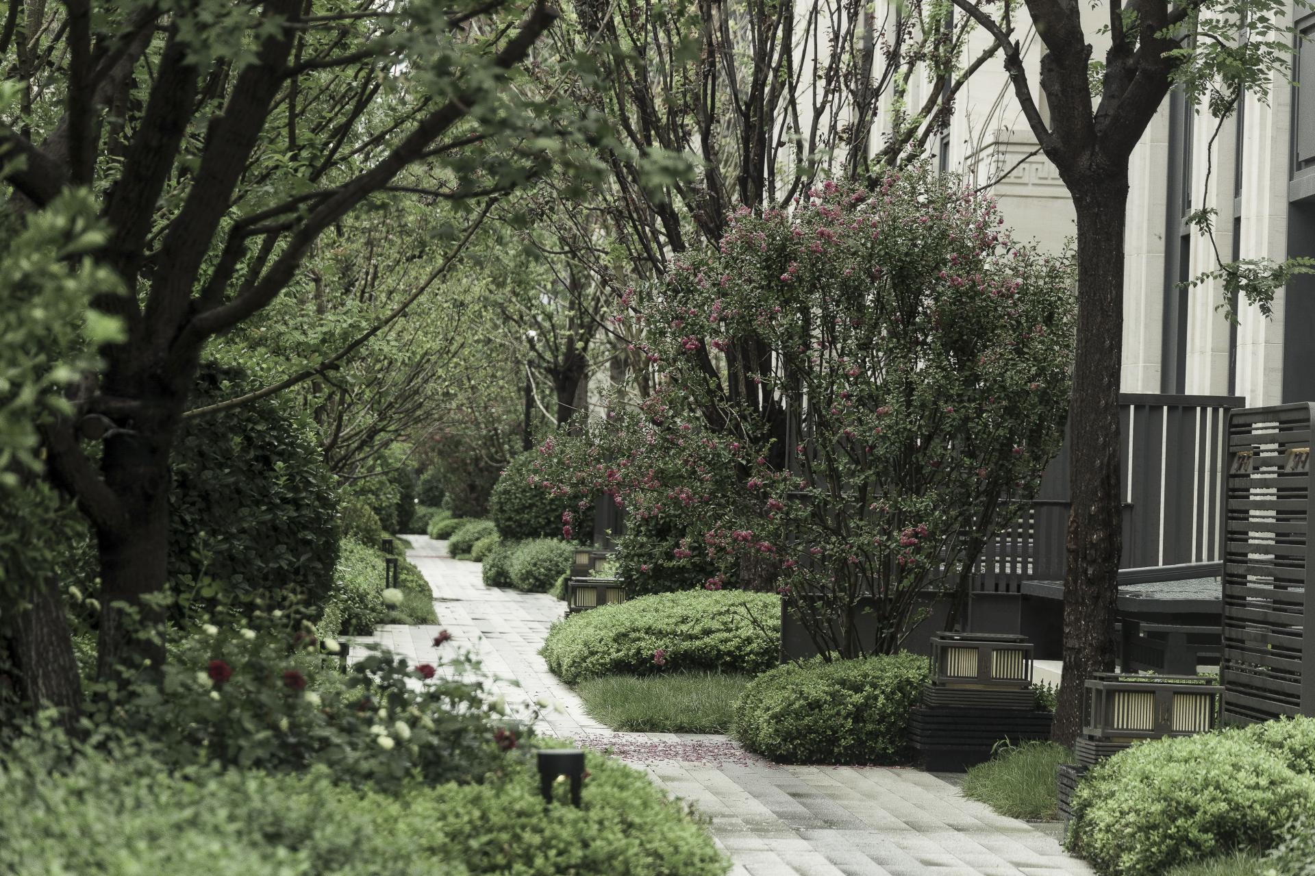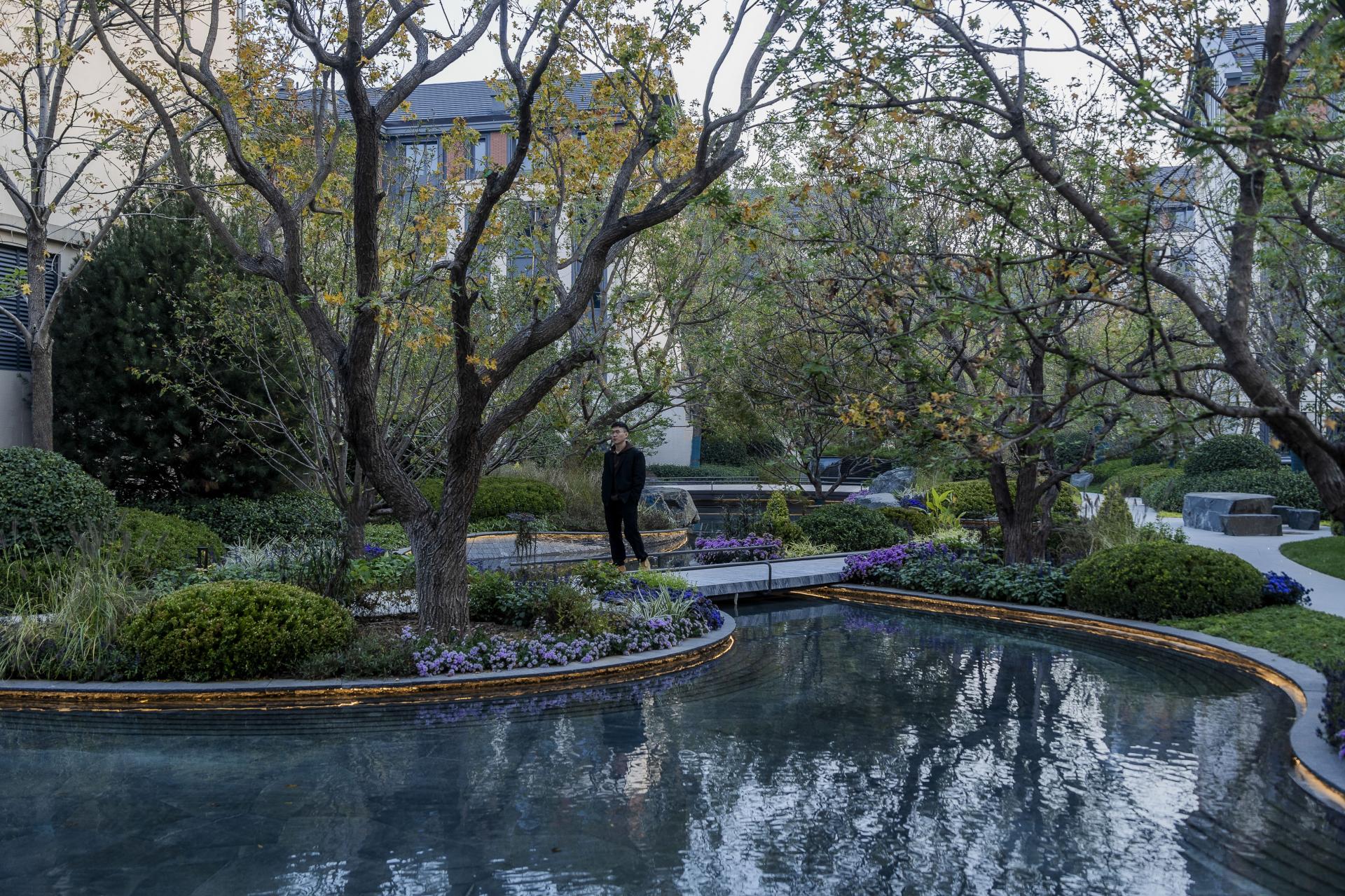 The townhouse area mainly consists of narrow lanes. The design integrates rich landscape elements, such as connecting corridors, mirror pools, cascading water, and placed stones, to decorate the space, with special selections of colorful-leaved large trees to enclose the area. The ground is paved with different materials to soften the boundaries and enhance the experience of the walking paths.
