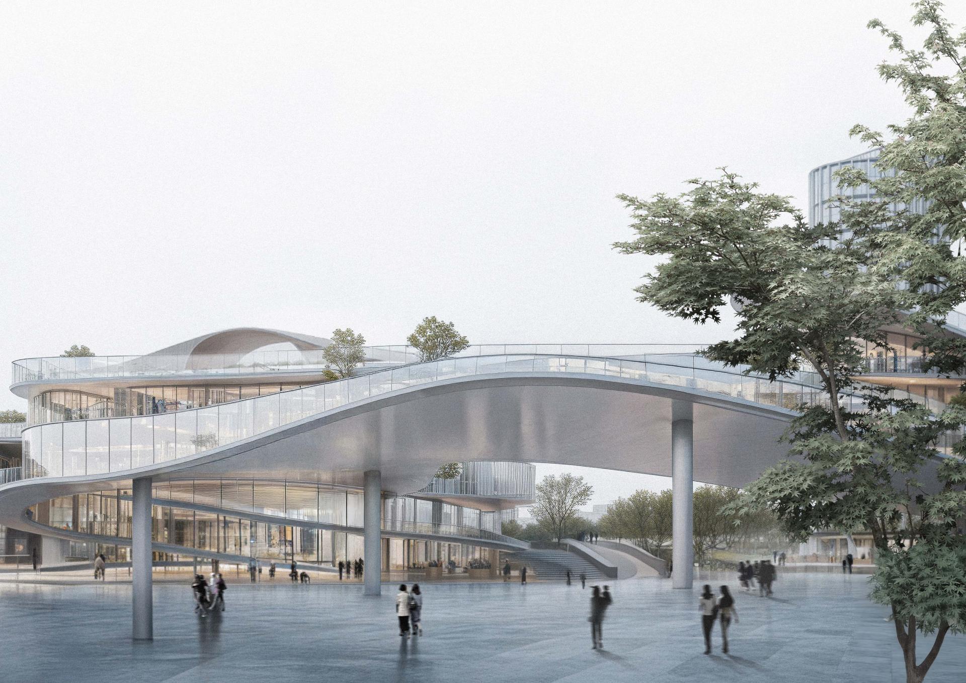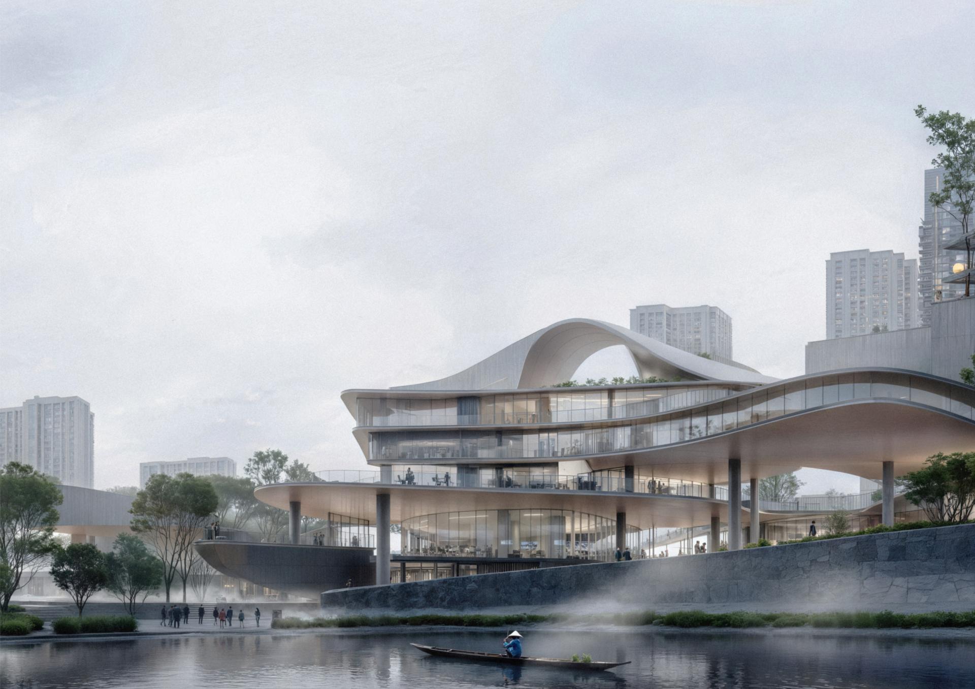 Programmatically, the project houses a culture exhibition gallery, and a community forum space. Public circulation flows across terraced walkways and rooftop decks, inviting visitors to engage with the river as both backdrop and narrative. The sculptural roof, clad in brushed metal, curves like a calligraphic stroke across the site — a soft yet assertive presence on the urban skyline.