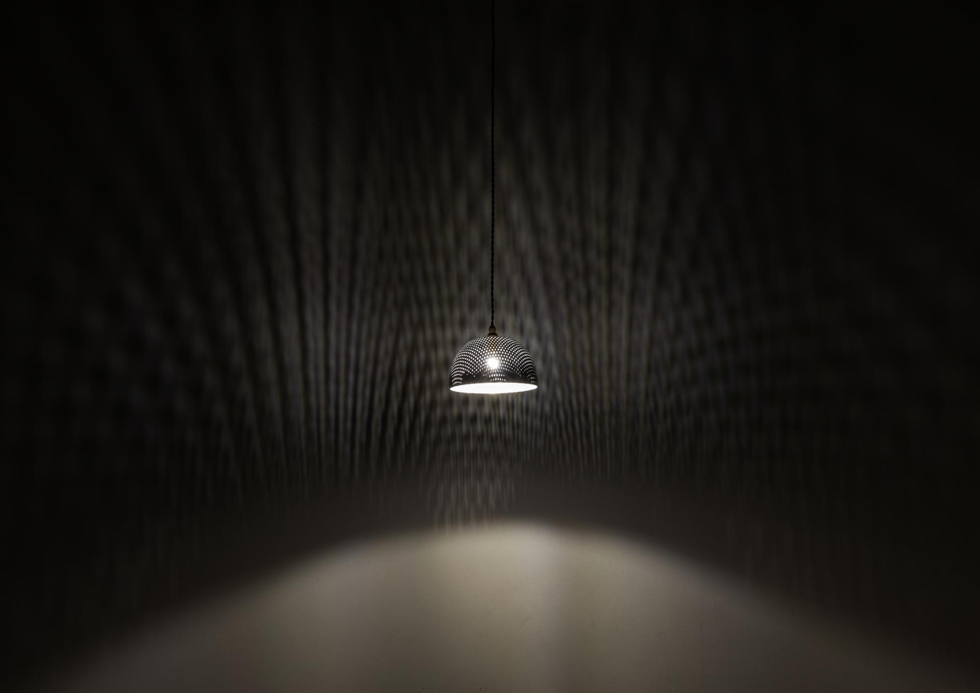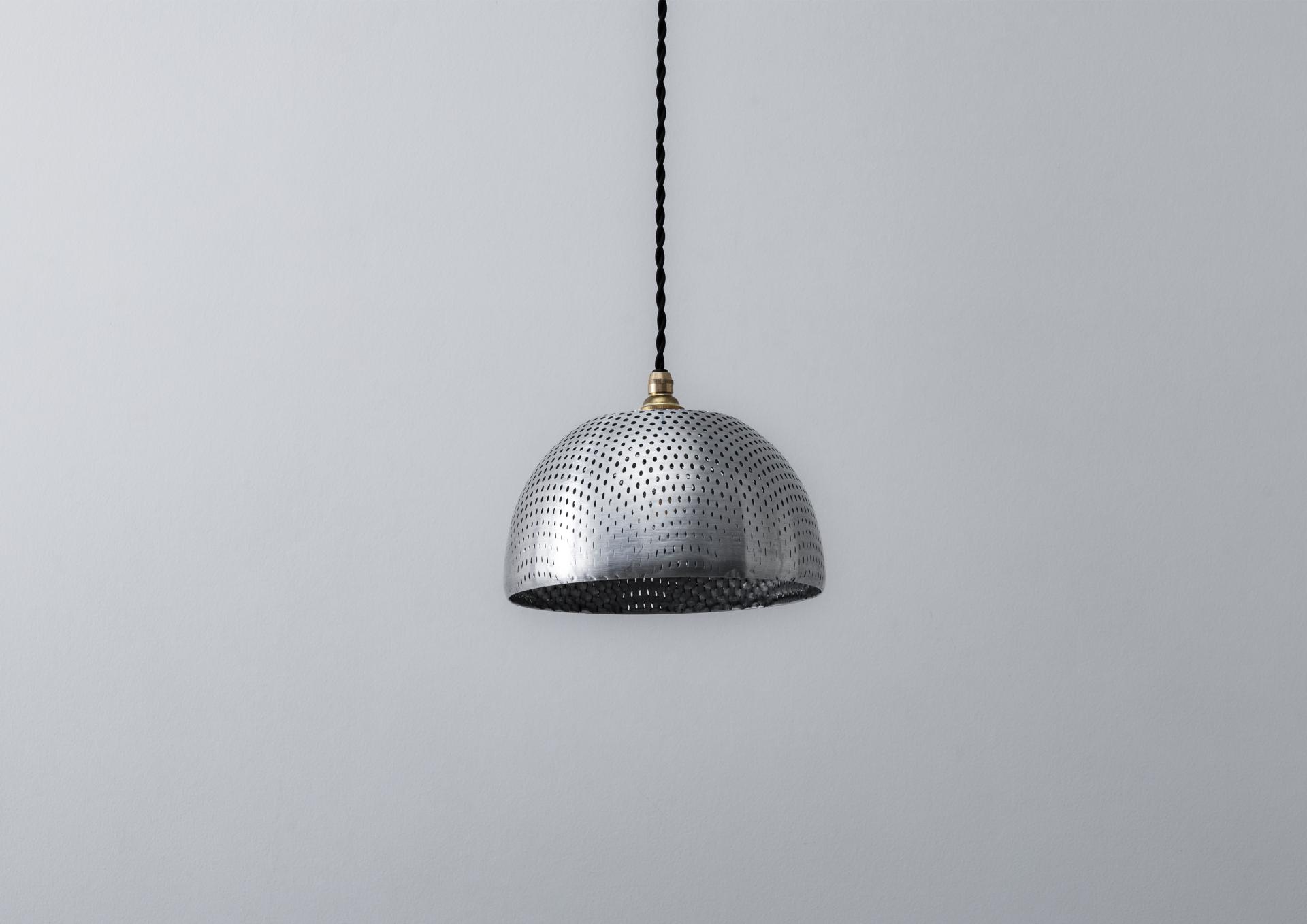 Perforated metal spinning lamp is made by using the spinning process on a variety of perforated metals to create unique patterns. The pattern changes depending on the angle at which the perforated metal plate is bent using the spinning process. If you bend it shallowly, the change in the hole will be small, and if you bend it deeply, the change in the hole will be large. By transforming existing perforated metal or original perforated metal through the spinning process, a variety of patterns can be created and the possibilities of this design are endless.