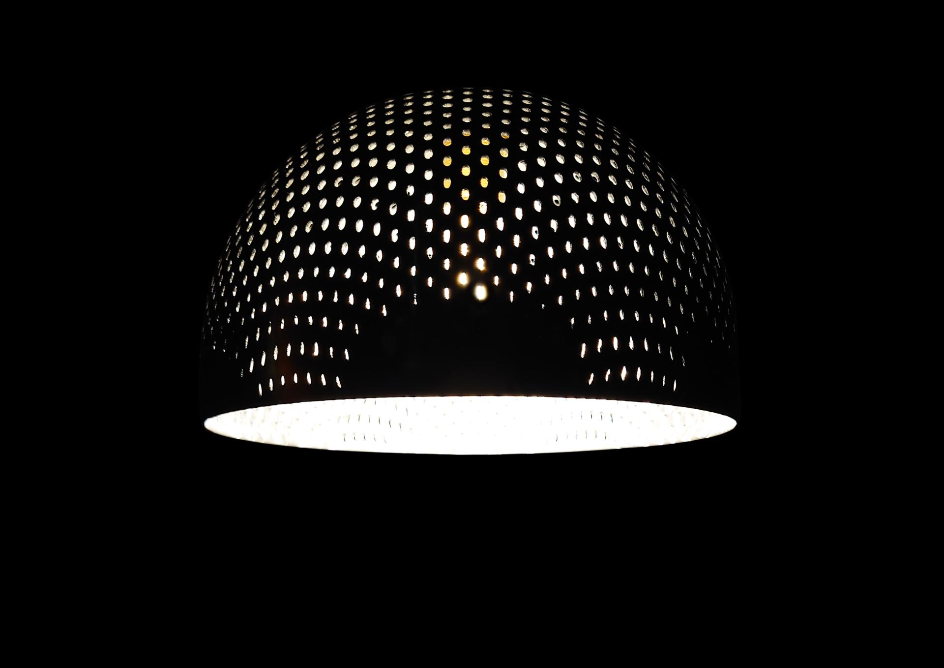The spinning process transforms the perforated metal plate into a hemisphere, creating a 3 dimensional special pattern. The pattern changes around the dome, so different patterns emerge depending on the viewing angle.
