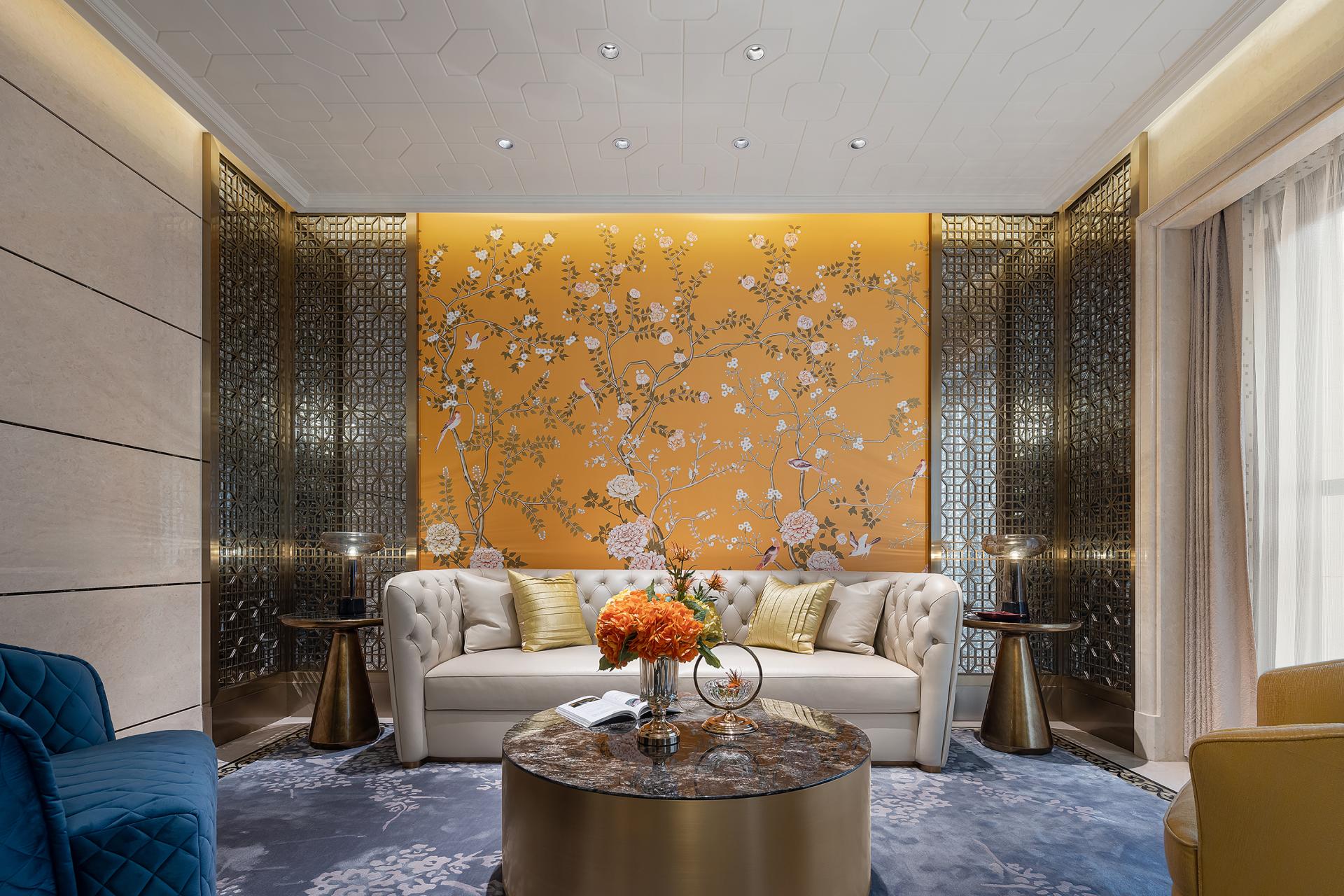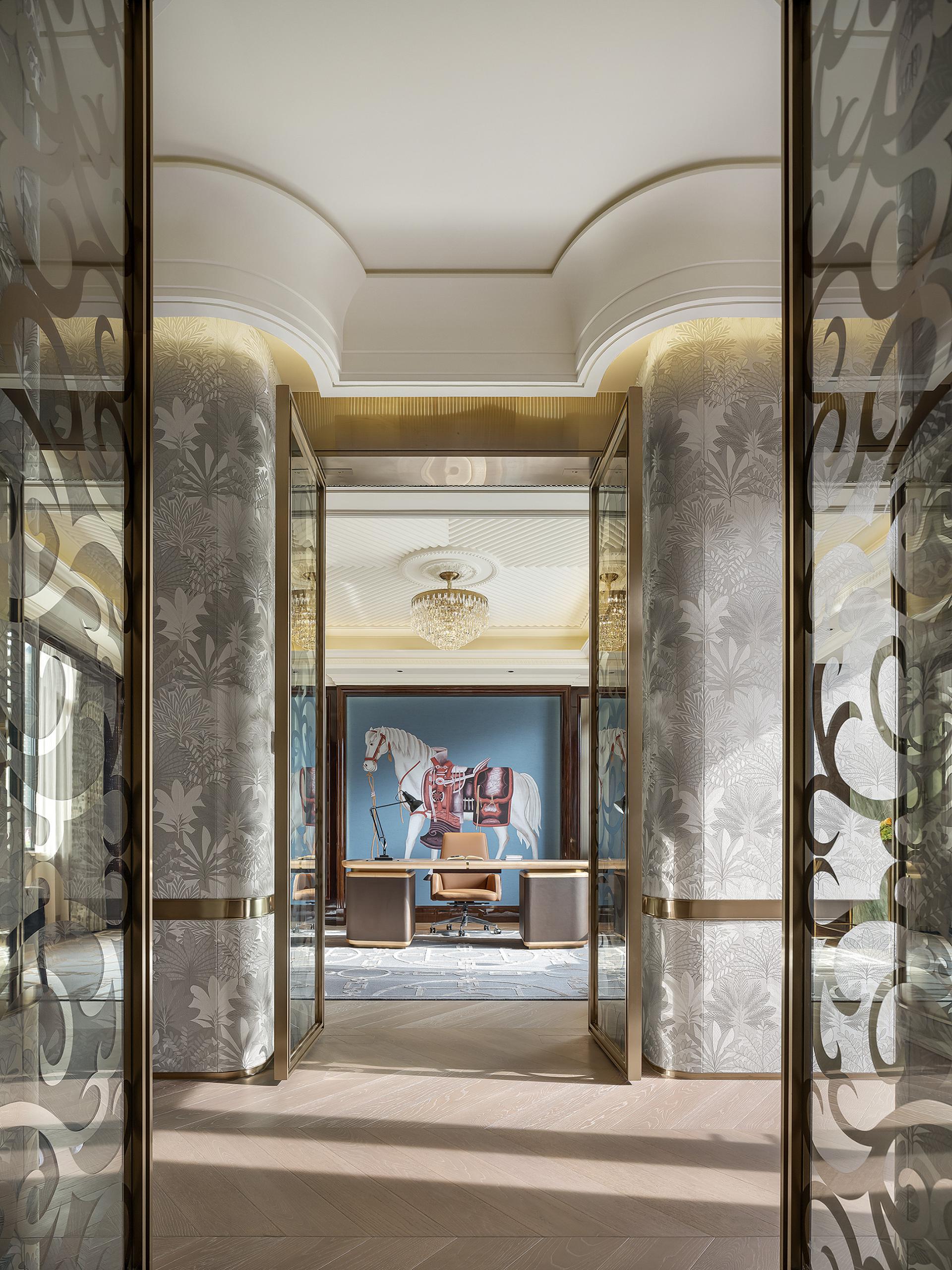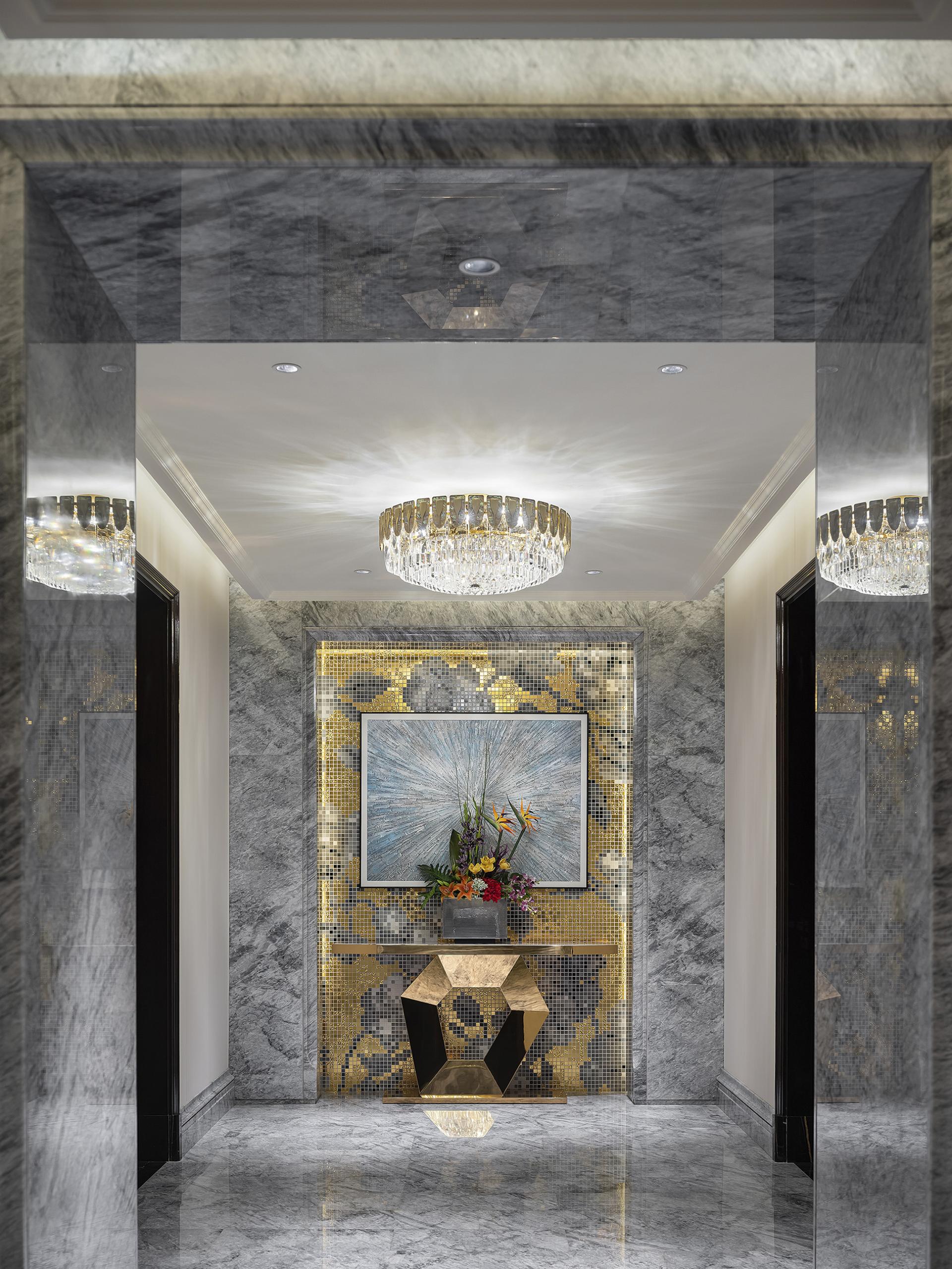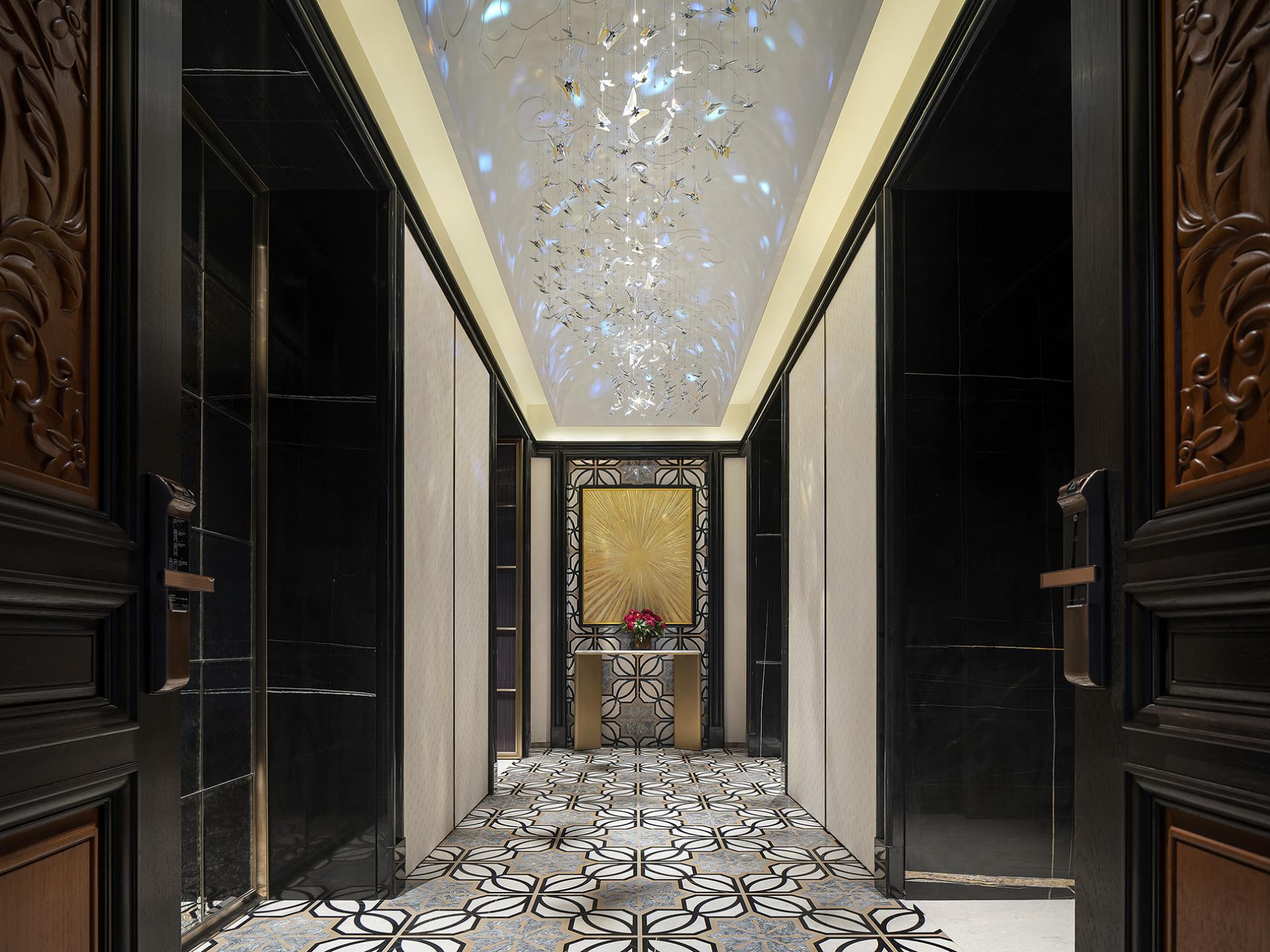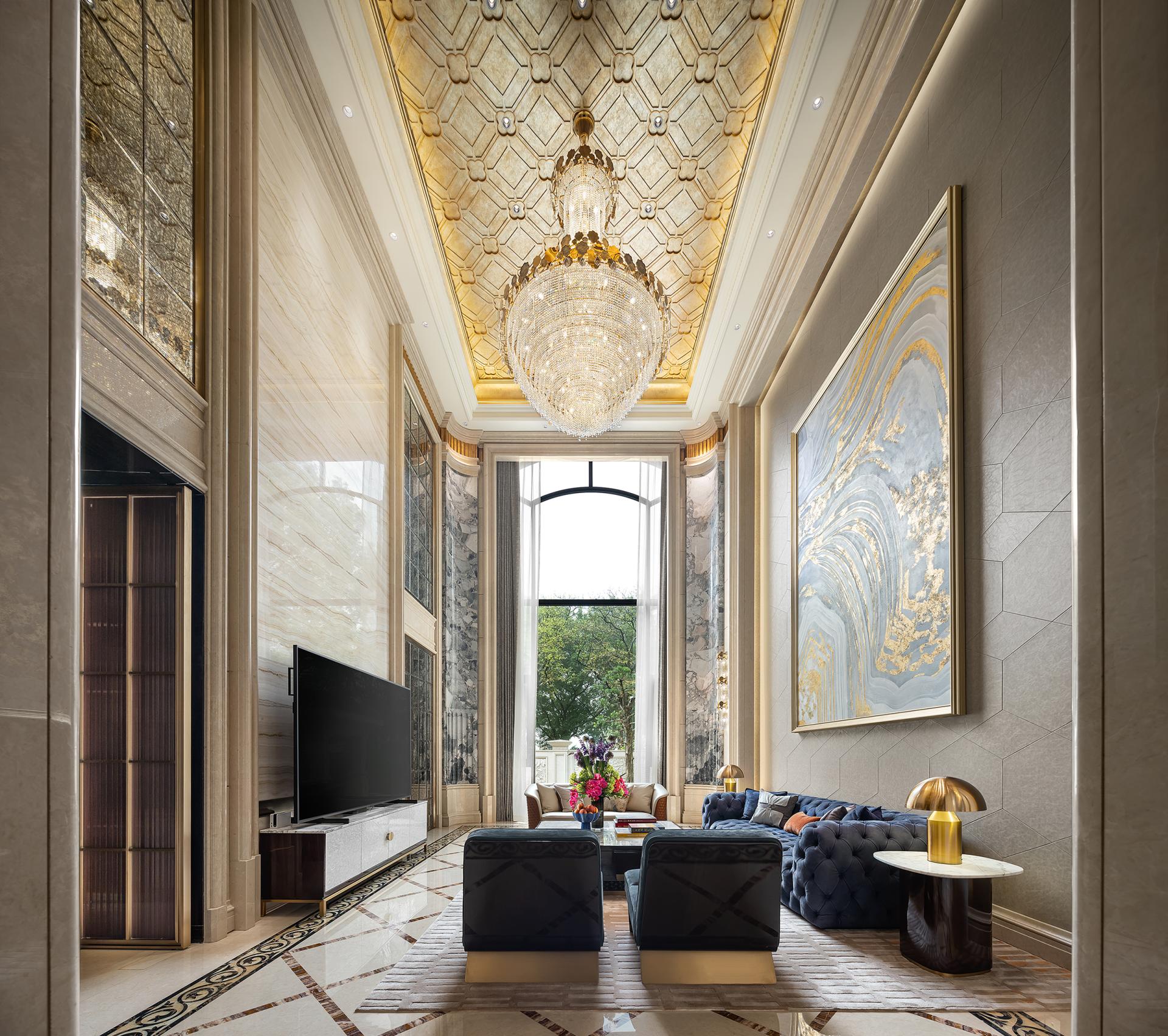 The interiors blend traditional Eastern motifs with modern Western geometry, forming a visually striking yet balanced composition. Luxury stone, art glass, and metallic accents establish a sense of opulence, while handcrafted details and smart home integration ensure sophistication meets practicality.