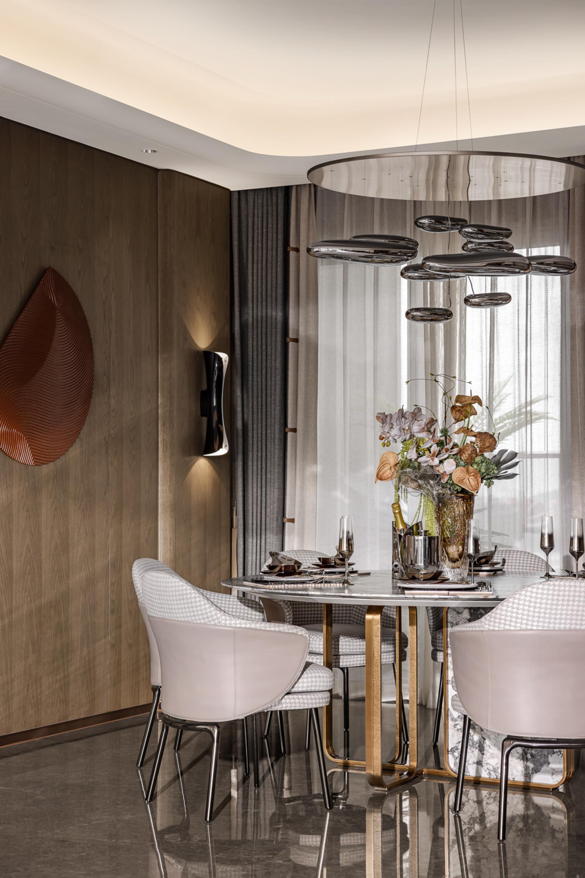Moving beyond the literal replication of traditional motifs, the design delves into the shared spirit of "pioneering ambition" and the Cantonese ethos of "inclusivity," translating culture through contemporary expressions. The sleek curves of yachts are reimagined as flowing spatial arcs and artistic chandeliers, while the silhouette of traditional gable walls is abstracted into rhythmic metal grilles and interplaying light. Rare Italian stone meets exquisite Cantonese woodcarving, forging a harmonious East-meets-West luxury aesthetic. Every element is sculpturally integrated into the space, crafting an ambiance of international refinement and rooted cultural identity.