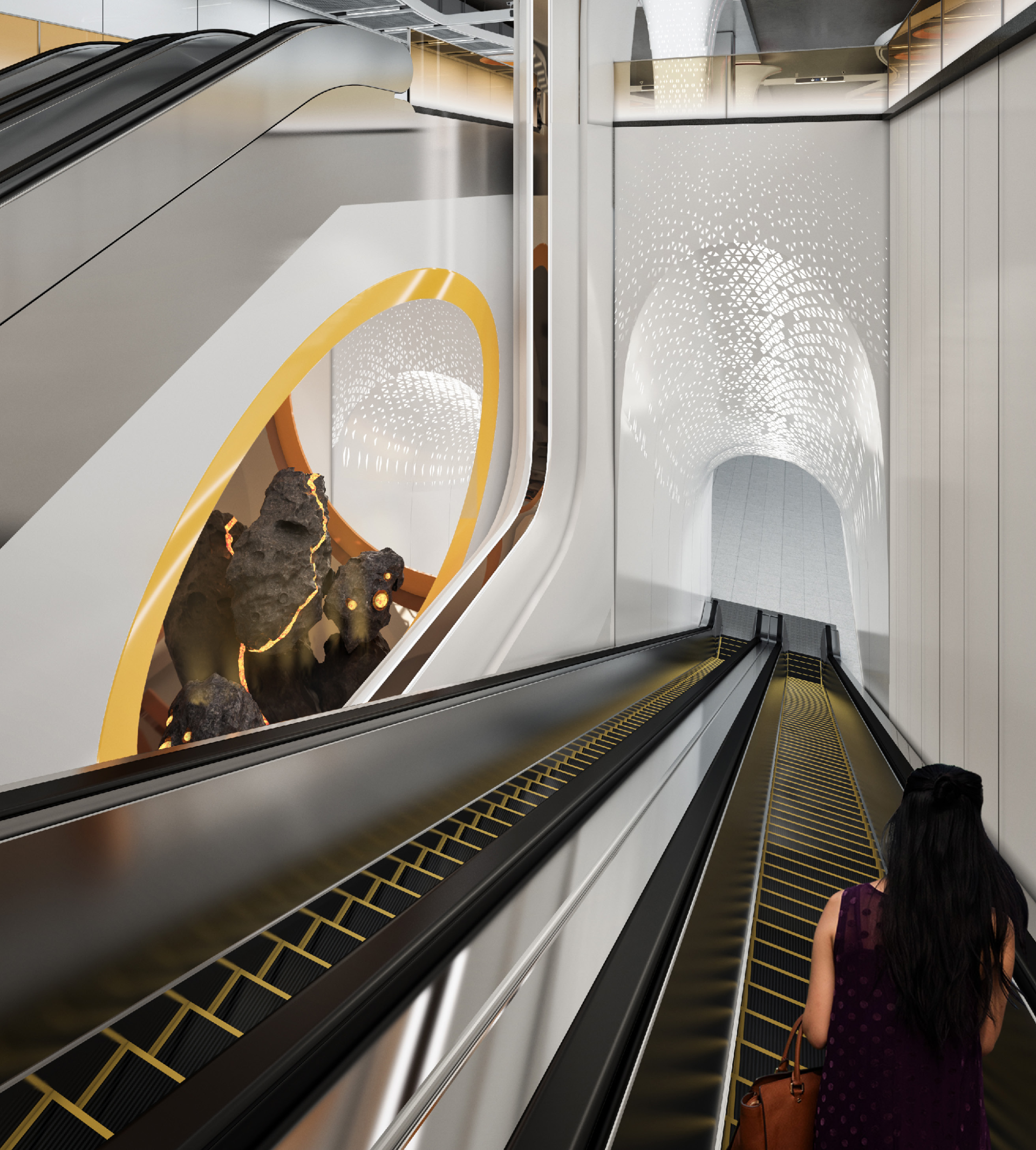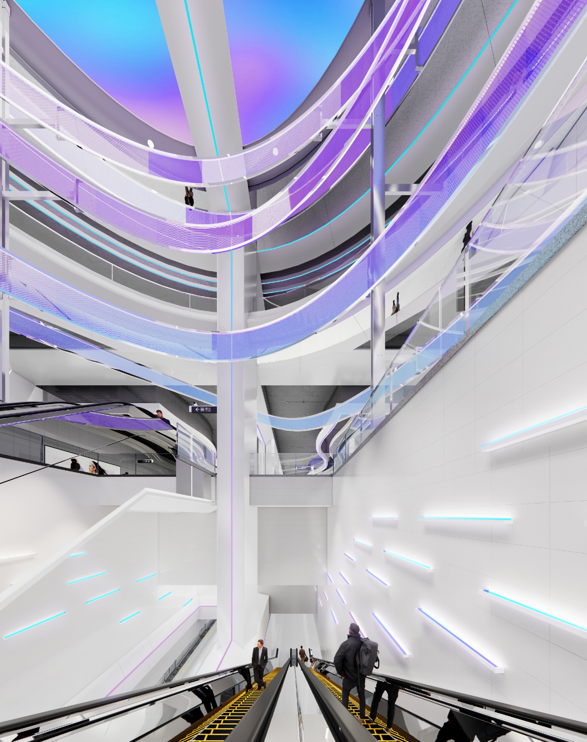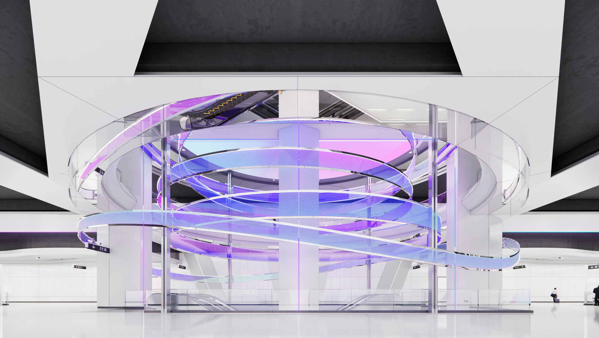 The atrium area features the themed art installation “Convergence·Connection,” combining column arrays and light grid matrices to visually express the three-dimensional intersection relationship between the Guangzhou-Huadu Intercity Railway and the planned Lines 26 and 29, thereby strengthening the station’s landmark image as a regional transportation gateway.