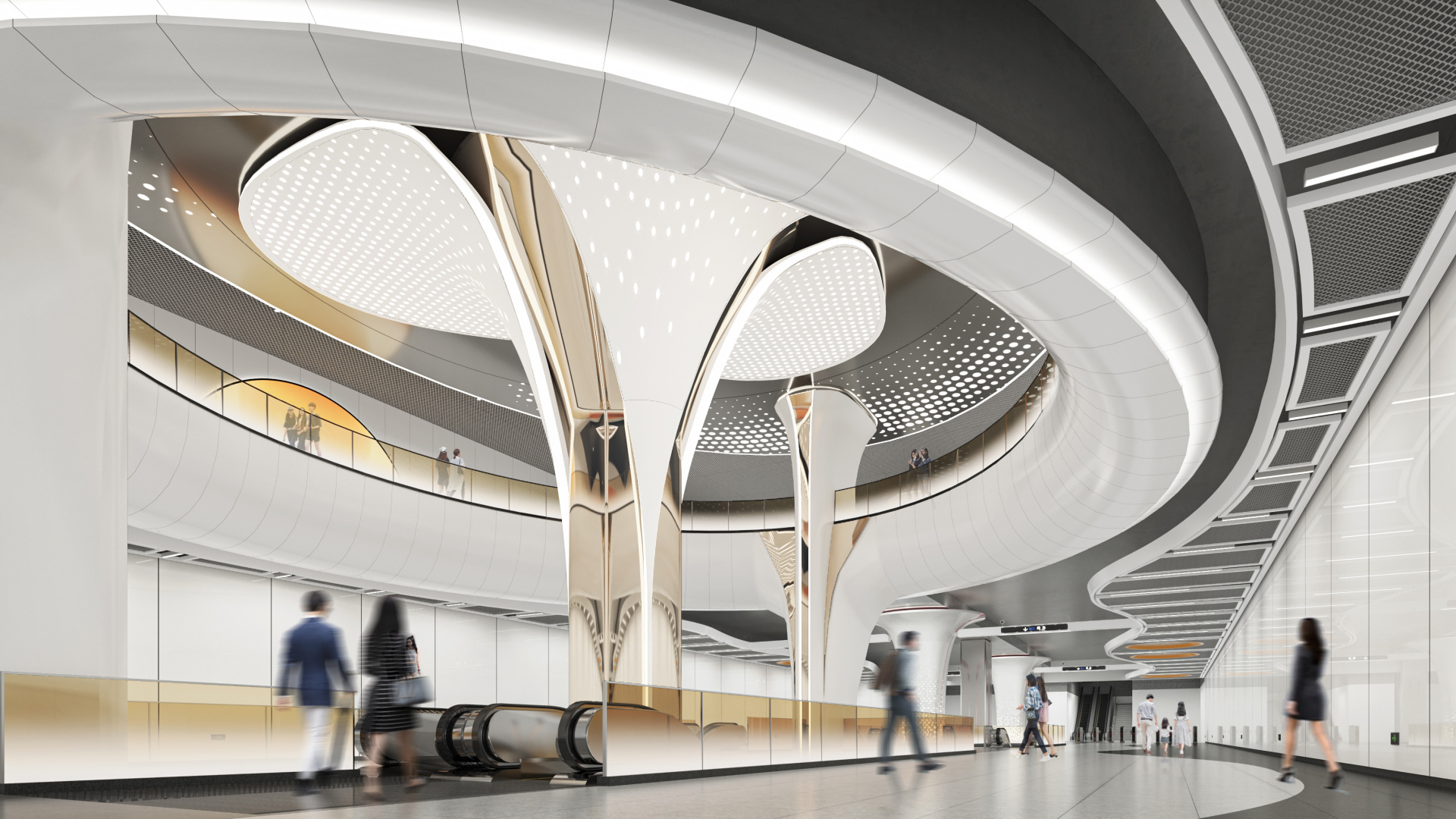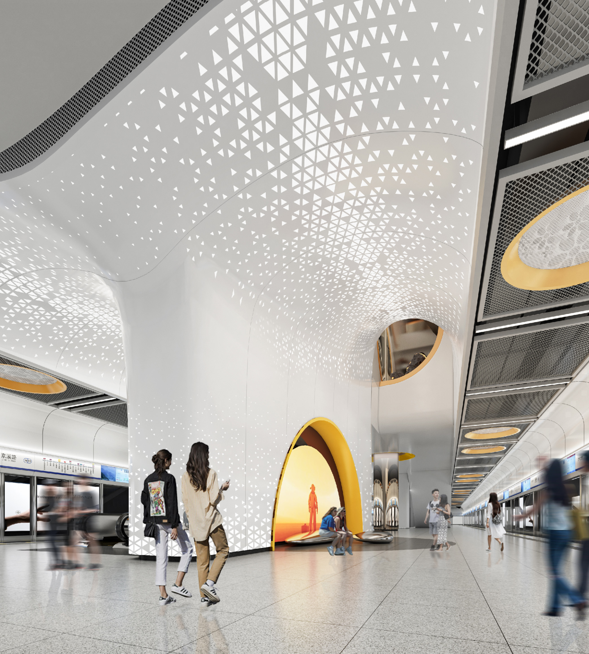 The design centers on “vertical release,” maximizing the height of the concourse and platform through the “exposed original civil construction ceiling technique” to construct an open and efficient vertical spatial system, thereby optimizing the transfer flow experience. The spatial interface employs a combination of “uniform modular aluminum panels + linear light strips,” using contrast between solid and void and flowing rhythms to guide passengers in orderly dispersal, alleviate the sense of oppression in narrow spaces, and enhance transparency and wayfinding.