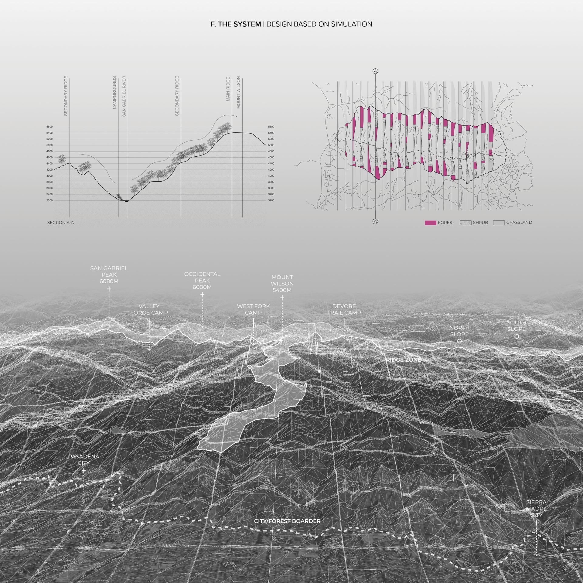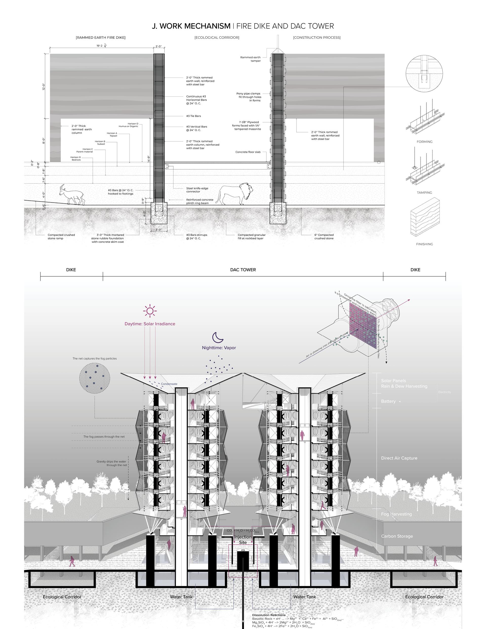 The project introduces an integrated ecological infrastructure composed of fire breaks, a rammed-earth fire dike, and a pair of Direct Air Capture (DAC) towers in the wildfire-prone Angeles National Forest, California. Beyond fire containment, the towers serve as multifunctional climate infrastructures: they capture atmospheric CO₂, harvest fog and rainwater, generate solar energy, and inject CO₂-water mixtures into subsurface storage. Public engagement is central—visitors can access elevated watchtowers and educational platforms, while ecological corridors ensure safe animal migration. These hybrid systems combine fire resilience, carbon mitigation, water management, and community participation into one replicable typology.