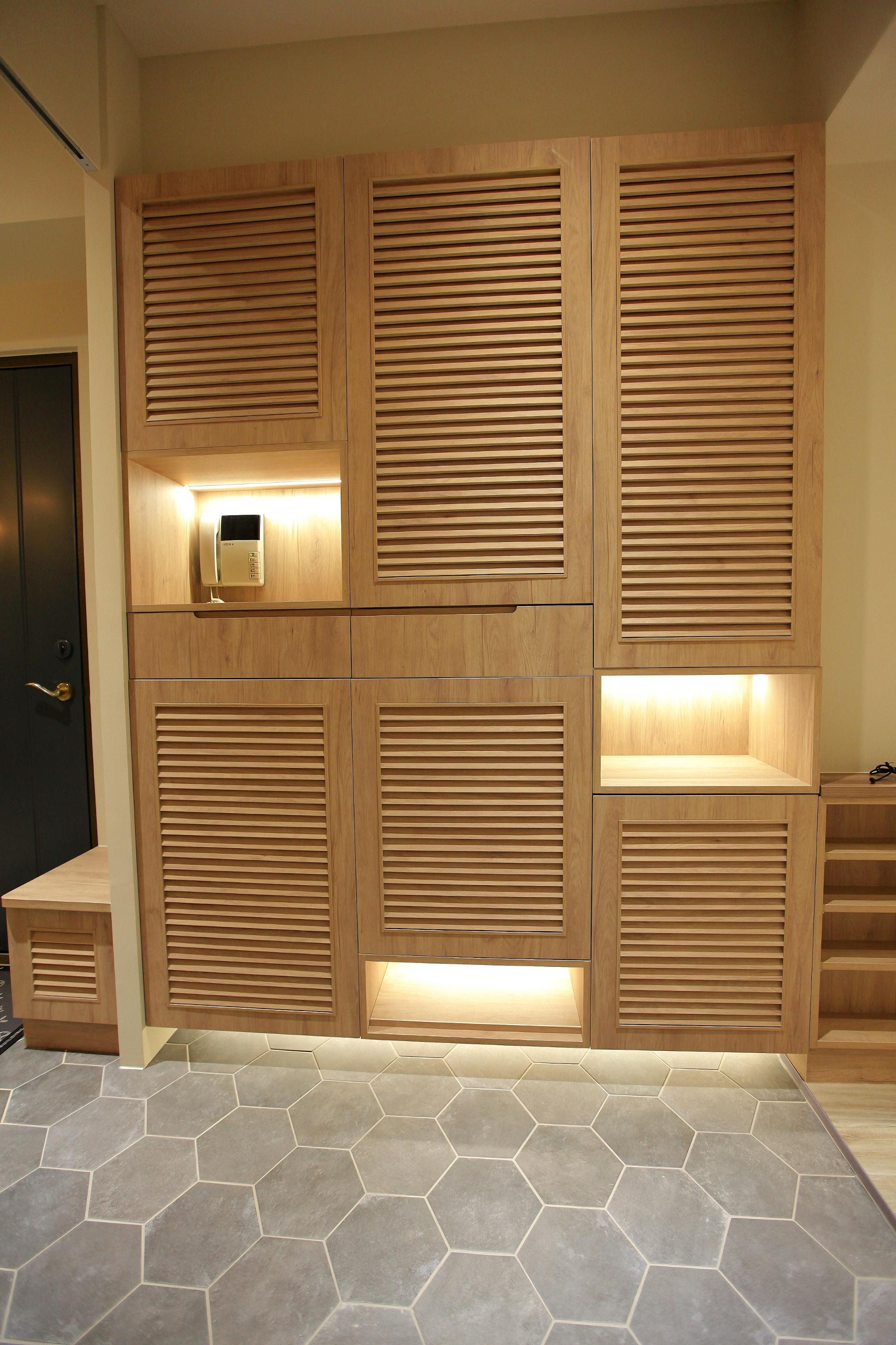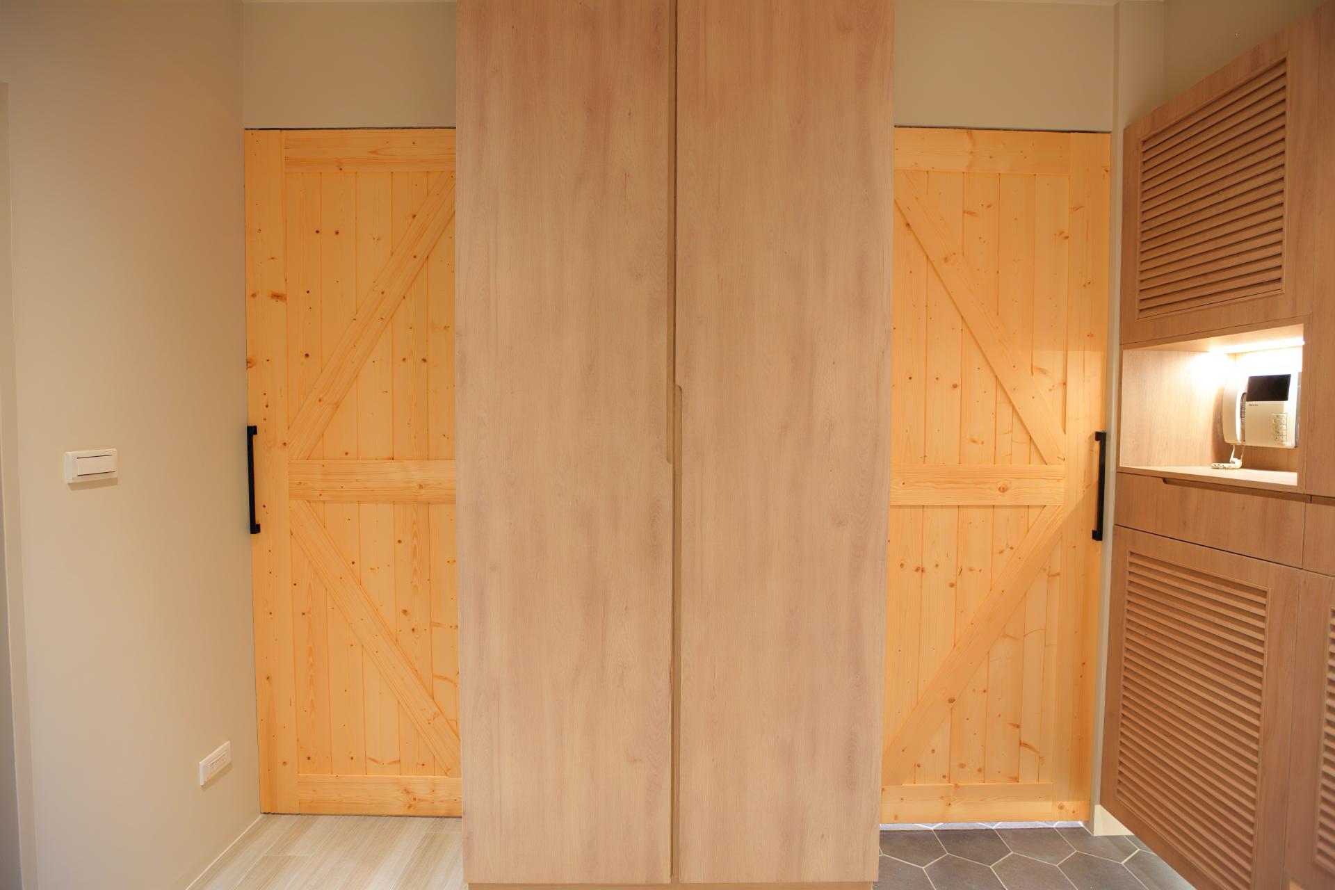 Louvered doors are strategically used in transitional areas, such as the entrance cabinet, to improve ventilation and introduce dynamic natural light. A soft-close solid wood sliding door separates the living room and kitchen without enclosing the space, preserving an open flow while defining distinct functional zones.