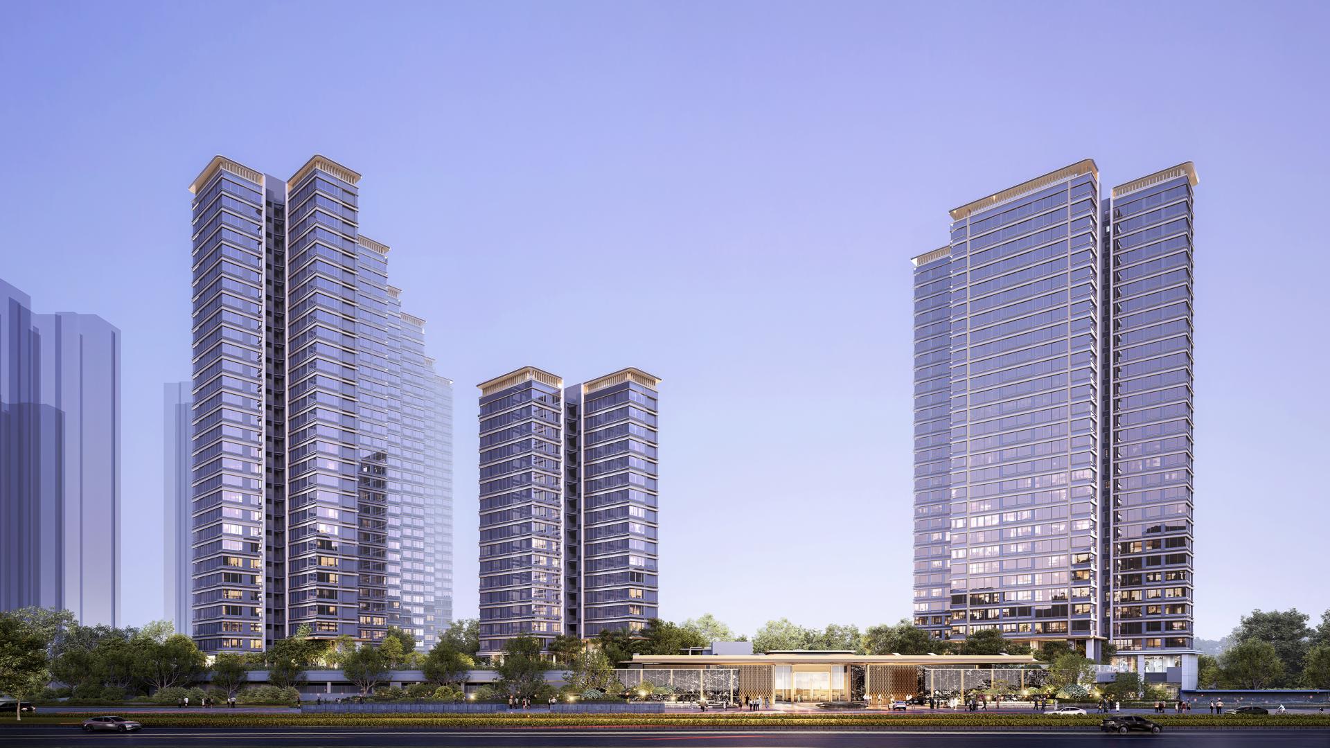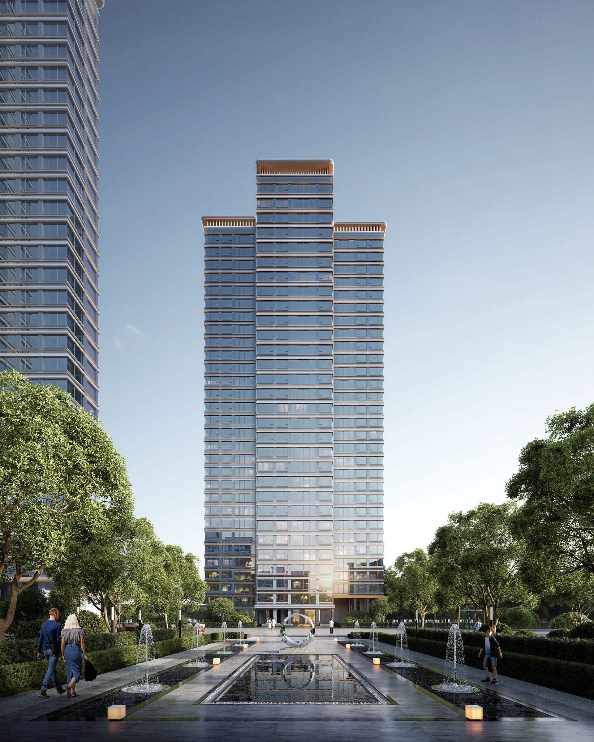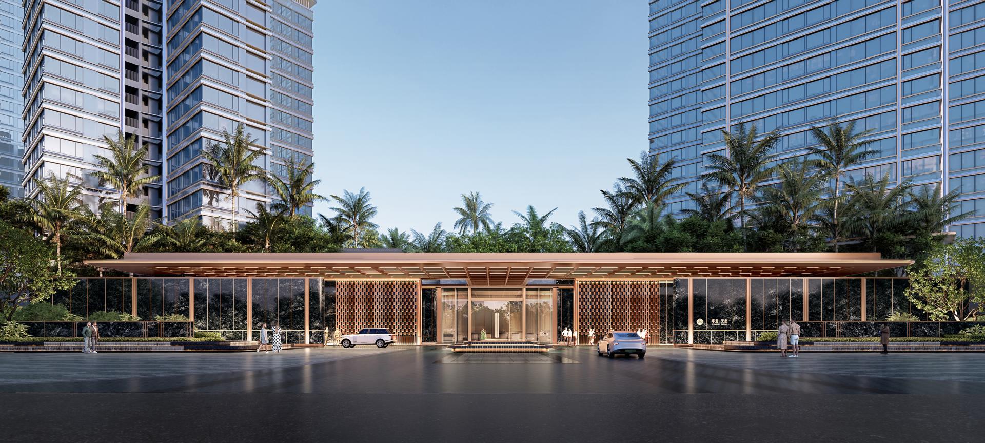 The building façades embody a modern minimalist aesthetic that expresses the architecture's unique character, creating an urban interface that is both grand and distinctive. Large expanses of glass enhance indoor lighting and views. Utilizing primarily glass and aluminum panels, the façades feature meticulous attention to detail and refined components, elevating the overall architectural quality. The grand and dignified entrance gatehouse, with its simple yet refined materiality and construction, reinforces the project's premium positioning. Given the scarcity of land in central urban areas and the need to maximize value, the project responds with creative and distinctive residential architecture.