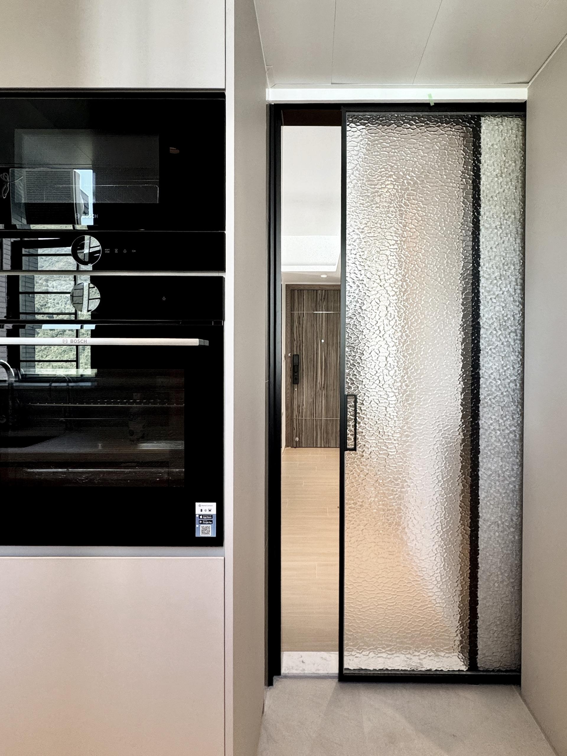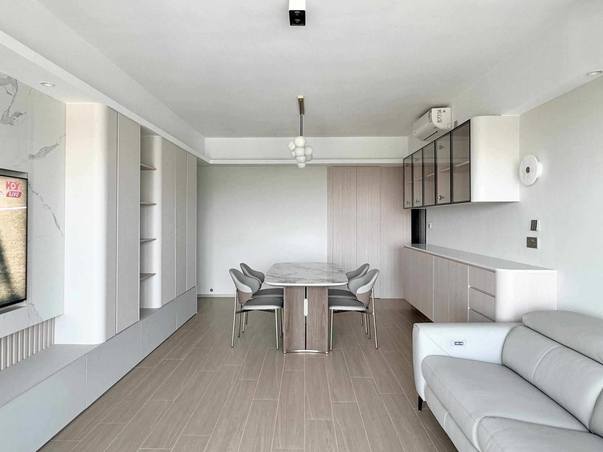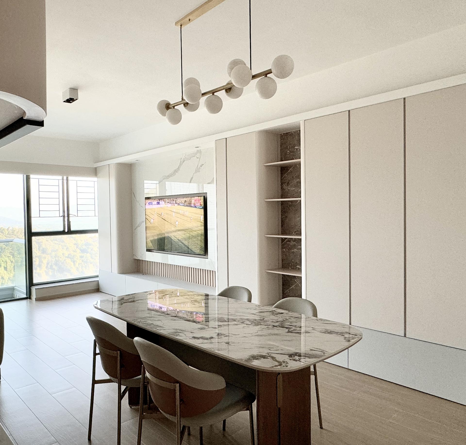 Significant spatial reconfiguration included converting the maid’s bathroom into a laundry room and reallocating the maid’s bedroom to expand the kitchen and storage, allowing for a larger refrigerator without compromising countertop space. A slatted wall subtly conceals the storage room entrance, blending functionality with aesthetics. The living and dining areas feature a custom TV wall with integrated storage and display, incorporating materials such as marble, glass, and aluminum for a refined yet serene ambiance. Bedrooms emphasize natural, muted materials to foster privacy and tranquility, contrasting with the polished living spaces. Bathrooms use marble-effect tiles and focused lighting to create a relaxing environment with practical storage.