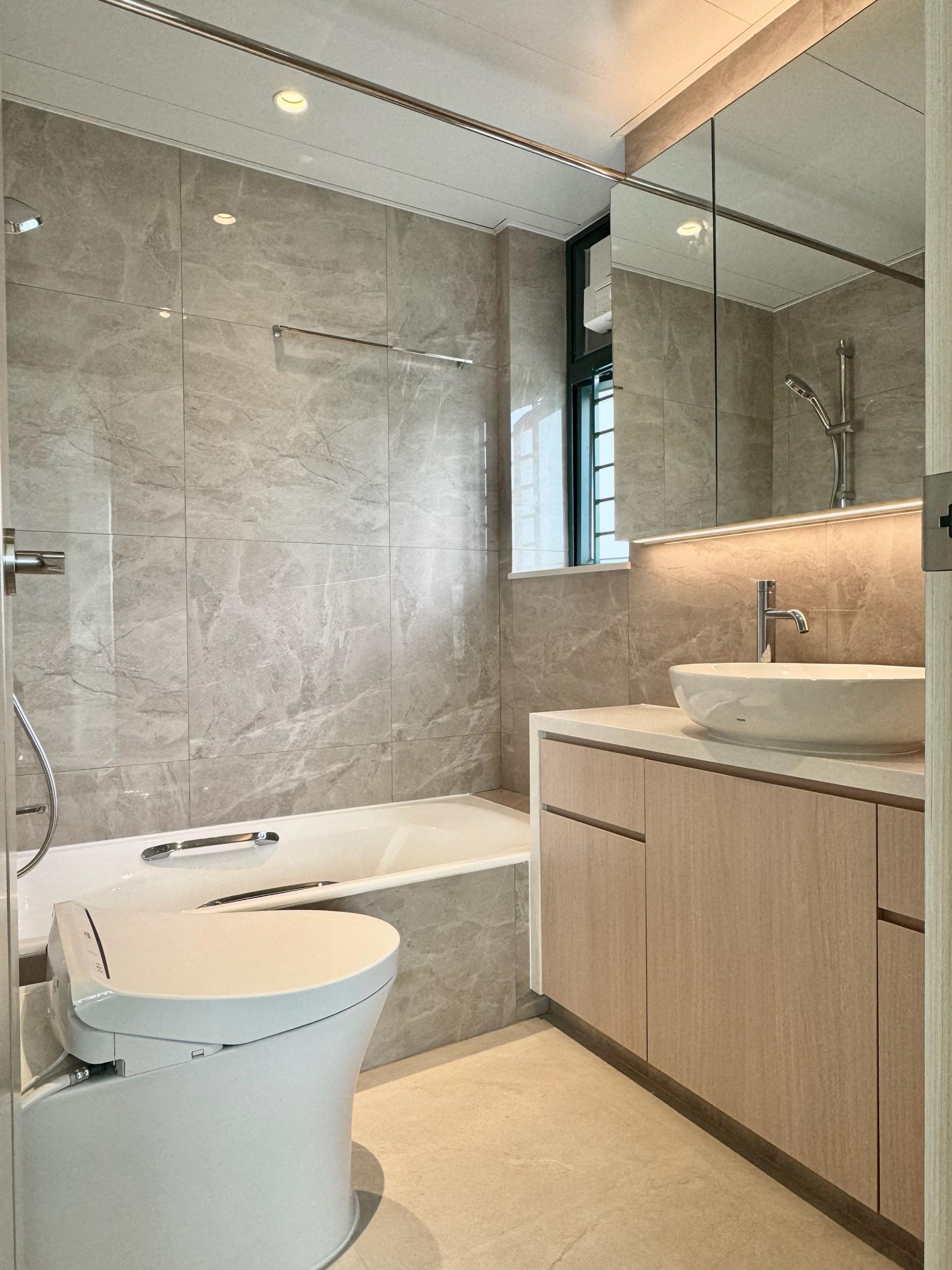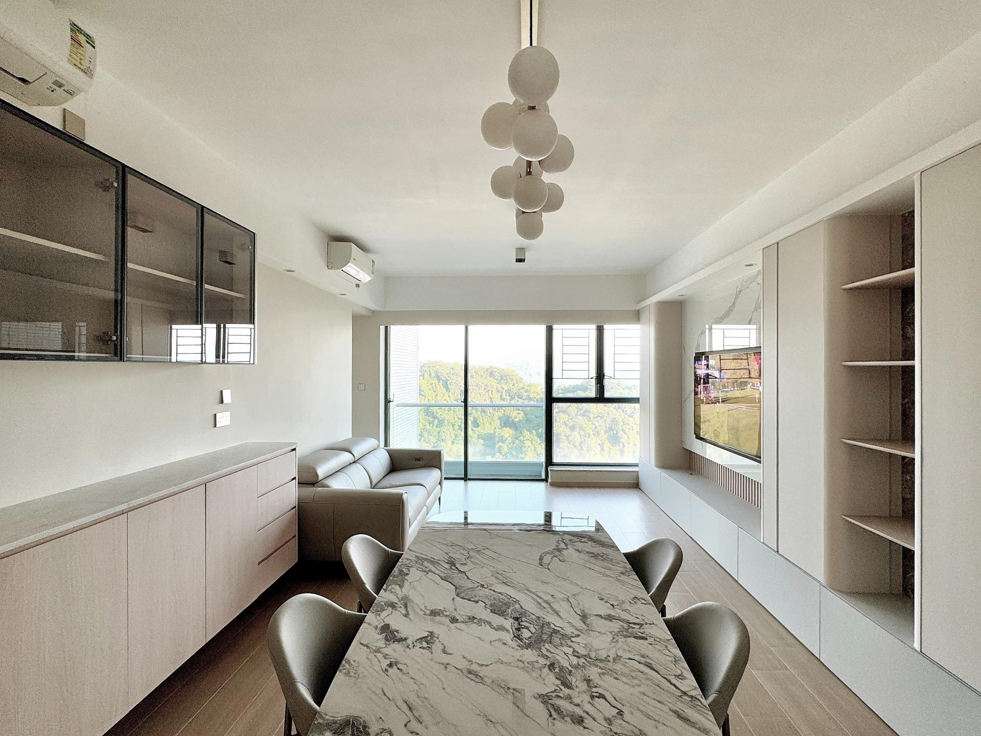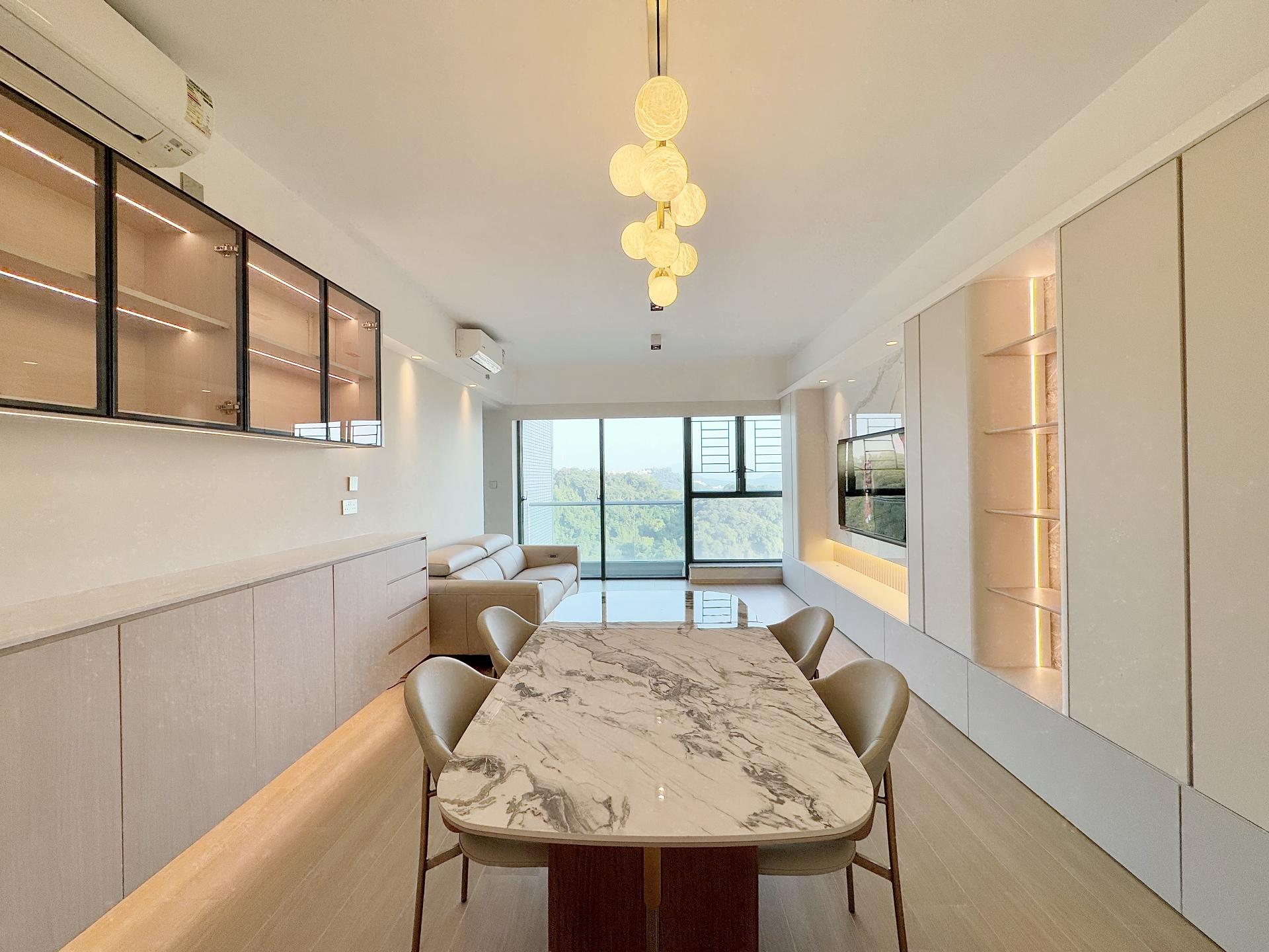 Significant spatial reconfiguration included converting the maid’s bathroom into a laundry room and reallocating the maid’s bedroom to expand the kitchen and storage, allowing for a larger refrigerator without compromising countertop space. A slatted wall subtly conceals the storage room entrance, blending functionality with aesthetics. The living and dining areas feature a custom TV wall with integrated storage and display, incorporating materials such as marble, glass, and aluminum for a refined yet serene ambiance. Bedrooms emphasize natural, muted materials to foster privacy and tranquility, contrasting with the polished living spaces. Bathrooms use marble-effect tiles and focused lighting to create a relaxing environment with practical storage.