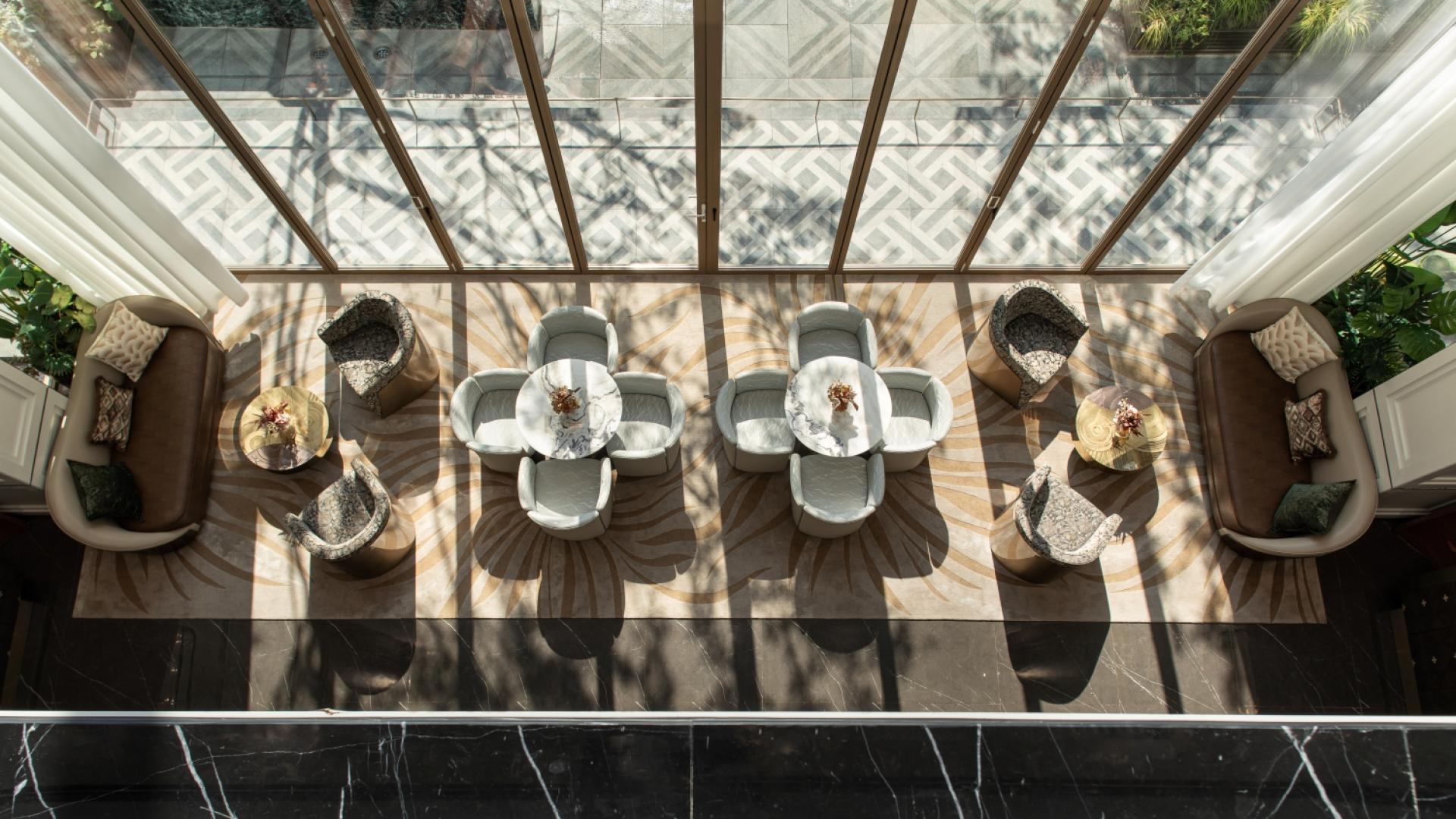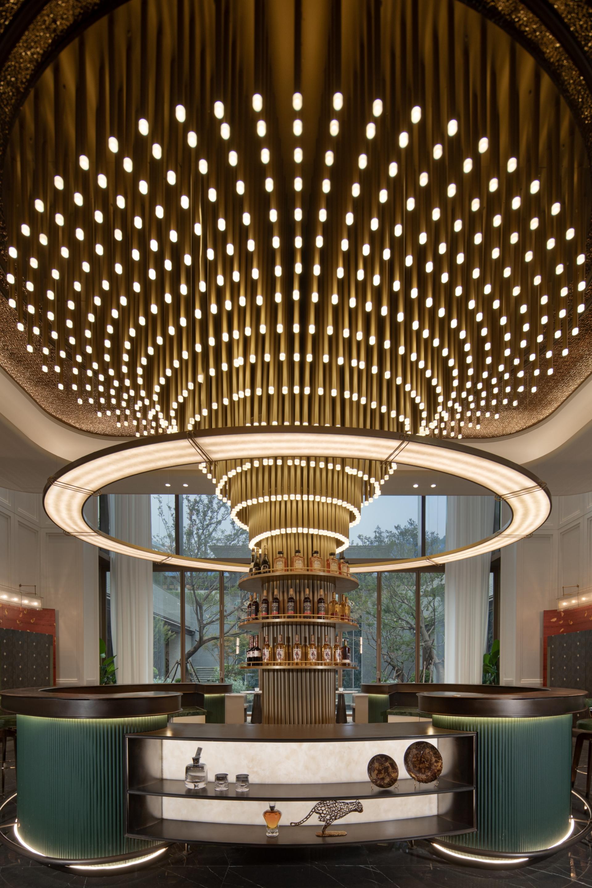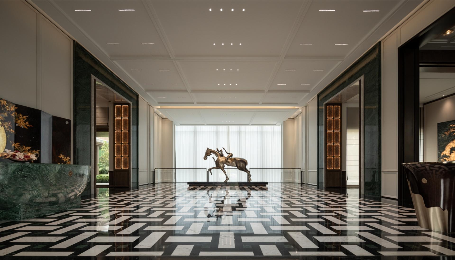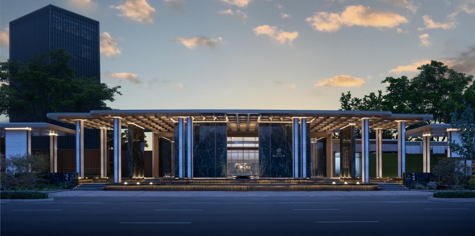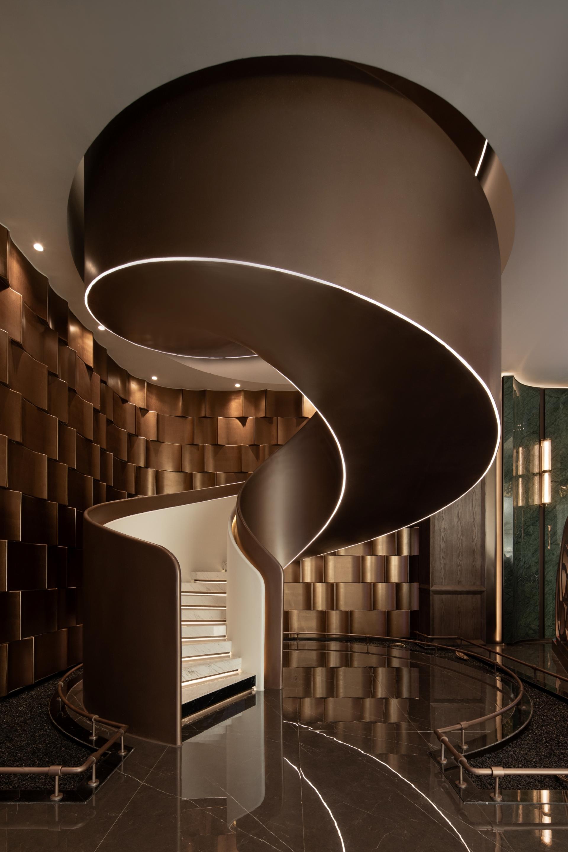 The sales center is conceived around the theme “Plucking Osmanthus in the Moonlight,” creating a premium space that merges top-tier school-district cachet with artistic luxury. At the entry, a brass Pegasus and gold-leaf screen set a stately tone, while a sculptural stair clad in dragon-scale panels delivers a dramatic focal point. A central bar and lounge weave osmanthus motifs throughout; a crystal chandelier crowns the illuminated scale model. Programmatic layers include a star-lit screening room, tearoom, and art-infused fitness zone. An art corridor employs copper-thread installations to narrate Shijia-zhuang’s architectural past and present. The entire environment un-folds as a “one bloom, one moment” spatial story, satisfying sophis-ticated clients’ needs for socializing, leisure, and culture—an opu-lent expression of modern Eastern aesthetics.