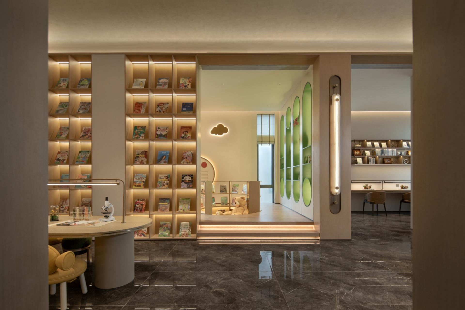 The clubhouse pairs a “Learning Cube” with a “Parent Lounge.” The Learning Cube divides into four age-specific zones furnished with er-gonomic pieces and adaptive lighting. The Parent Lounge offers a fire-side tea corner and casual bar, allowing adults to socialize while re-maining close at hand—education and companionship in perfect harmony.