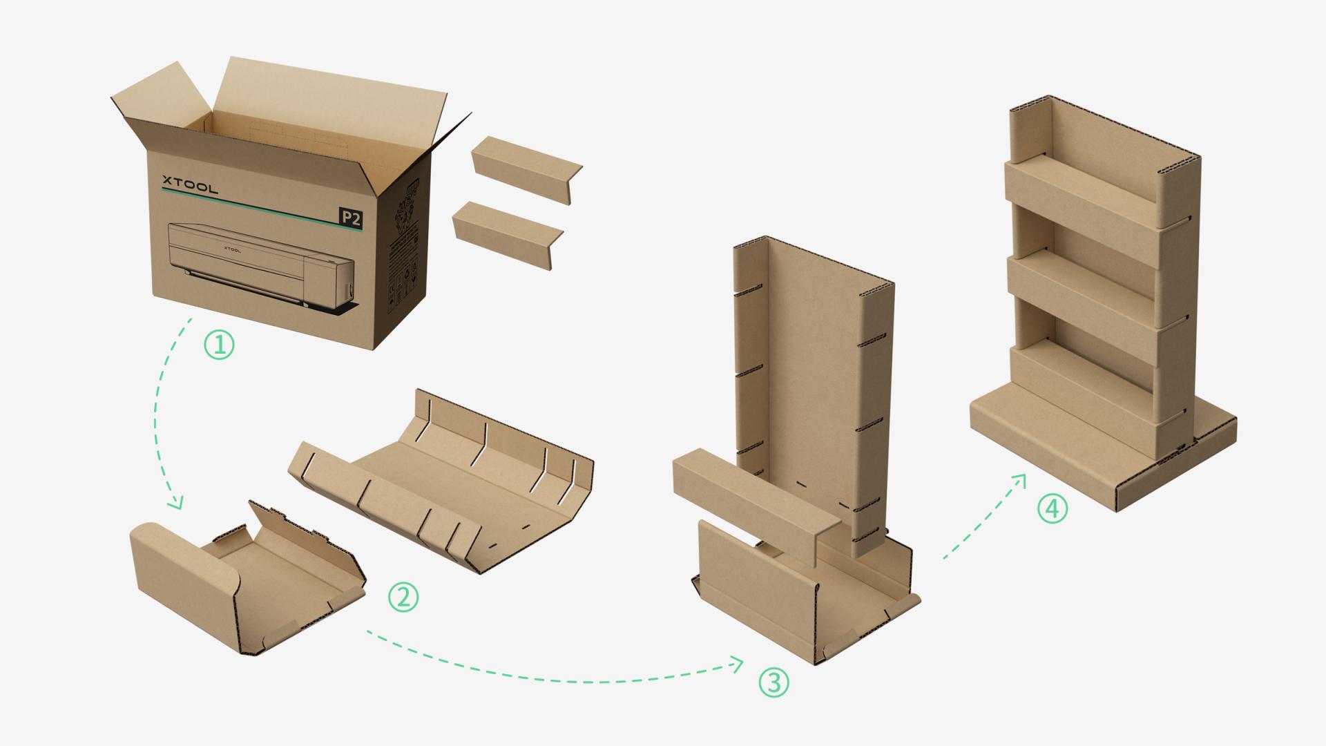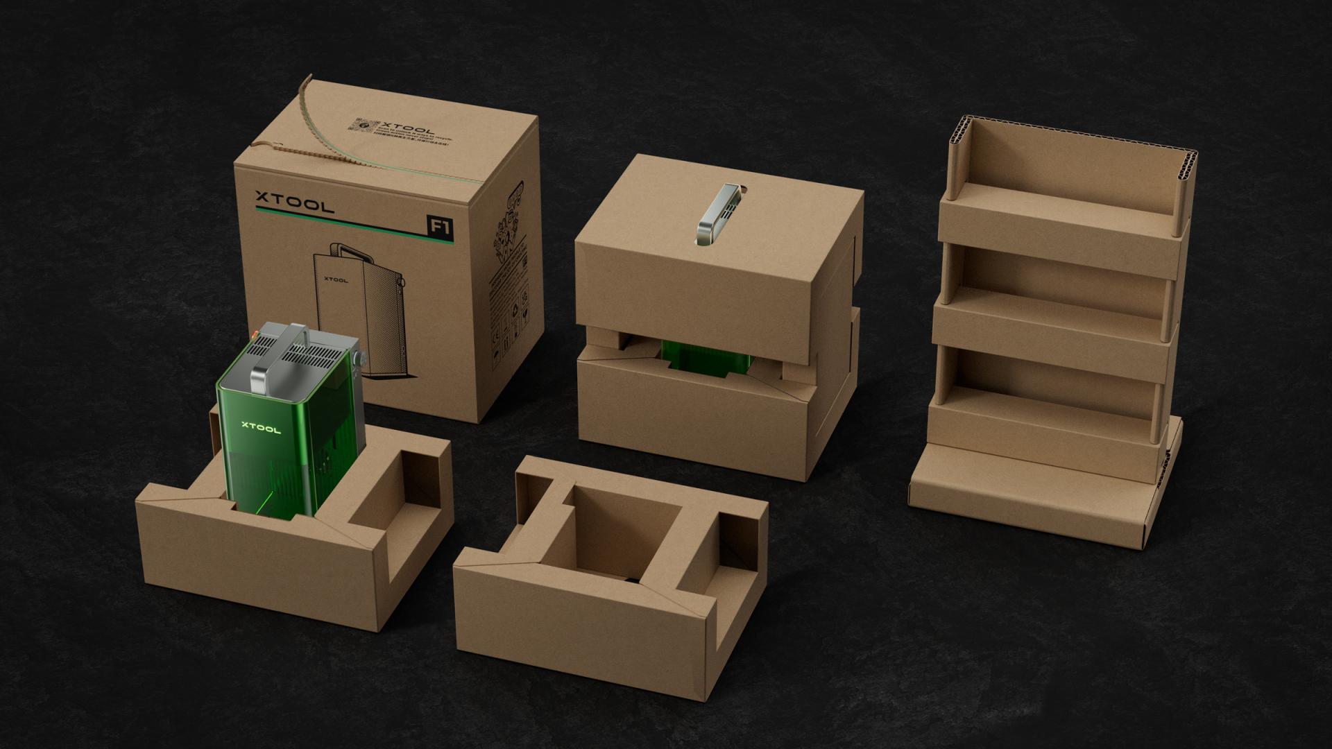 In the laser tools industry, where single-use packaging has long been the norm, xTool’s sustainable packaging system offers an innovative solution, redefining the industrial packaging value chain with a fully paper-based circular system. Breaking away from the traditional "protect-and-discard" linear approach, xTool introduces a transformative, communicative, and scalable sustainable solution: a 100% recyclable corrugated paper structure integrated with pre-embedded folding half-cut lines and assembled corner guards. This design empowers users to convert shipping boxes into DIY displays effortlessly, standing for showcasing crafts created using xTool machines, enabling a three-stage evolution in the packaging lifecycle—from transportation protection to commercial display, and ultimately serving as raw materials for creative projects.