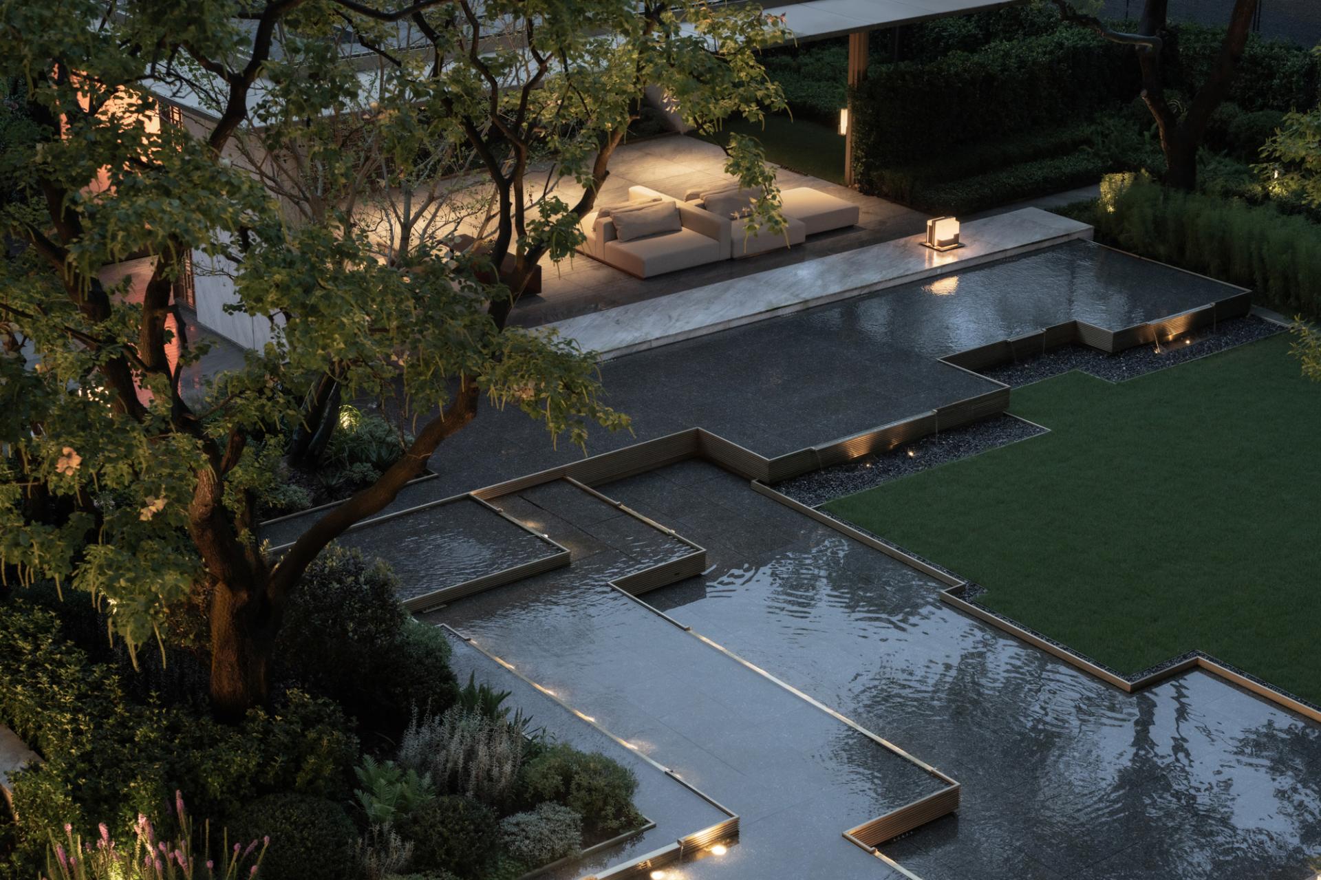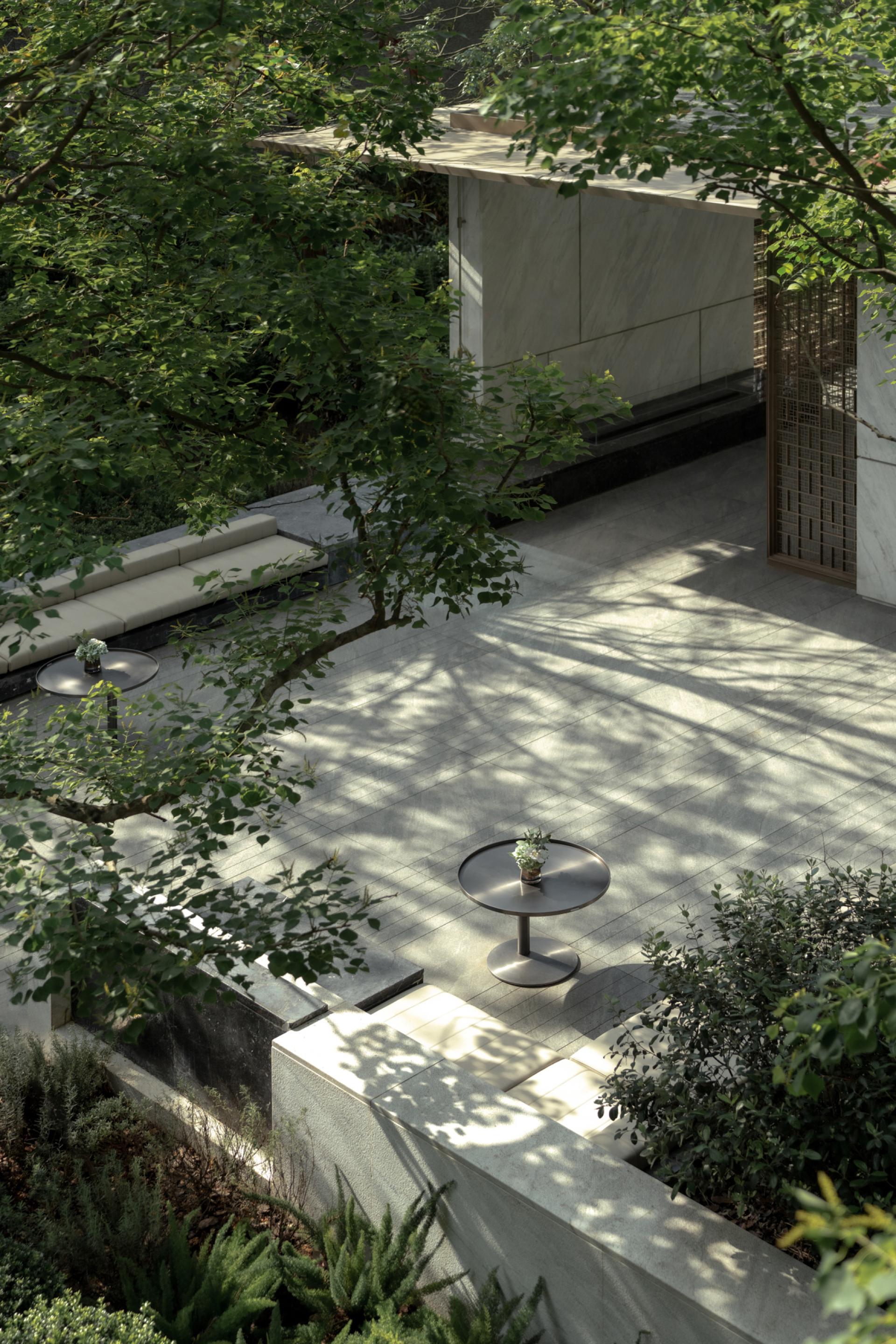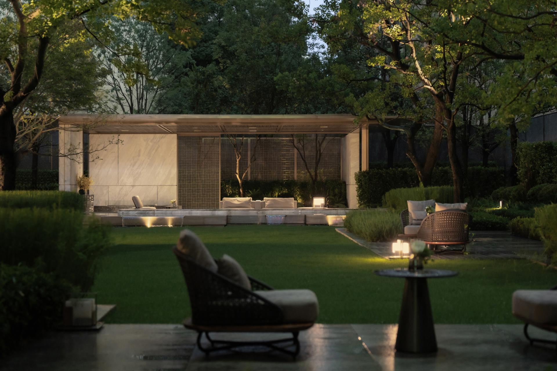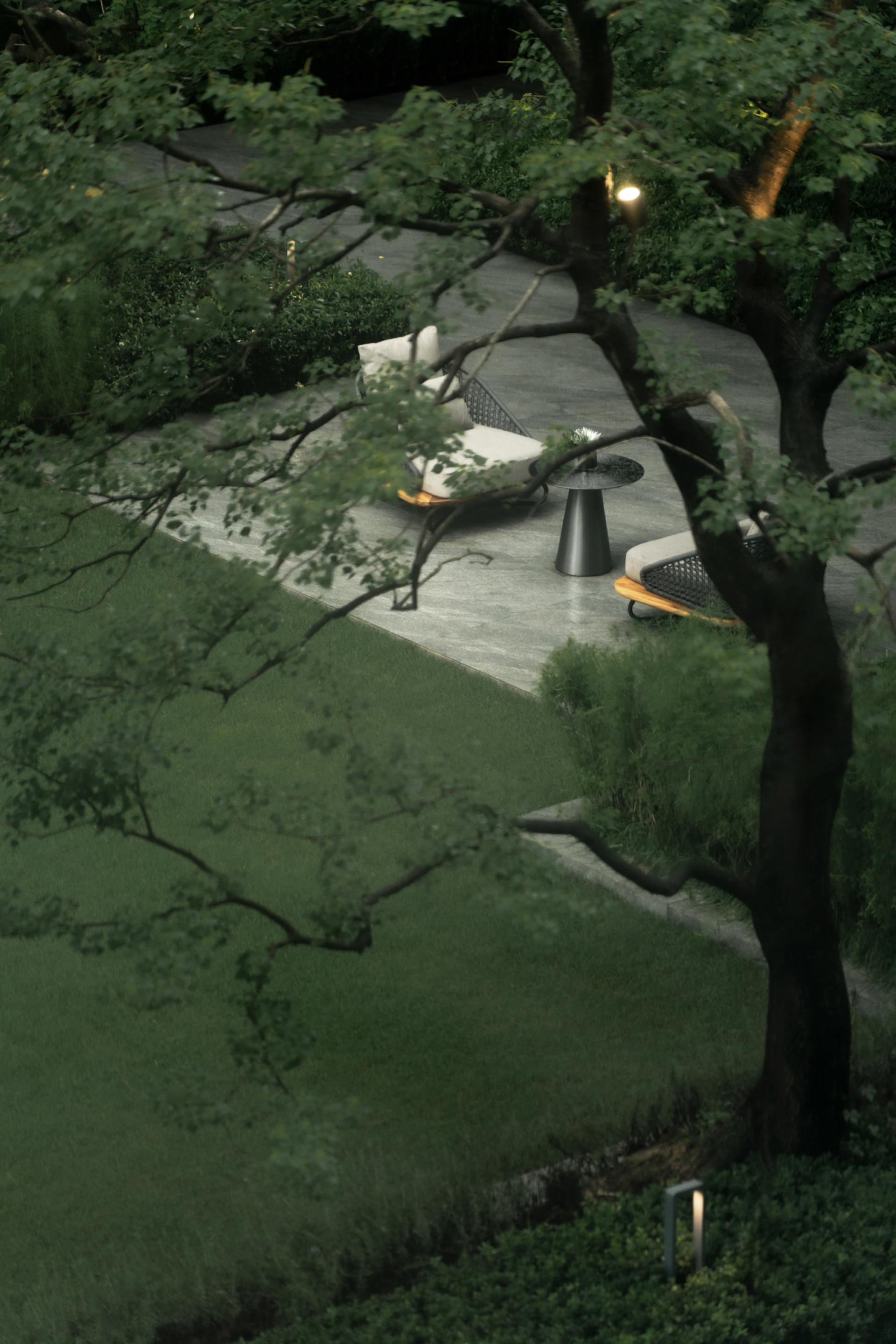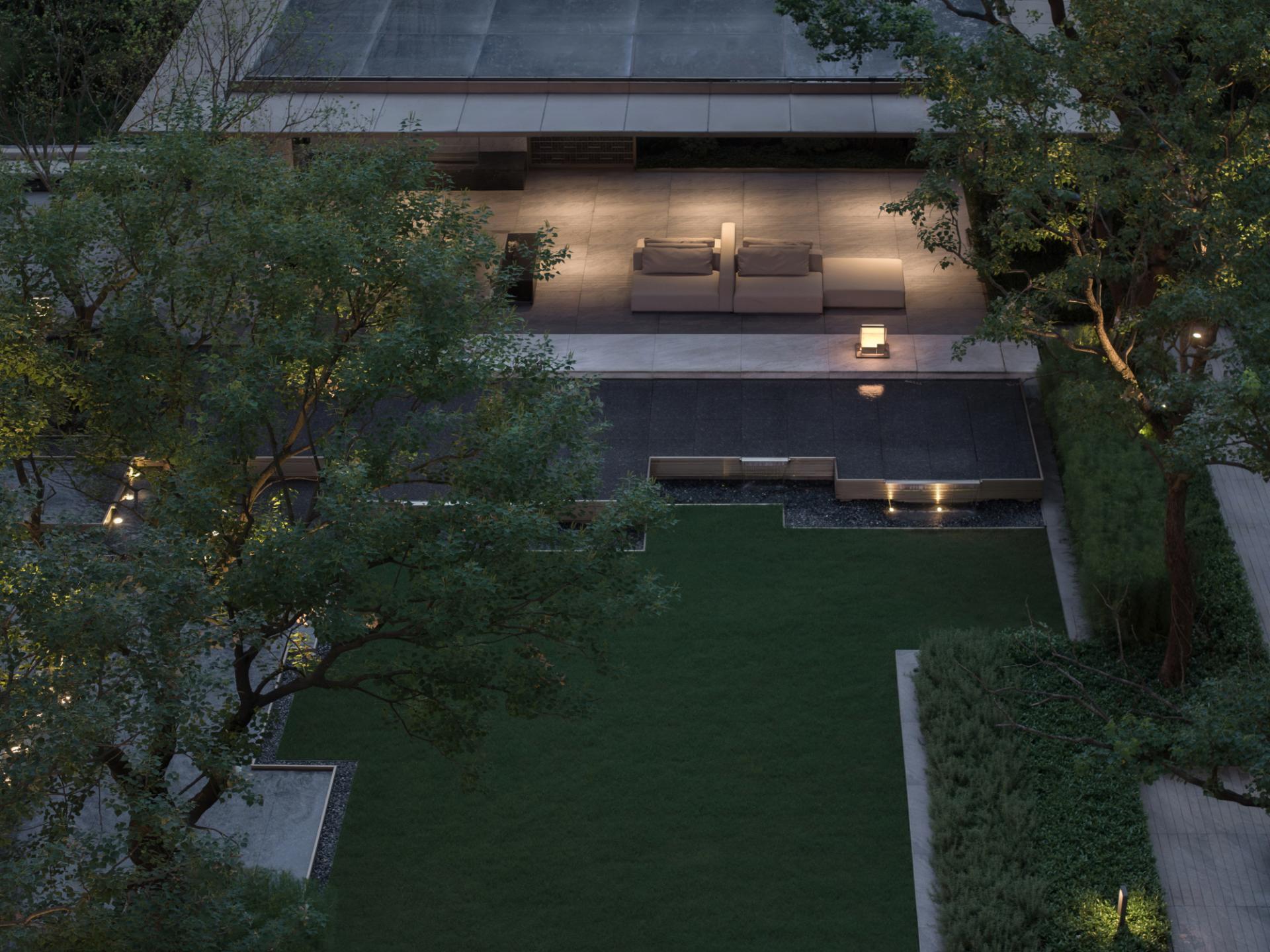 The resort-inspired courtyard garden offers tranquility with its still water reflecting the surrounding trees, creating a serene, luxurious atmosphere. The simple yet refined design enhances the sense of prestige and calm. Curved lines and smooth transitions emphasize a pursuit of quality, while the layout reinforces the connection between the landscape and the space. At the end of the central axis, a lounge area serves as a dynamic venue for social interaction.